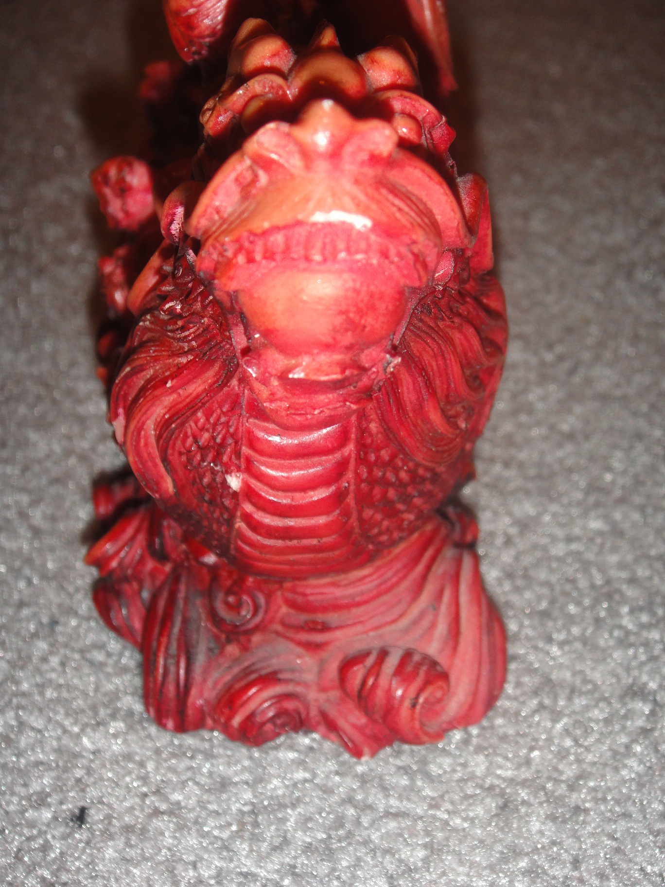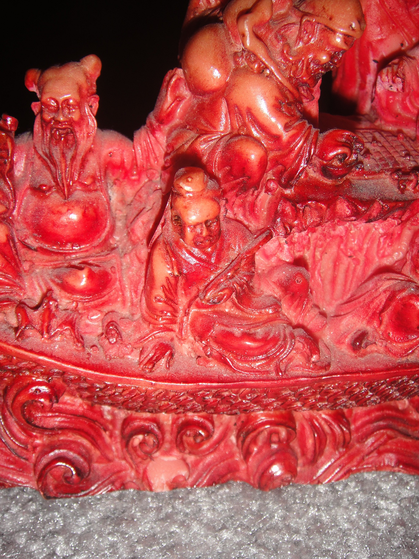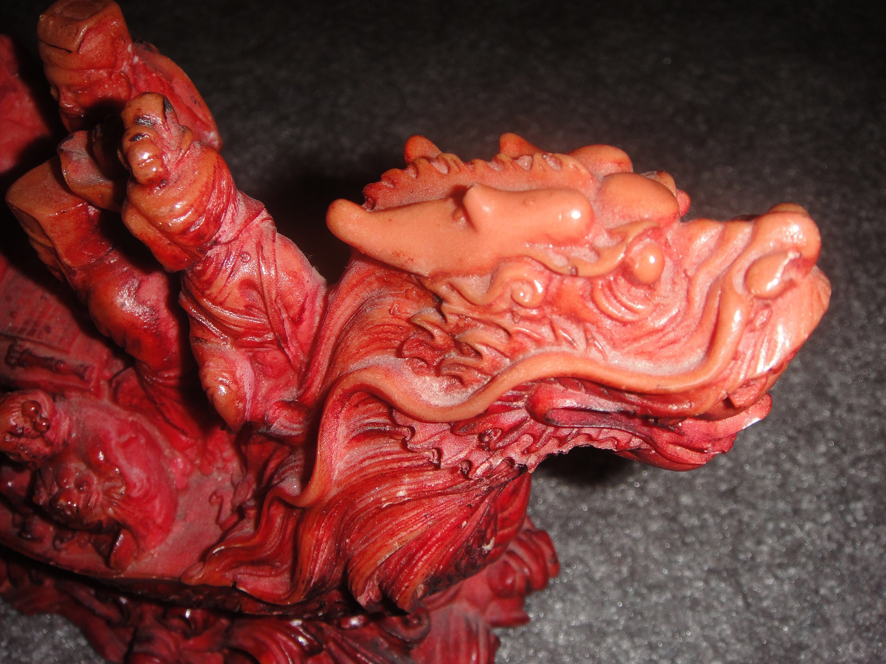 The carving is very detailed and appears to be fine crafsmanship. The object has been stained with red dye.
