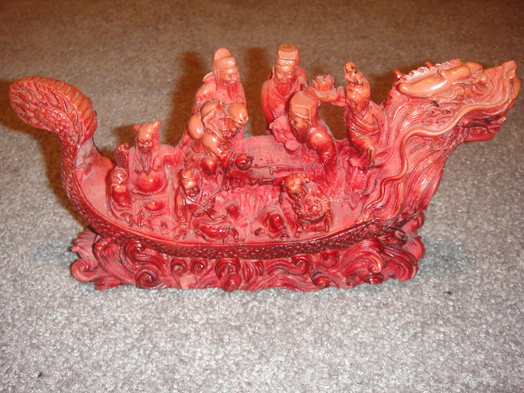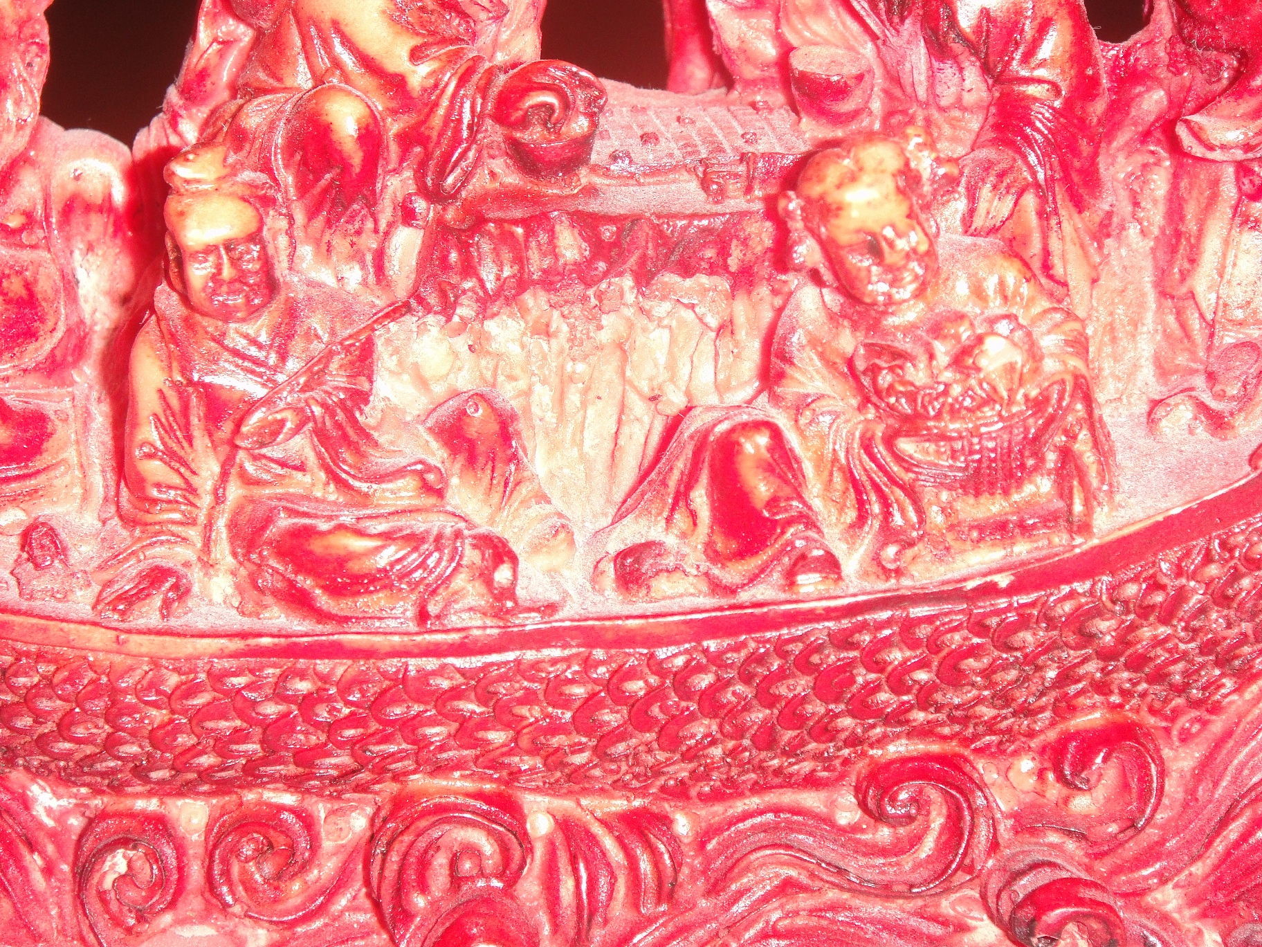 This is a scene carved on a dragon. There are eight figures on the dragon which appear to be "riding" the dragon like a boat. Two figures are sitting down playing a game on a checkered board. Three figures are standing behind the men onlooking. There is a figure positioned toward the back of the dragon sitting down holding some sort of object (possibly a musical instrument/harp) along with two additional figures sitting down positioned in front of the men playing the game. These figures also appear to be holding objects as well.