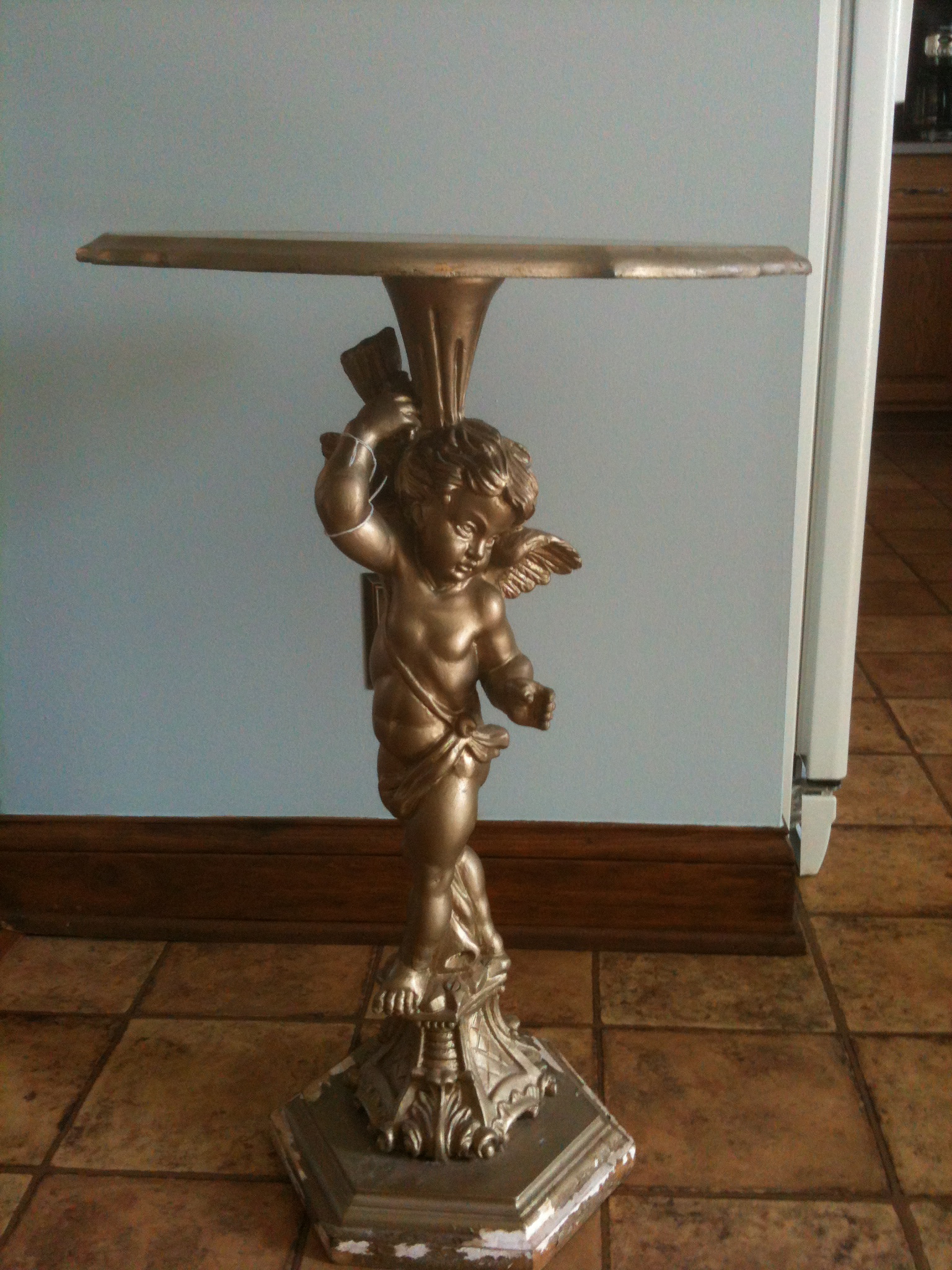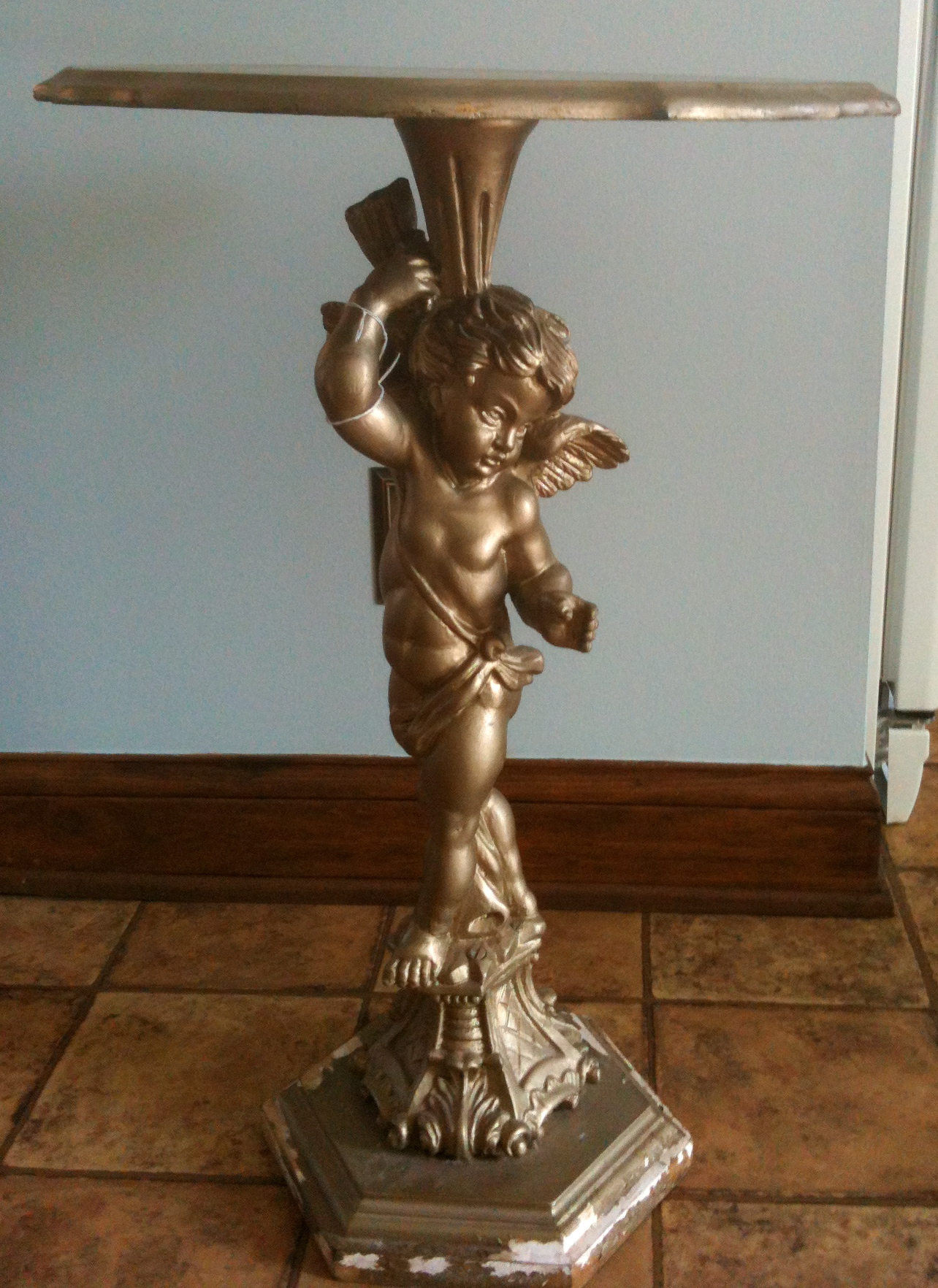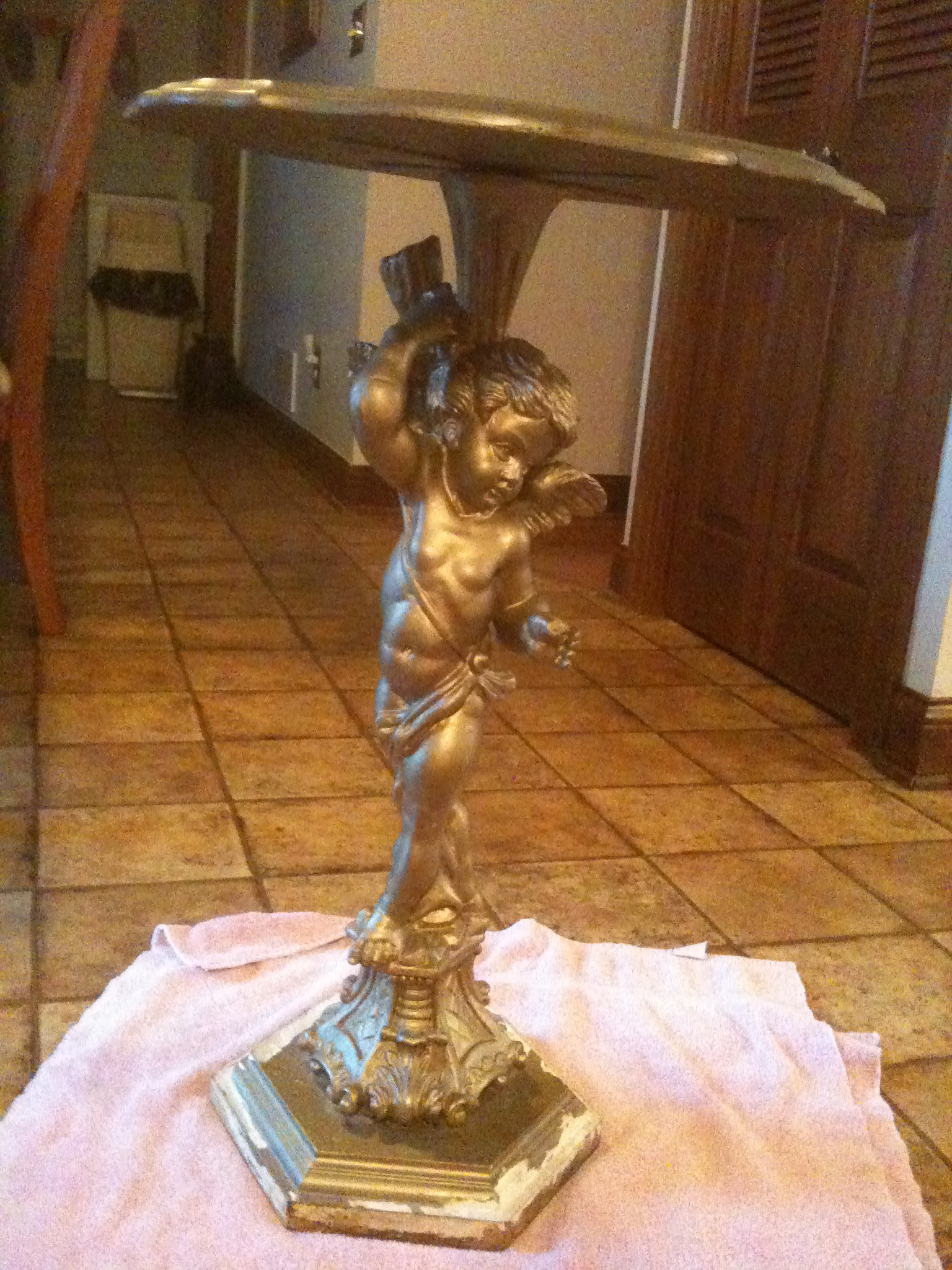 This is carved wood. I don't know what type of wood that it is. The top is some type of wood that sounds hollow when you knock on it. Most all of it was originally covered in gesso and gold leaf. Unfortunately, someone painted over it with gold paint. However, some of that paint is coming off and I can see the former gesso and gold leaf underneath. There is also some evidence of some other color on it in some places that appears to be possibly a blue/gray color. Otherwise it is in good condition. It is old but I don't know how old. I believe it could be Italian or French and possibly from the late 1800s. I do not know if it is an original or a reproduction. I don't know how to tell either. It is a Cupid with wings and a quiver of arrows on its back. It does not have a bow. It has a garment over its groin area and running down between its legs extending down between its feet. It is four pieces - a top attached to the Cupid which is then attached to a stand and that stand attached to the bottom base. There is currently an item on eBay that looks almost exactly like it with all four pieces together, which makes me believe that it was originally made that way. I have researched and can't find any other item just like on the internet or in books. It does have some cracks in the wood near the bottom of the legs that appears to be from age.