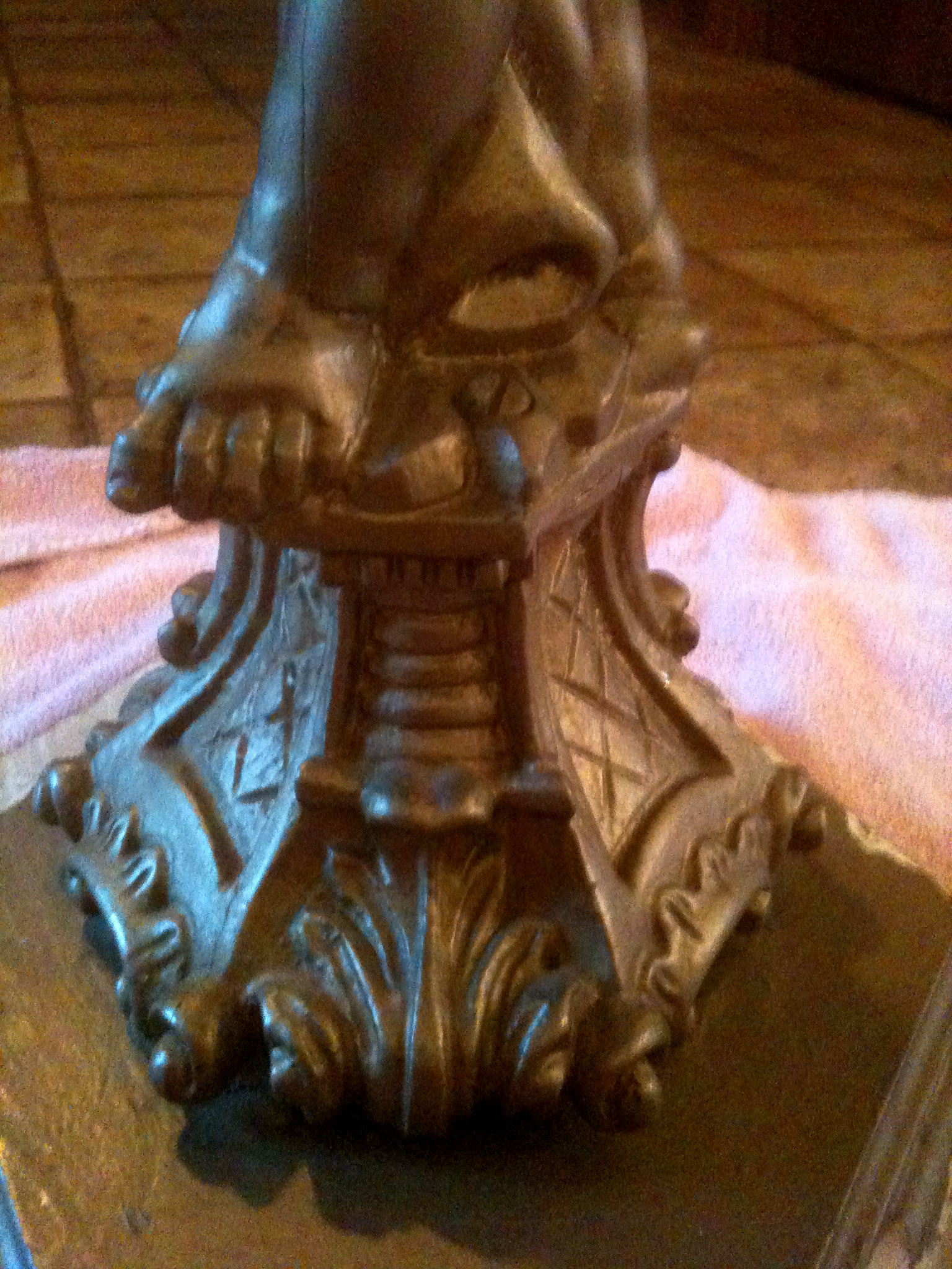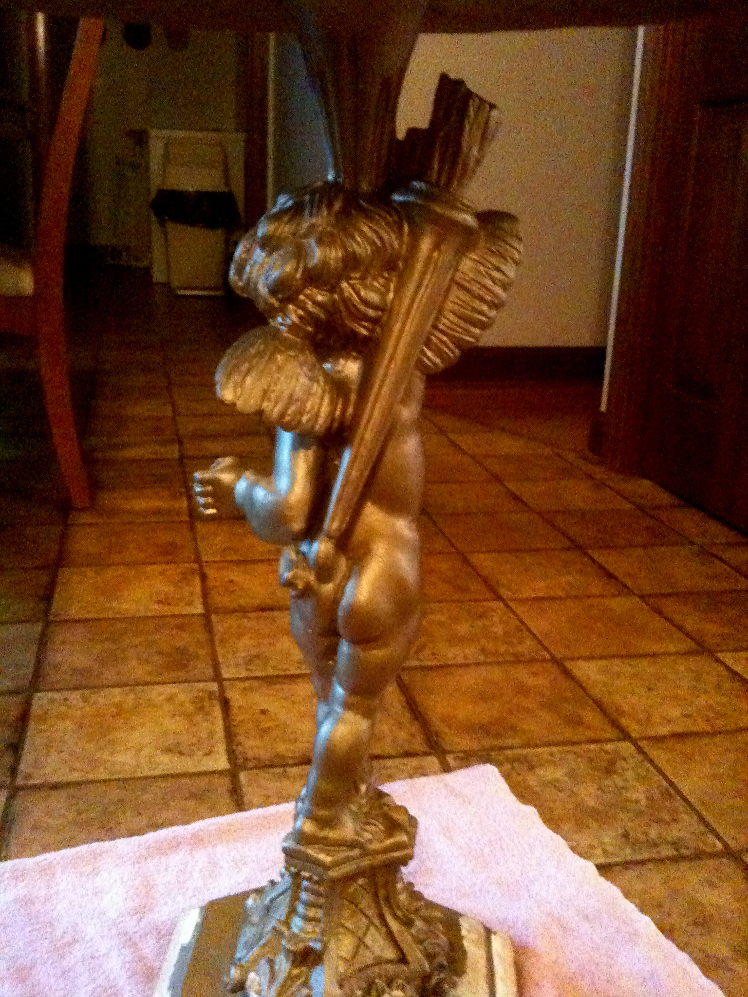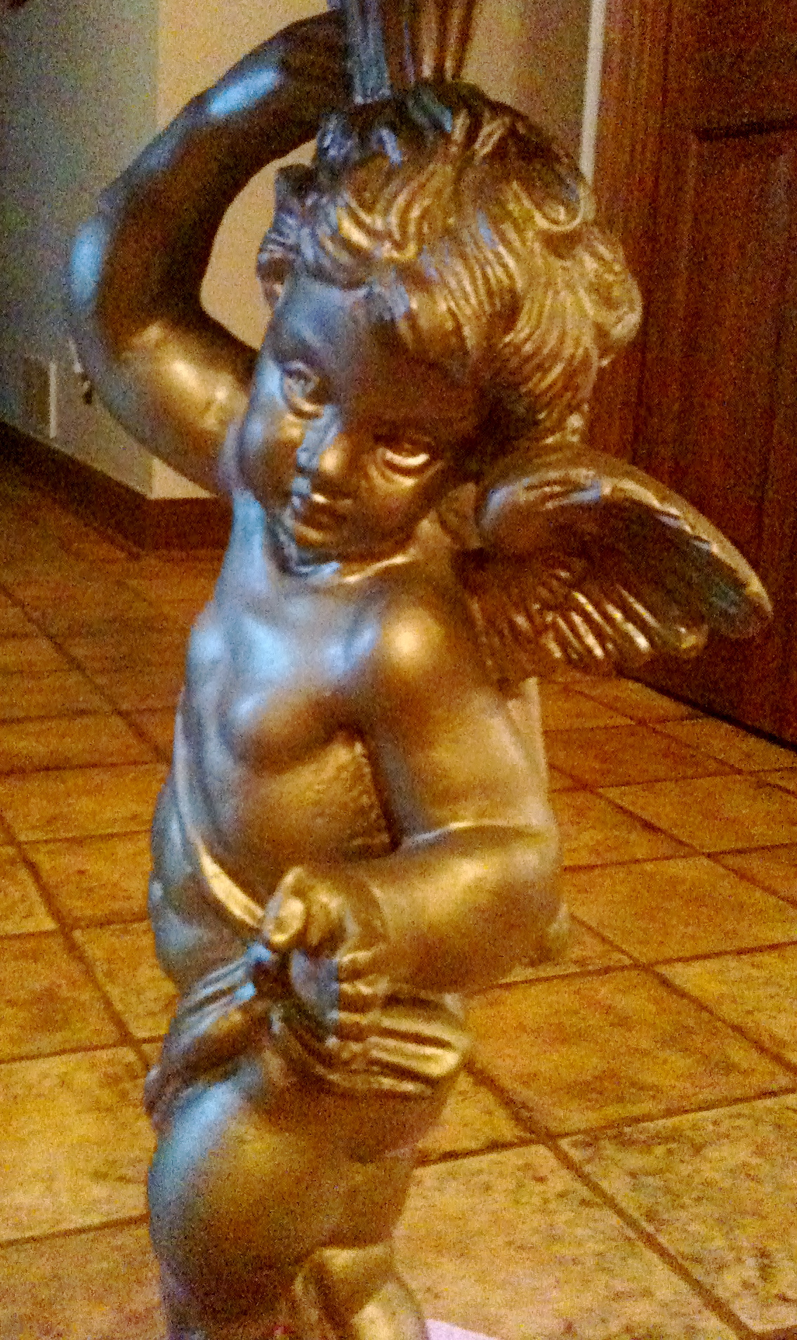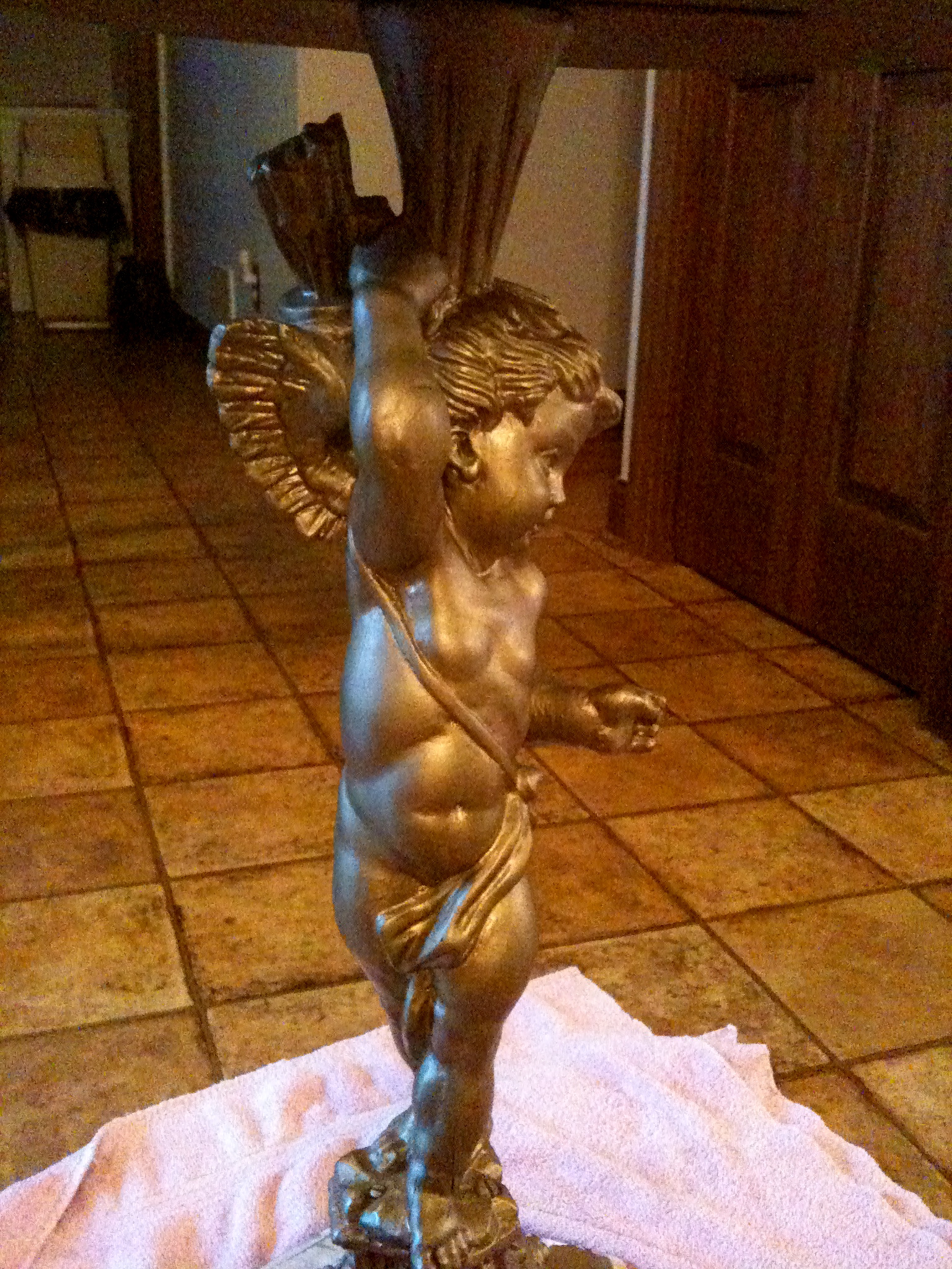This is carved wood. I don't know what type of wood that it is. The top is some type of wood that sounds hollow when you knock on it. Most all of it was originally covered in gesso and gold leaf. Unfortunately, someone painted over it with gold paint. However, some of that paint is coming off and I can see the former gesso and gold leaf underneath. There is also some evidence of some other color on it in some places that appears to be possibly a blue/gray color. Otherwise it is in good condition. It is old but I don't know how old. I believe it could be Italian or French and possibly from the late 1800s. I do not know if it is an original or a reproduction. I don't know how to tell either. It is a Cupid with wings and a quiver of arrows on its back. It does not have a bow. It has a garment over its groin area and running down between its legs extending down between its feet. It is four pieces - a top attached to the Cupid which is then attached to a stand and that stand attached to the bottom base. There is currently an item on eBay that looks almost exactly like it with all four pieces together, which makes me believe that it was originally made that way. I have researched and can't find any other item just like on the internet or in books. It does have some cracks in the wood near the bottom of the legs that appears to be from age.