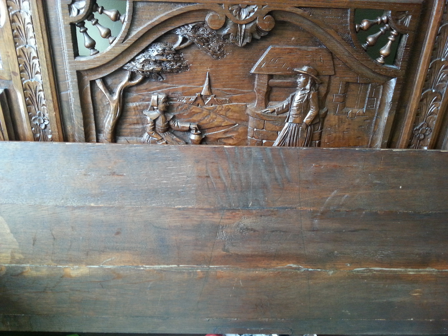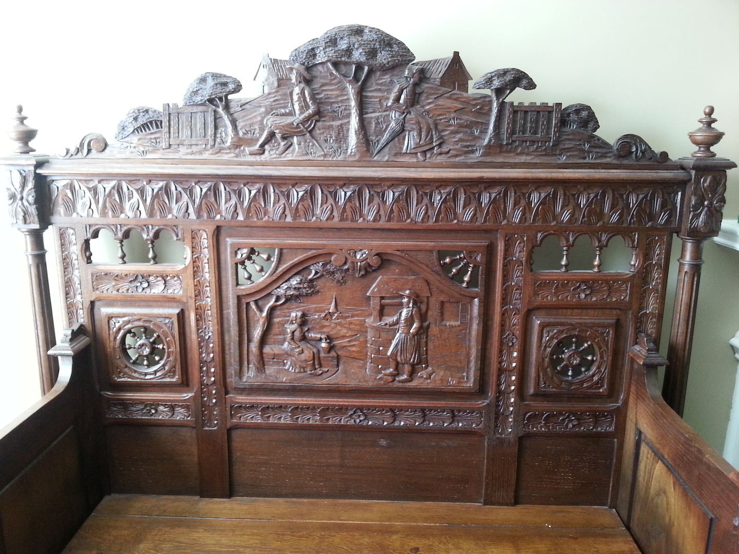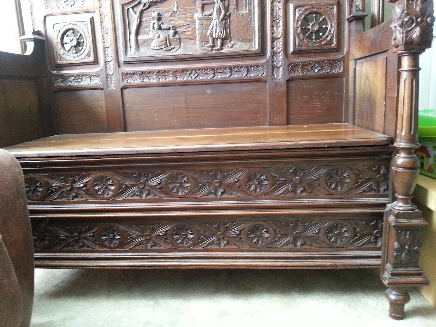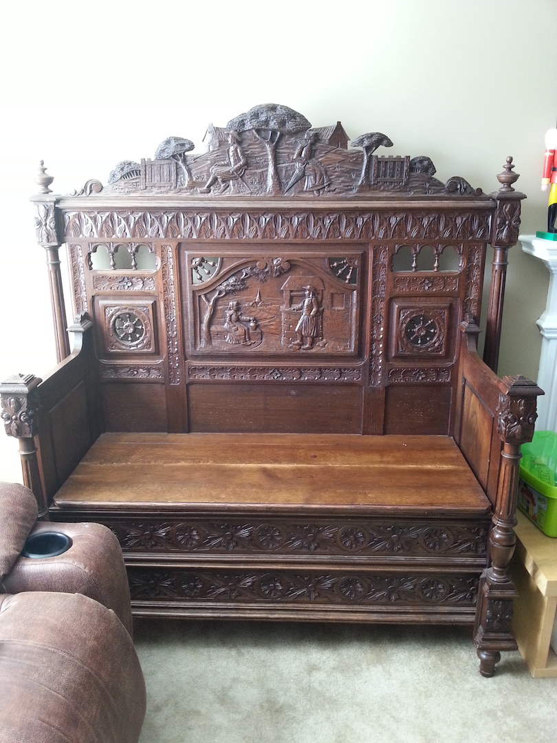 Have a similar bench that seat lifts for storage, c.1890, stamped 'Belgium' on back was helpful! Ours is a "French Gothic Hall Bench", with 4 panels, each with a carved figure. I have seen similar benches on interent sites asking in the $2,000-$3,000 range, what they actually have sold for, who knows, auctions are a crap shoot. I did have ours appraised through an internet firm based in England. Stated appraisal was only for $200-$300 based on the bottom having fallen out of antique furniture & only pieces getting high prices are those that are unique. Shocked me, but I read this as the death of the middle-class & discretionary spending, only the wealthy left buying. Value on furniture is 50-75% less than 10-15 yrs ago. Positive is that it is a buyer's market. Great piece you have & who cares what is 'in style'? I have mine in a ranch home, looks great, & is quite the conversation piece.