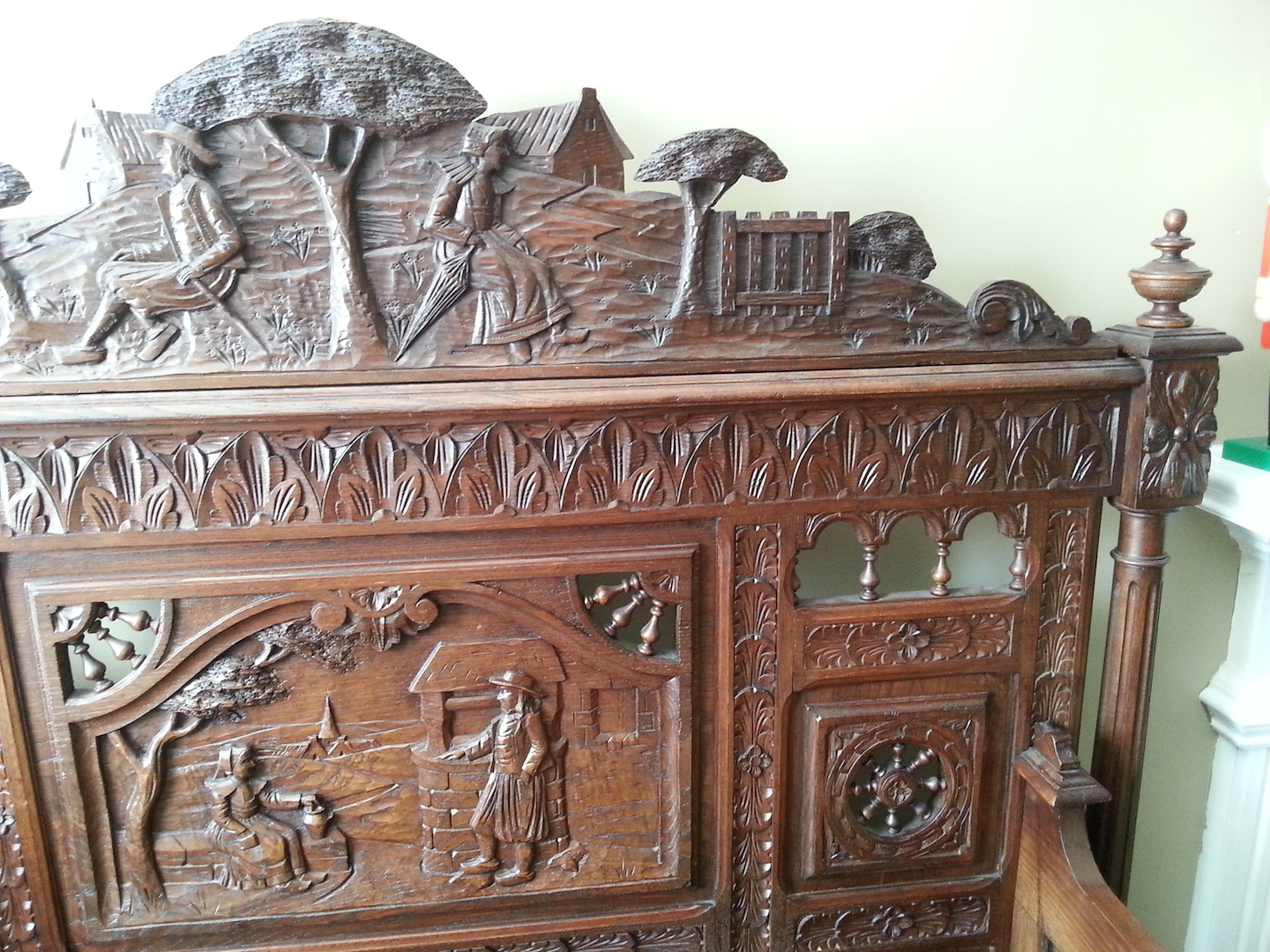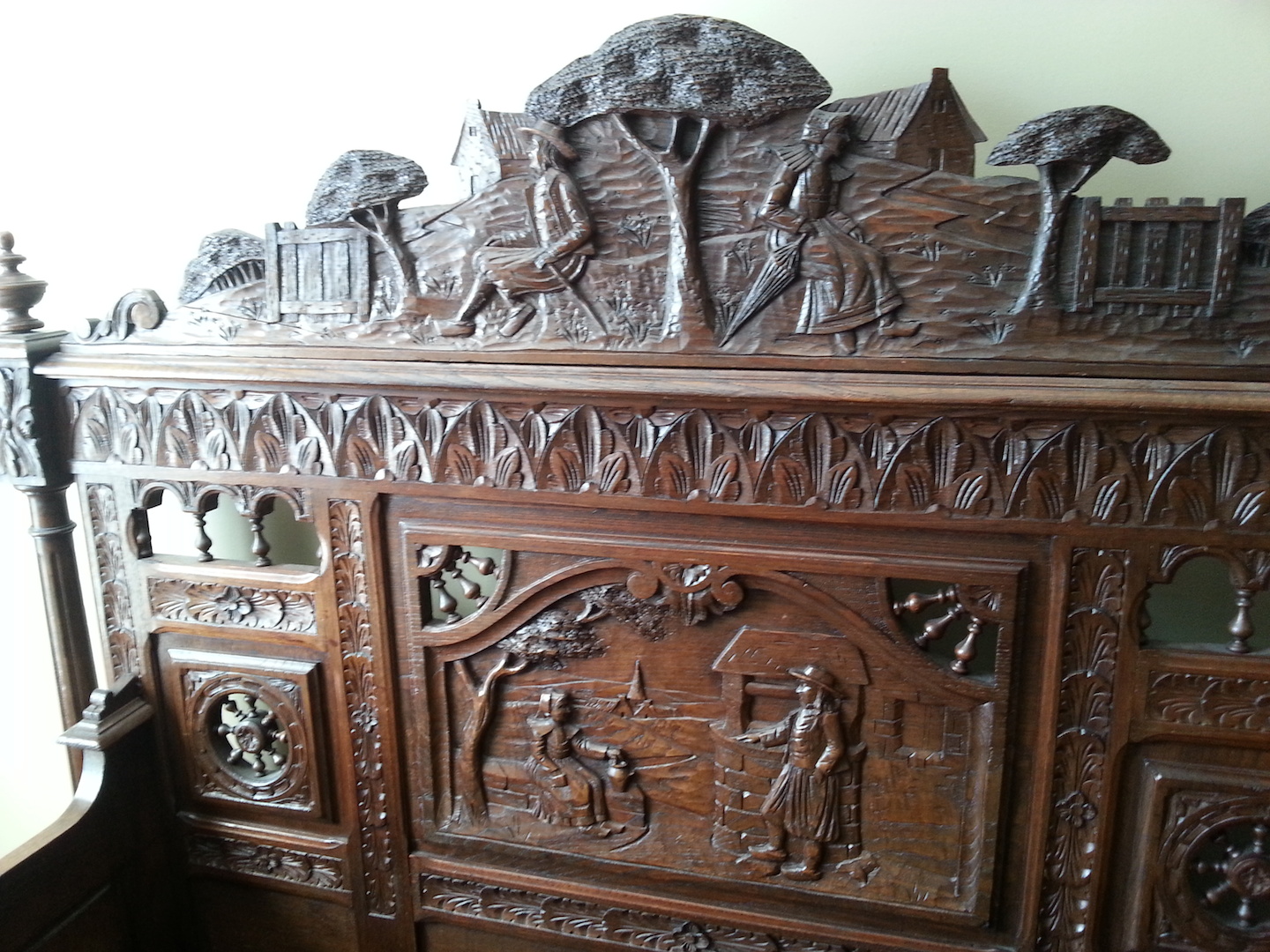 Pieces like this are in the "Gothic Revival Style" most were made in Belgium and Germany during the last quarter of the 19th Century. They look far older than they are because the Gothic style they copy dates back to the 12th -16th Centuries. Most were constructed out of oak and given a dark stained finish which further heightens the appearance of age. Not a huge demand for Gothic style these days, but one like this could go for close to $3000.00 at auction.