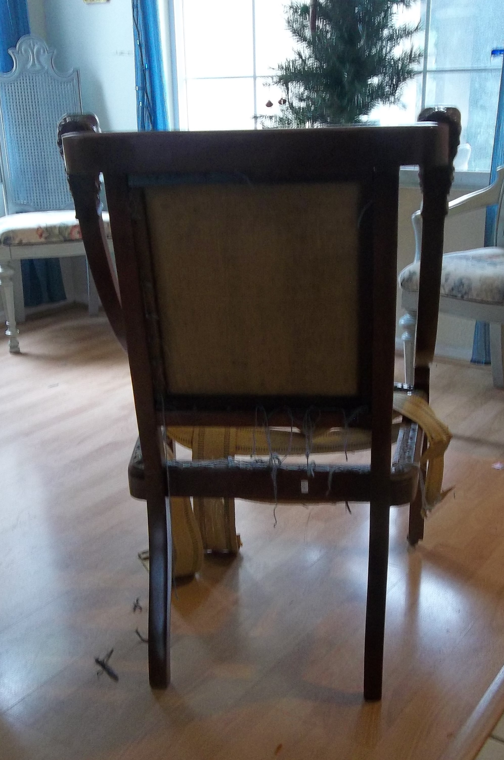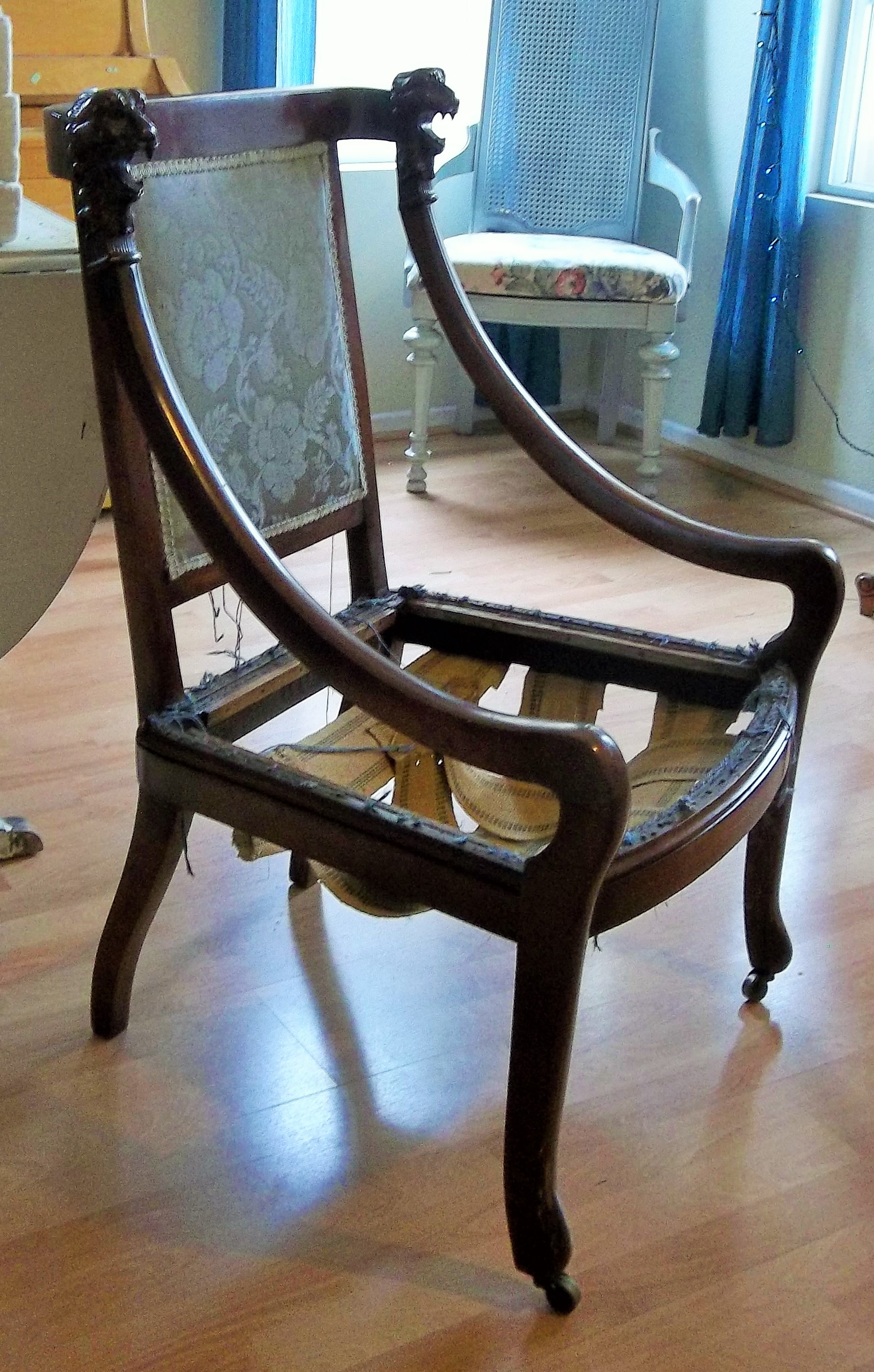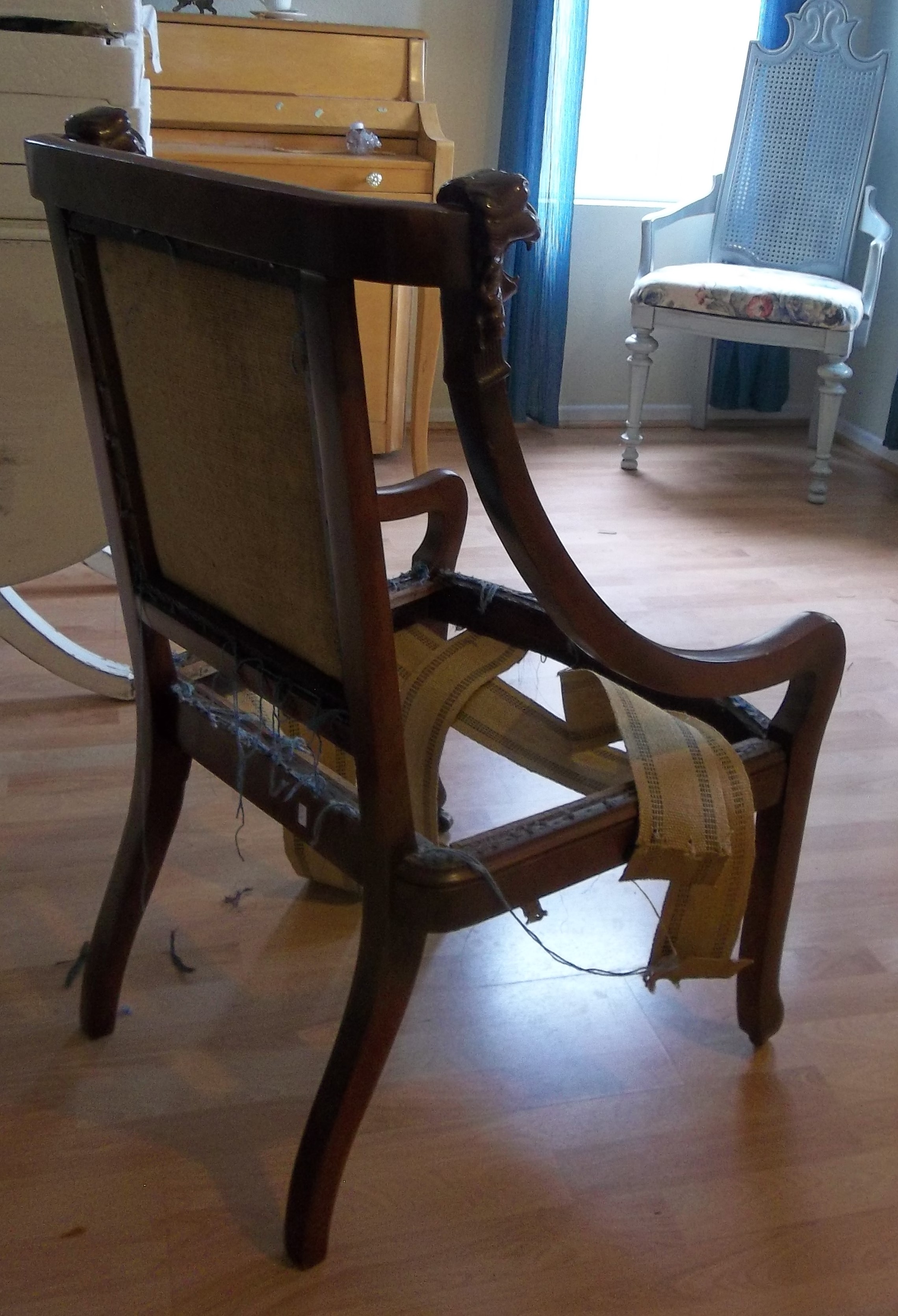 This chair has brass wheels on the front legs only, and looks as if it's been reupholstered several times with nails only, no staples. One of the pieces of wood on the inside of the seat is impressed with "LOUISVILLE KY" although I don't know if this is original to the chair or was added as reinforcement later. I can't find any nails or screws (other than tacks) to determine age. I would like to know what style this is called and possible age. The closest I could find visually was a chair called Kllismos, but it had no carvings. Any information on what type of chair this is, who made it, how old, anything would be great. There are numbers on the inside of the back of the seat.