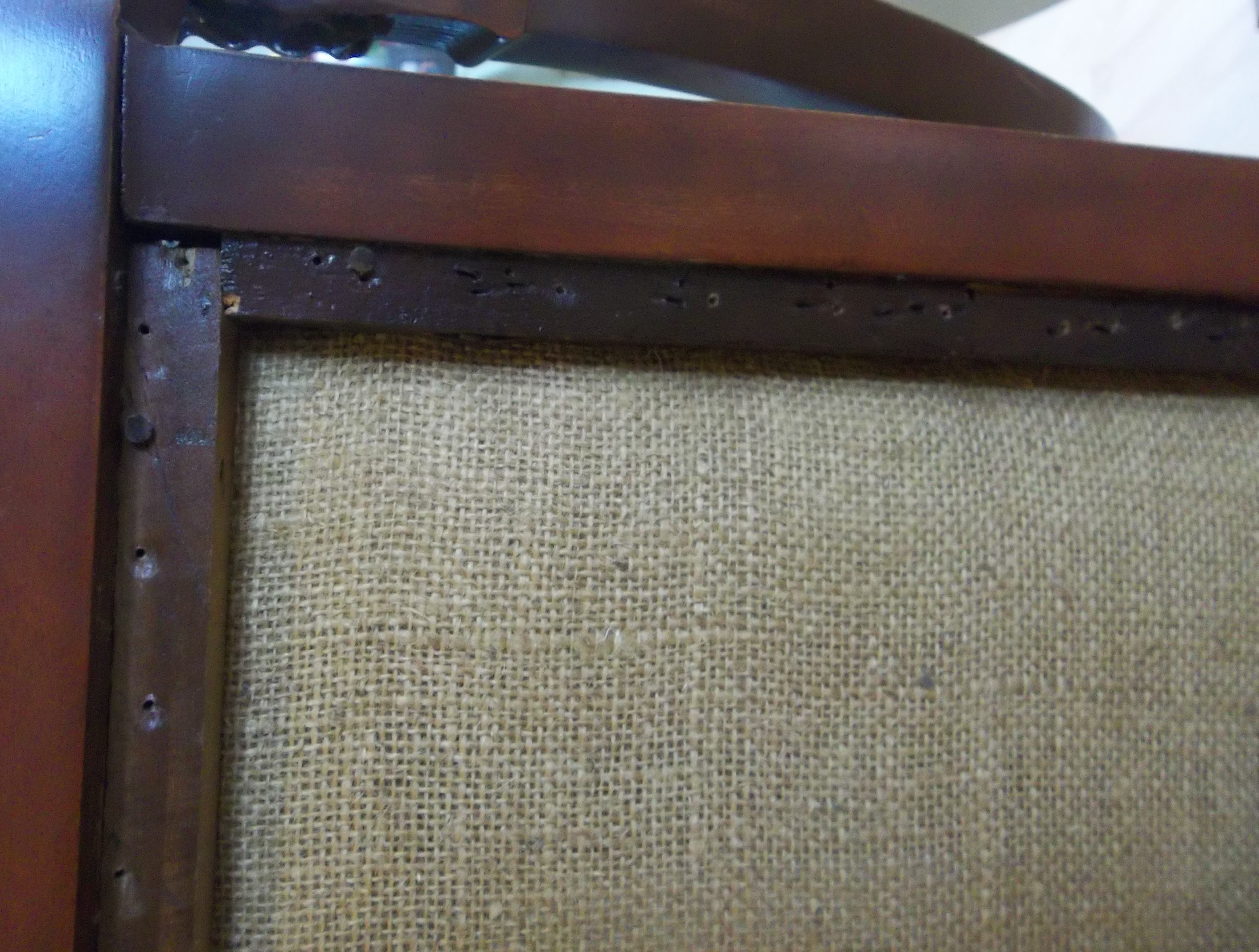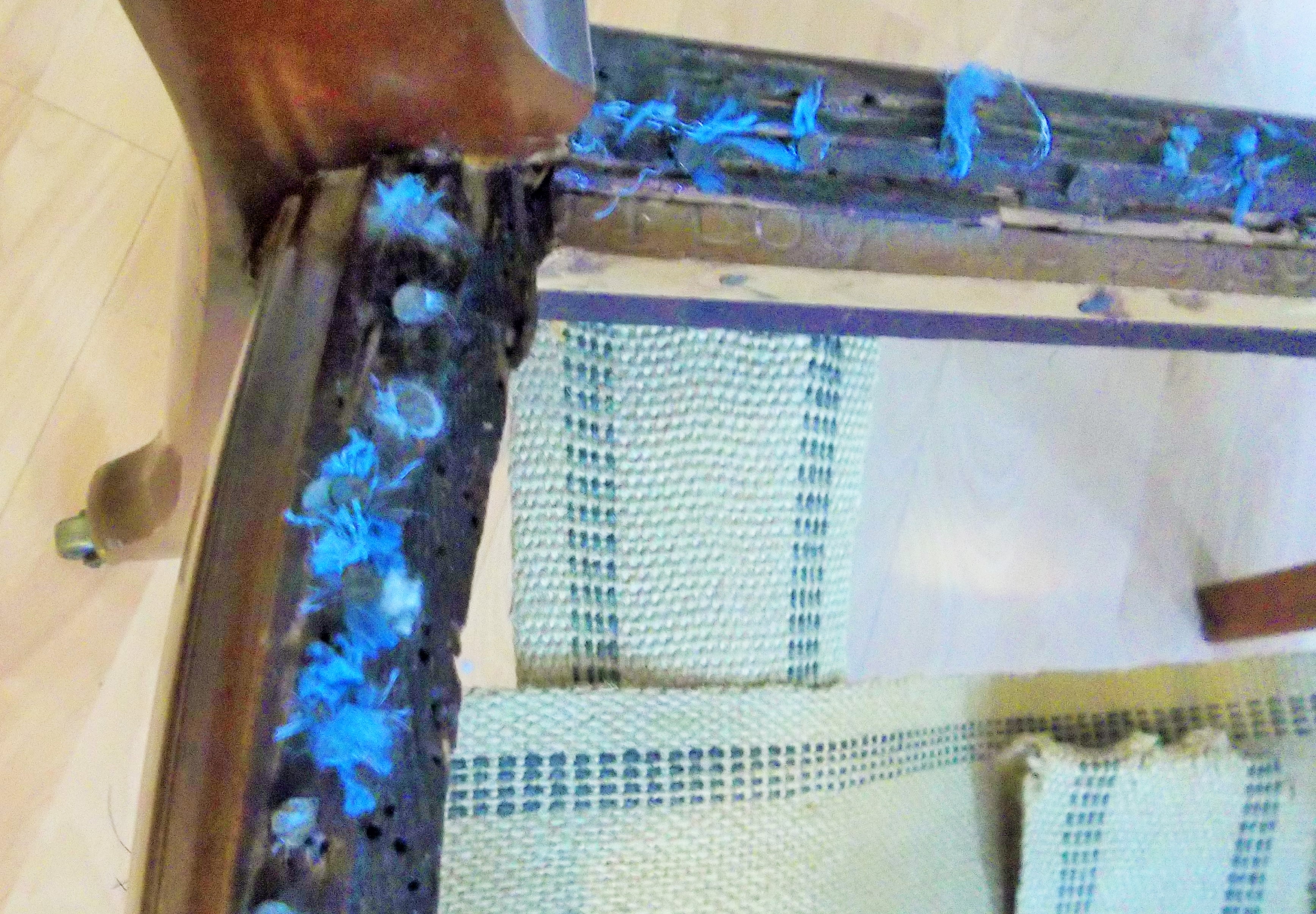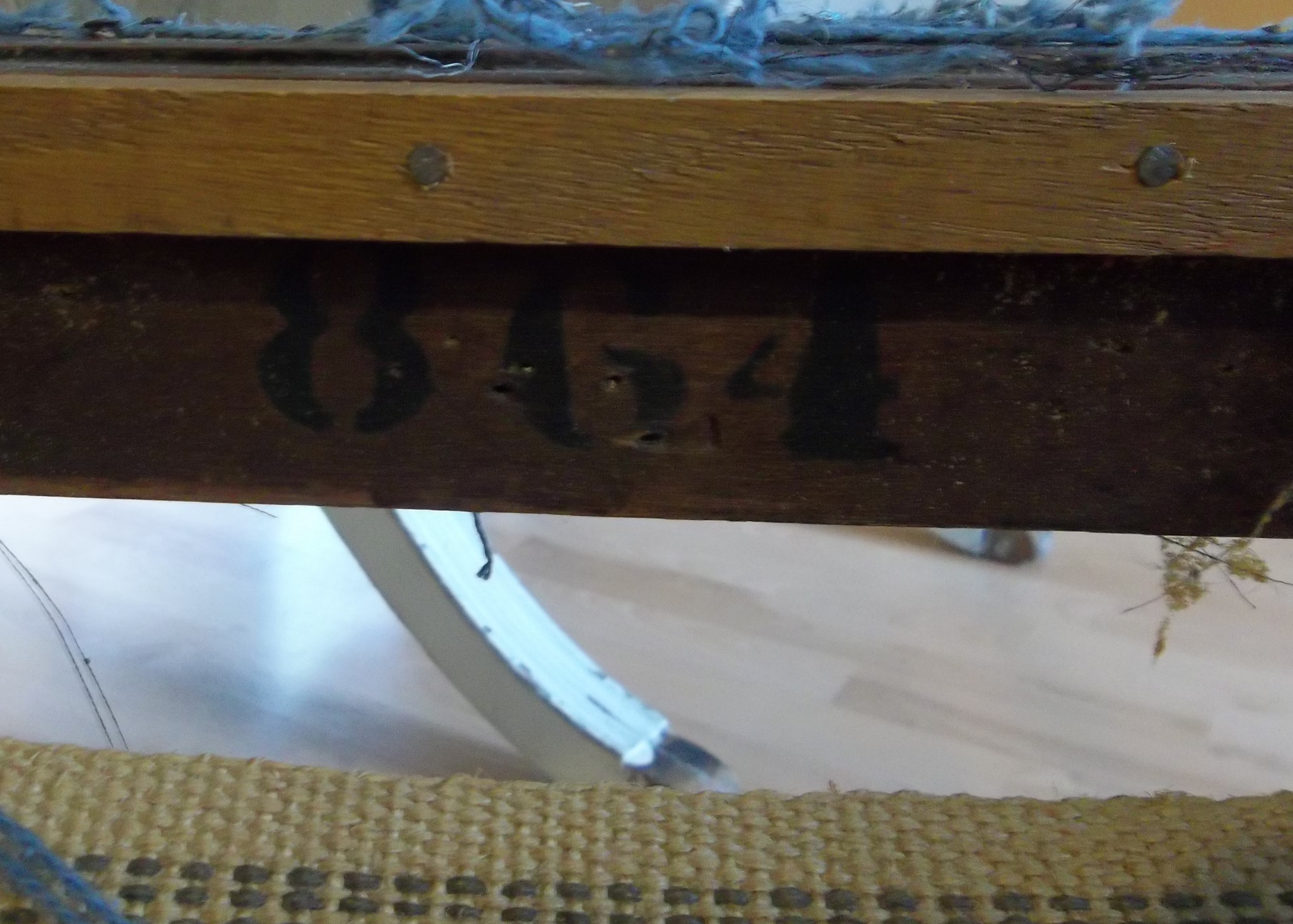 This chair has brass wheels on the front legs only, and looks as if it's been reupholstered several times with nails only, no staples. One of the pieces of wood on the inside of the seat is impressed with "LOUISVILLE KY" although I don't know if this is original to the chair or was added as reinforcement later. I can't find any nails or screws (other than tacks) to determine age. I would like to know what style this is called and possible age. The closest I could find visually was a chair called Kllismos, but it had no carvings. Any information on what type of chair this is, who made it, how old, anything would be great. There are numbers on the inside of the back of the seat.