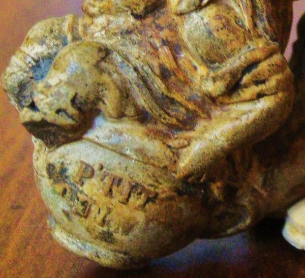 It was found under the floorboards (Shropshire UK) in very old building, in an ancient market town on the British/Welsh border. there is some carved writing in french still visible on right side. Says "P'Tit on the top row and underneath a word that ends with "DIN". On the left side you can see the final letters of a word on the top row that ends with "ION". The letters on the row underneath are too worn to identify clearly. Some paint is still remaining on the turban, face and where the feet where. They have broken off. It still has tobacco flakes in it.