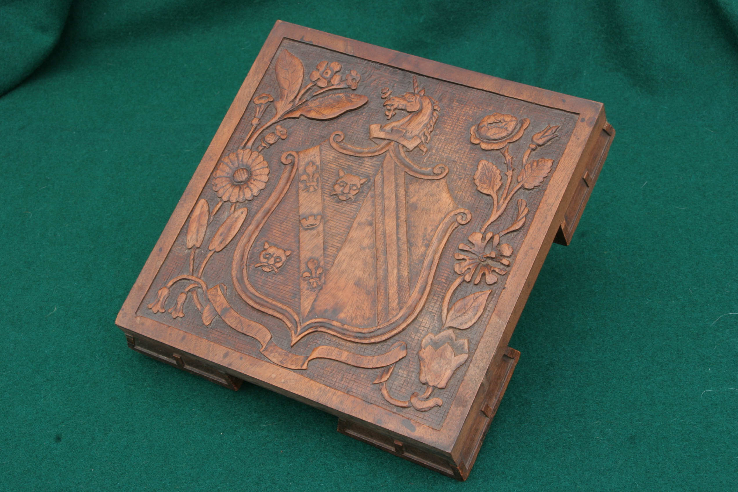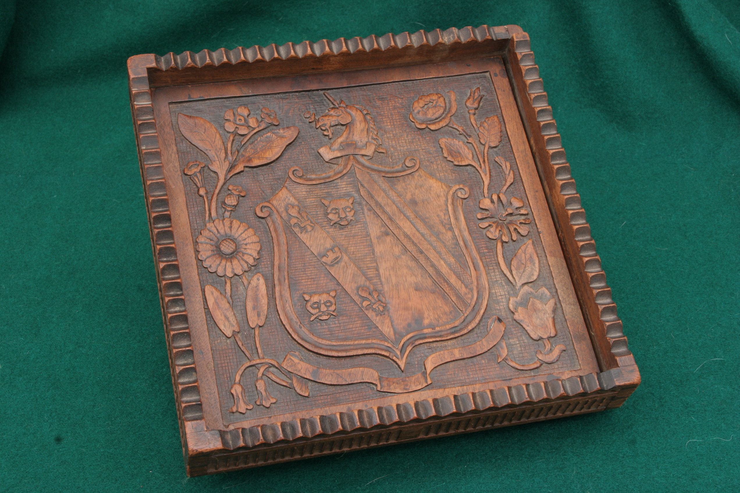 I have this piece which I am trying to find more about. It is a coat of arms carved onto a wooden tray with feet. I would love to know more about this piece and for what it was intended. There is a latin motto carved "Concordia Res Crescunt". The only thing I have managed to find out is it could be the coat of arms of the Bromhead family. Gonville Bromhead won a VC for his part in the defence of Rourkes Drift as depicted by Michael Caine in the film Zulu.