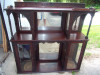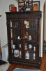 Carved steer horns w/ 2 carved brass capped horn containers on wood base with brass legs