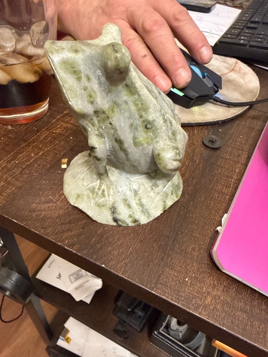 This is a carved stone sculpture depicting a frog. The material appears to be a type of green stone, possibly jade or serpentine, known for its smooth texture and natural color variations. The sculpture is approximately 6 inches tall and 4 inches wide, with a weight that suggests a dense stone material.