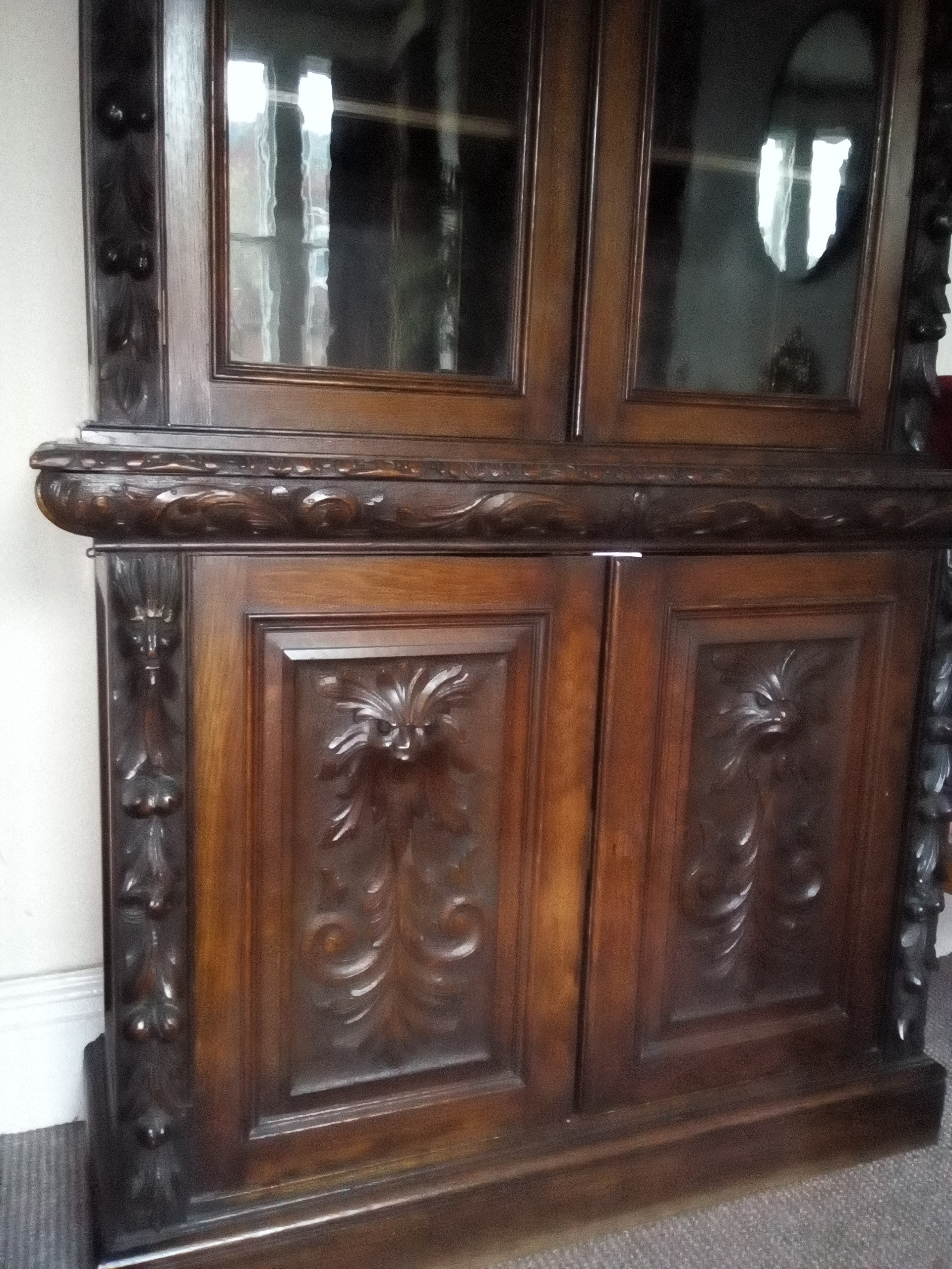 Tall elaborately carved oak Victorian bookcase, glass dors above, wooden doors below. Lions head carvings on bottom doors and on side uprights, also carved along top front and sides