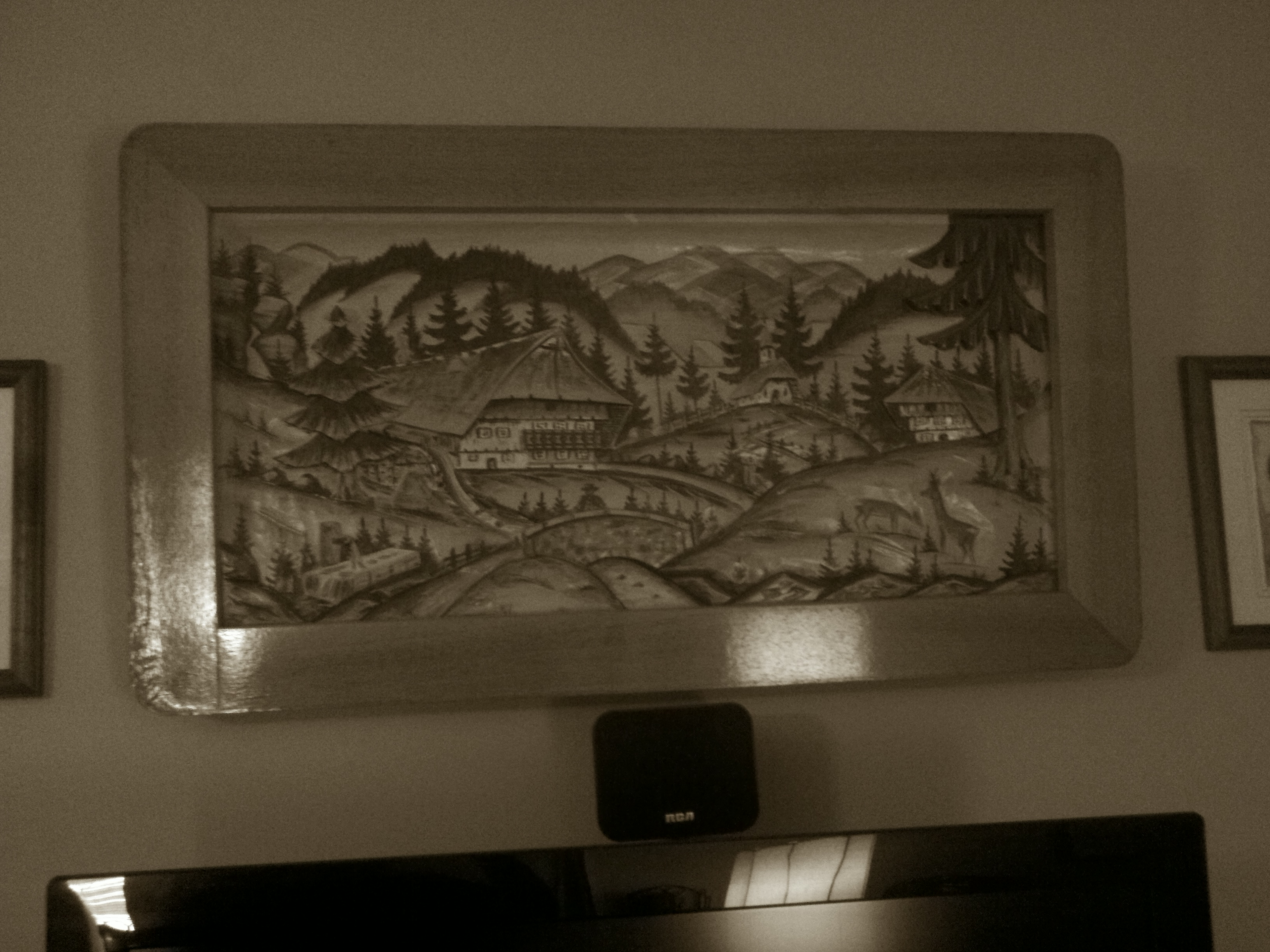 Large mural of houses maybe black forest... had 2 smaller side carvings that matched large one.