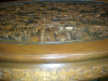 It has 2 carved lion (?) faces on either side, 4 carved "paws" at the base of the legs, copper pieces where the legs meet the table top, and 4 slim drawers (2 on either side). It stands 2 - 3 feet tall and is about 3 feet in length.