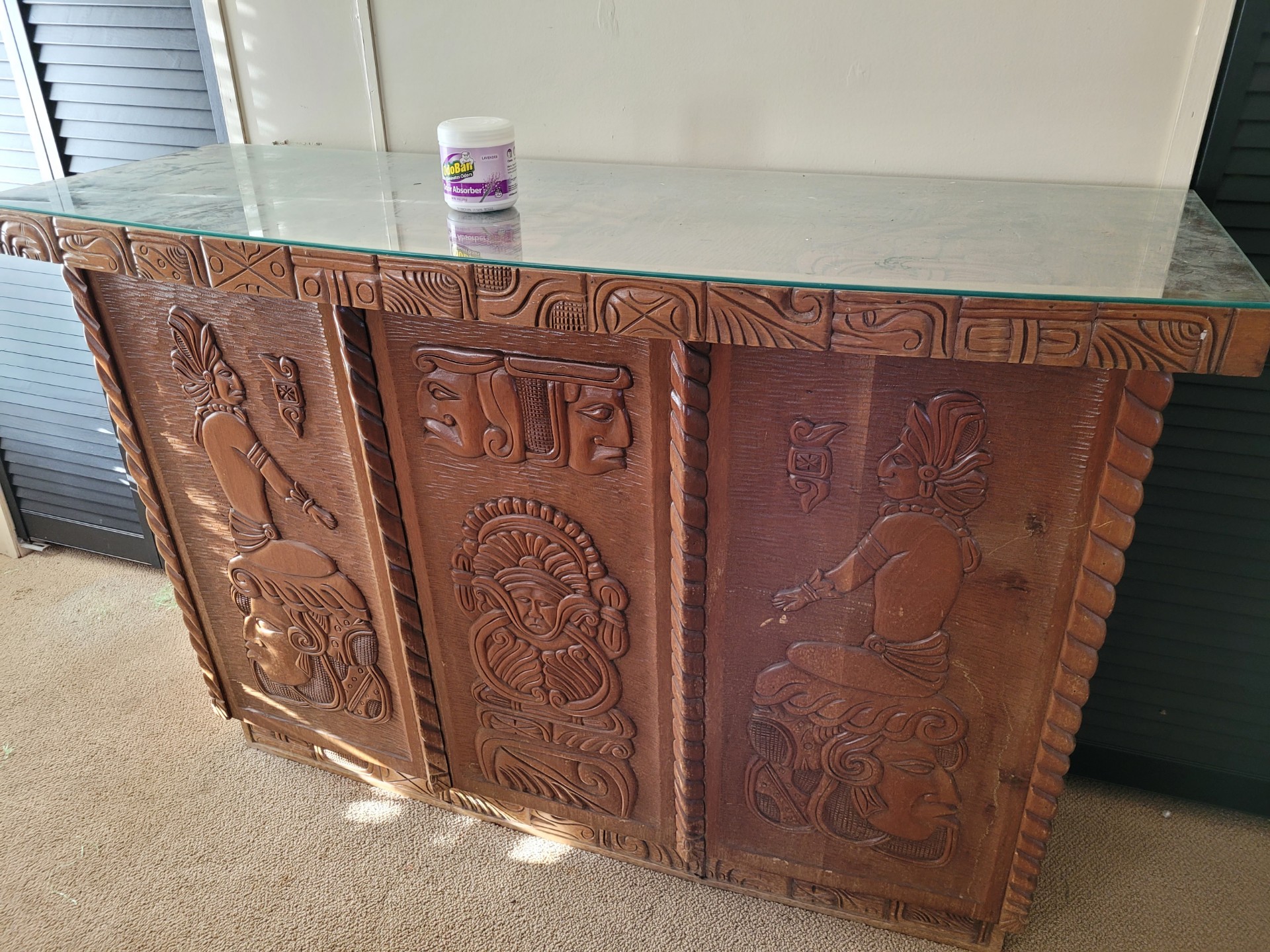Large, sturdy, carved wooden bar with glass on top. Design could be of Polynesian or Indian design, open backside with shelves