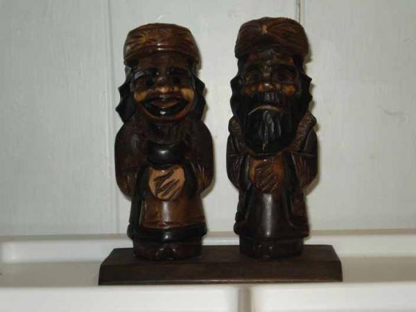 These are carved light brown wooden figures painted with dark brown to black colors.