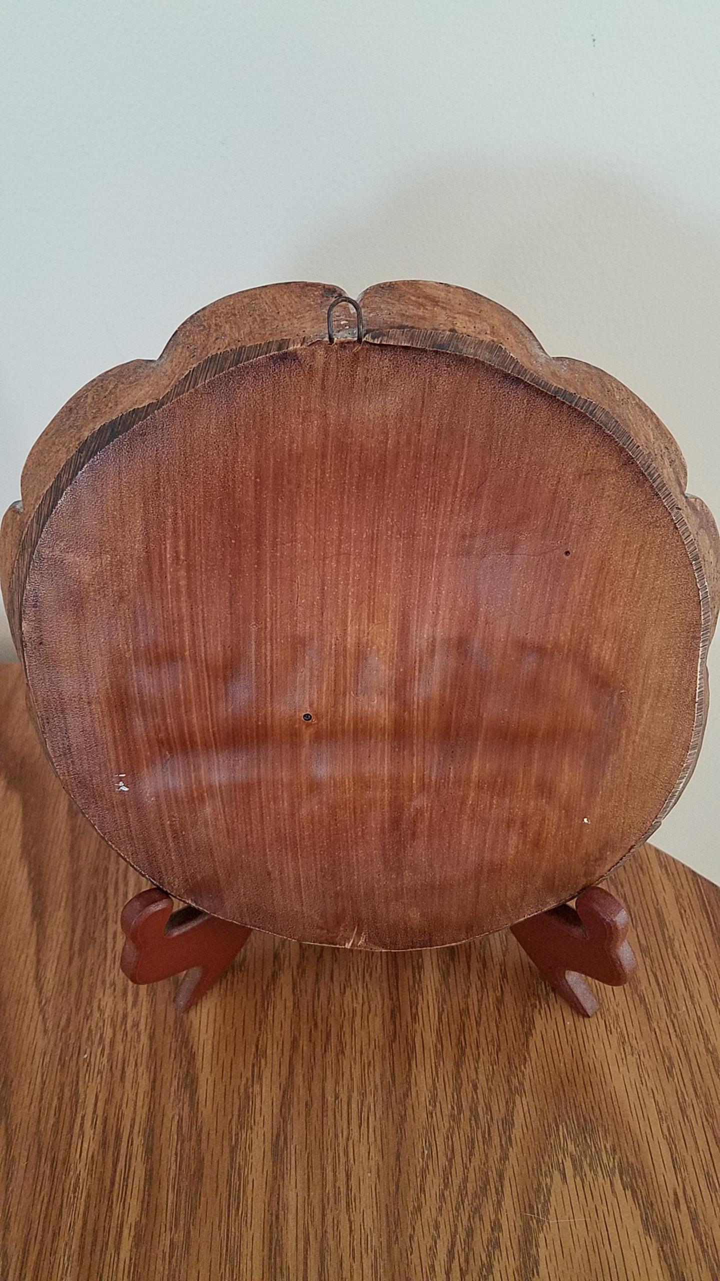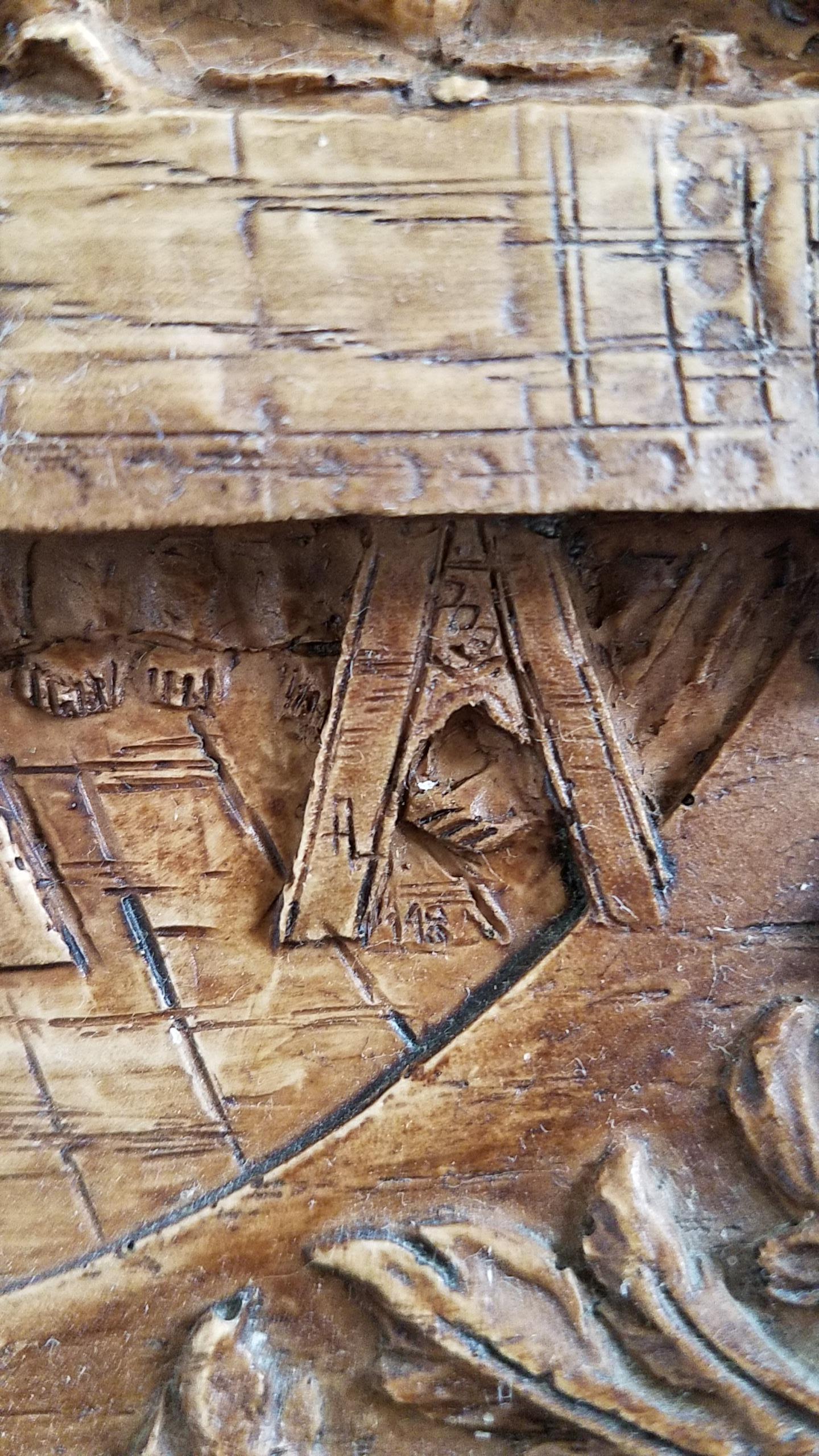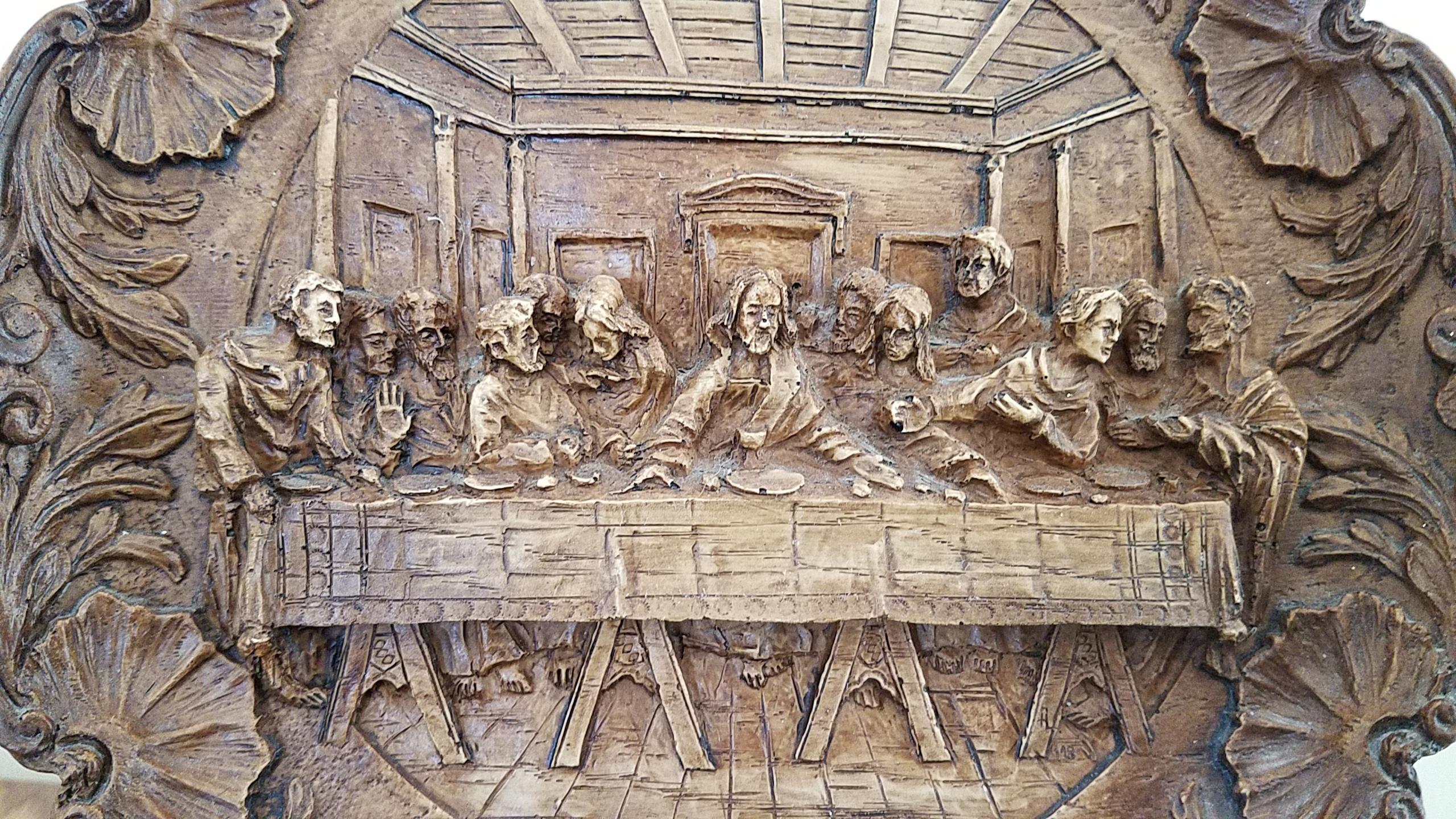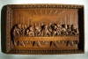An intricately carved wooden "Last Supper' plate/plaque with a weathered back. Possible marking/signature with the number "148" in the bottom right.