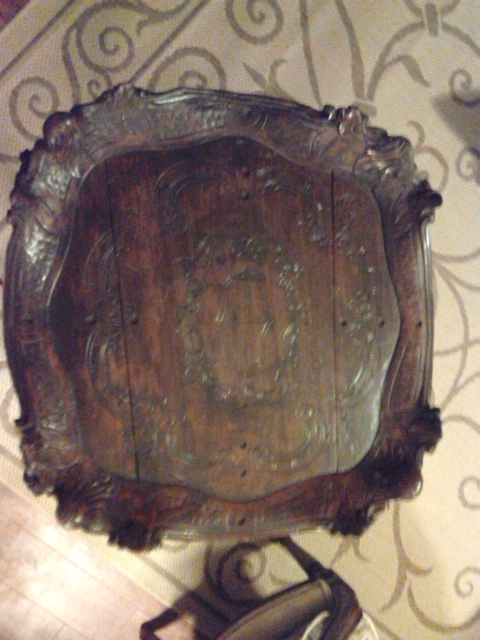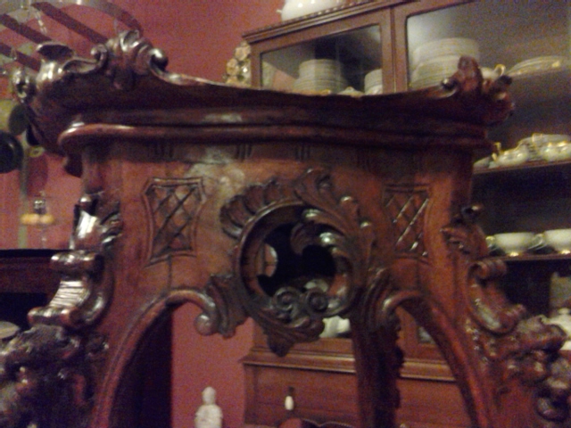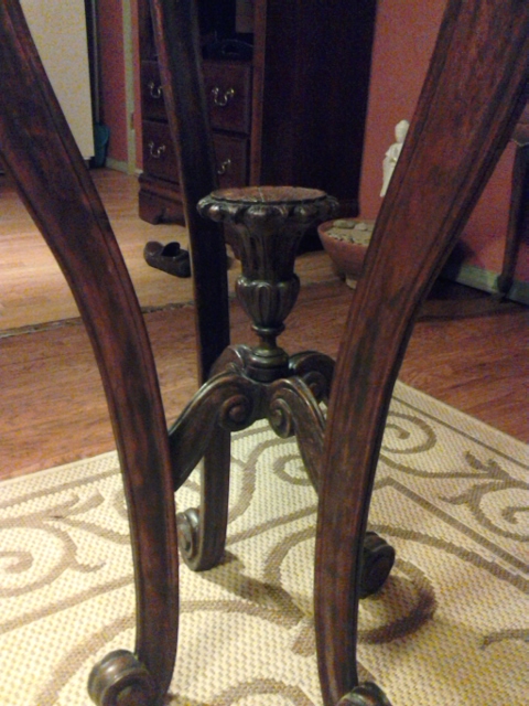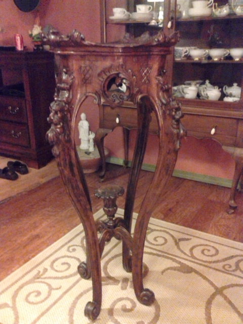Handcarved wooden pedestal with animal faces carved on upper legs.