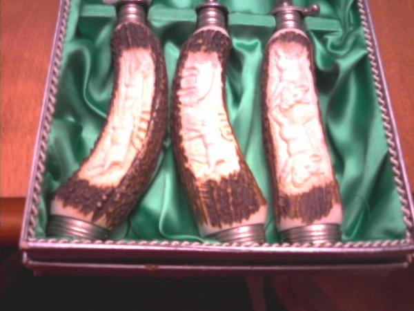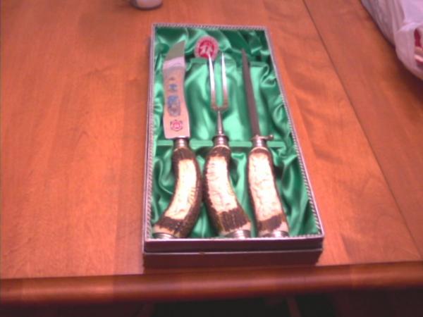 This was purchased by my father in 1953. It has boars carved into the ivory handle on the steel, there are deer carved into the ivory handles of the knife and fork. The knife and fork also has gold decorative etching of deer and the company logo. The original box and price tag are still intact. The original price was 58.15 marks.