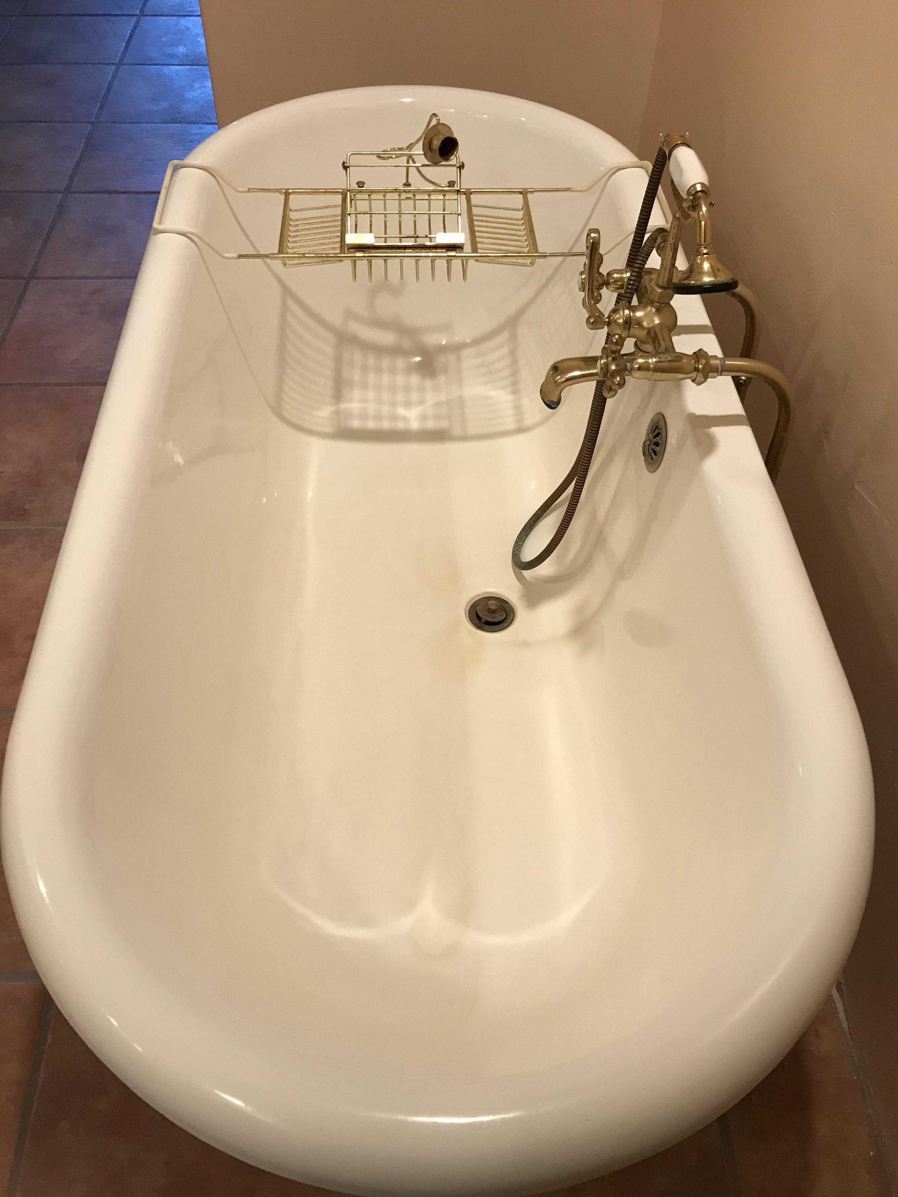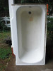 Cast iron claw foot bath tub with accompaning brass faucet, shower, water supply lines and drain lines. Tub is in excellent condition with 4 matching feet. Unable to find a manufacturers name on the underside of tub. Only discernable markings are two sets of stamped numbers: