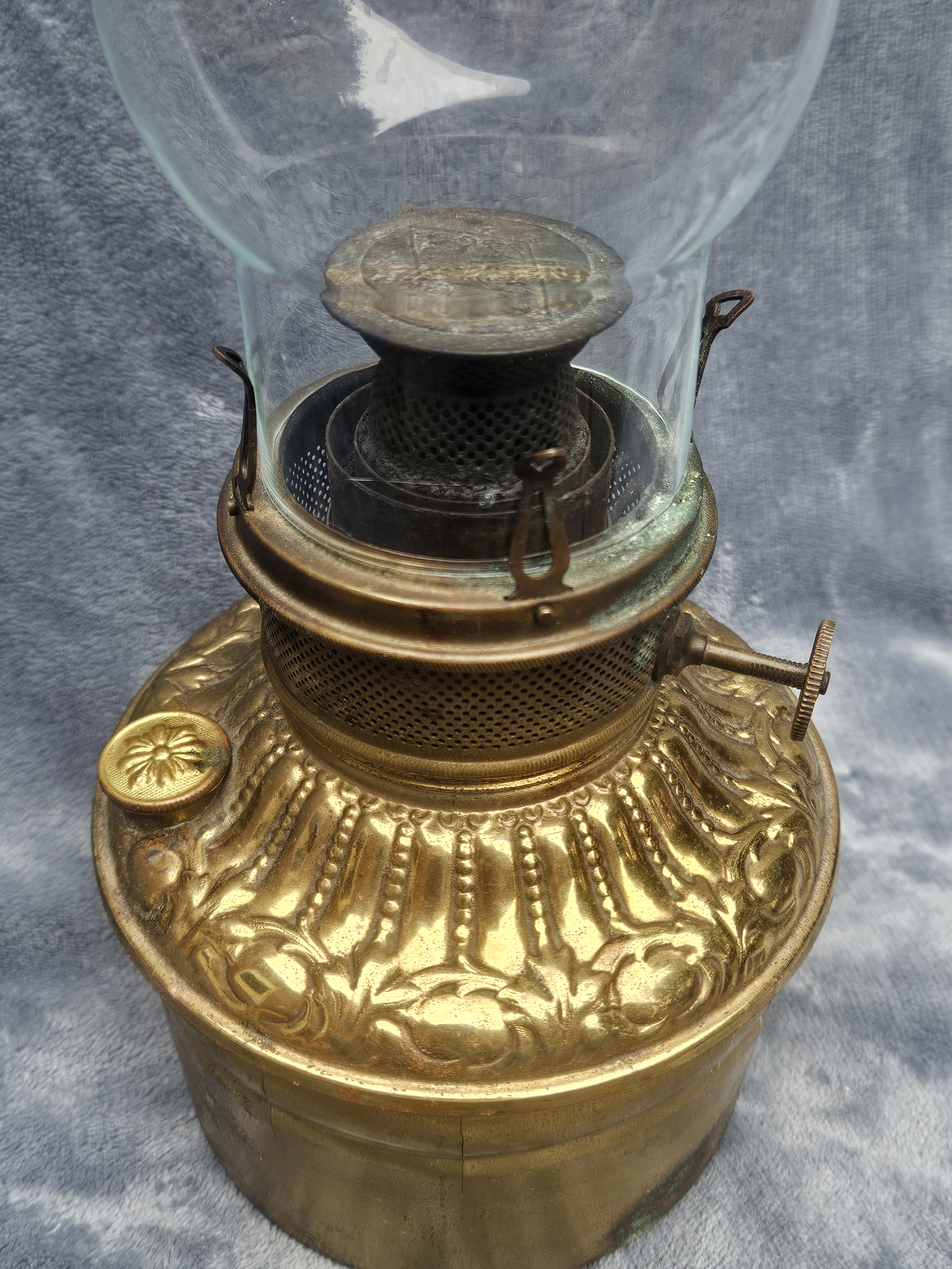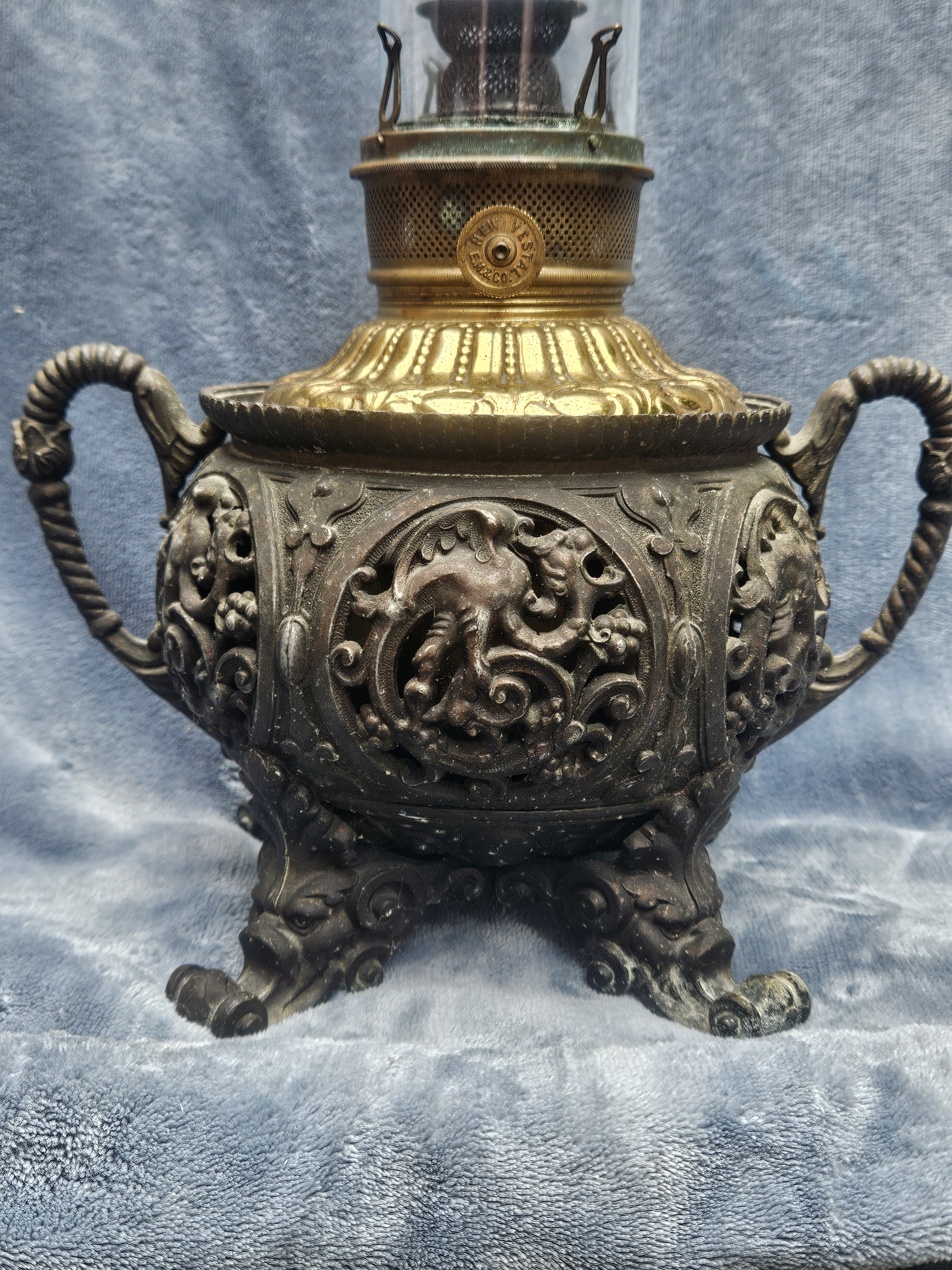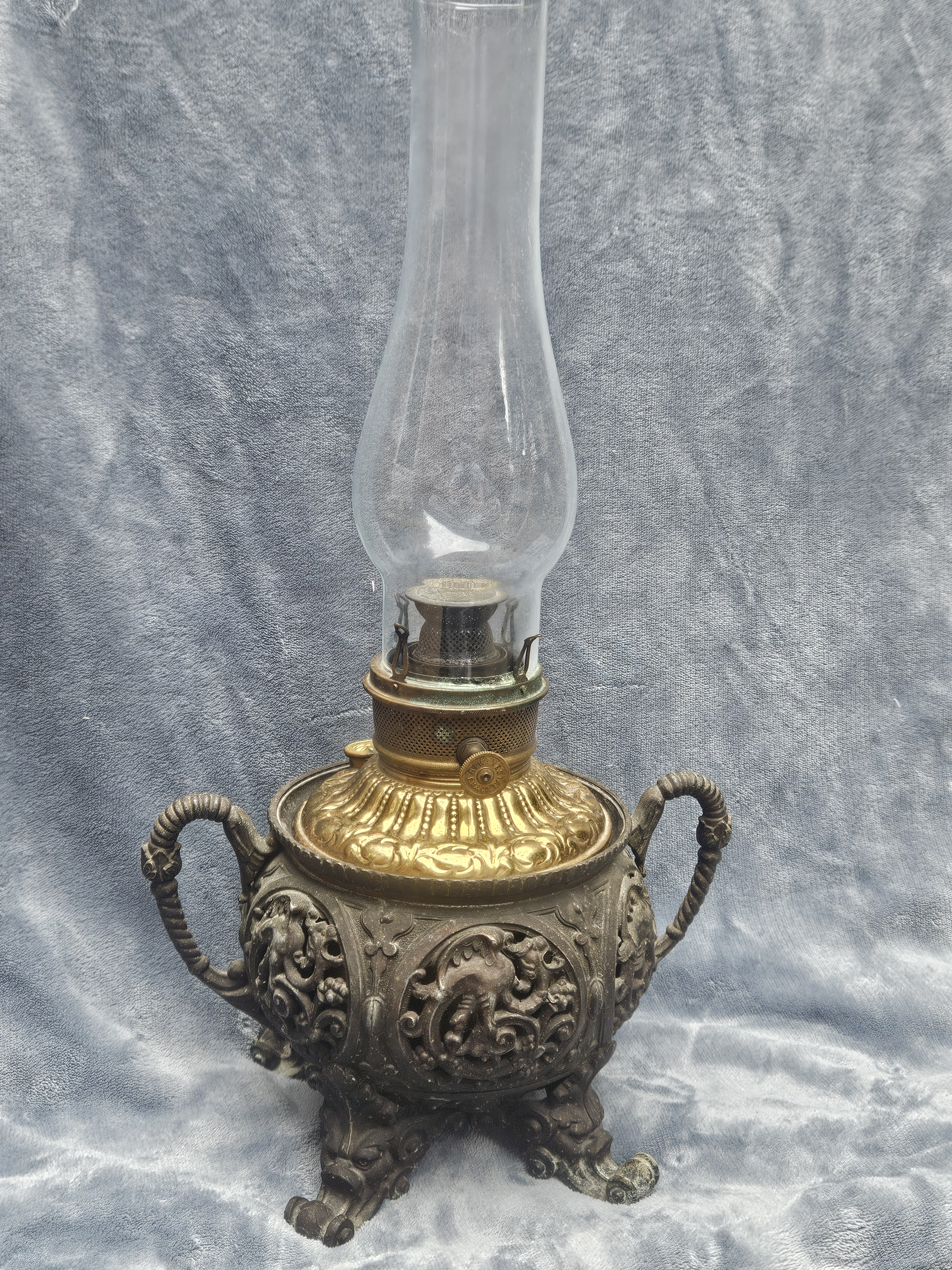 Type: Ornate Cast Iron Table Oil Lamp with Brass Font and Chimney