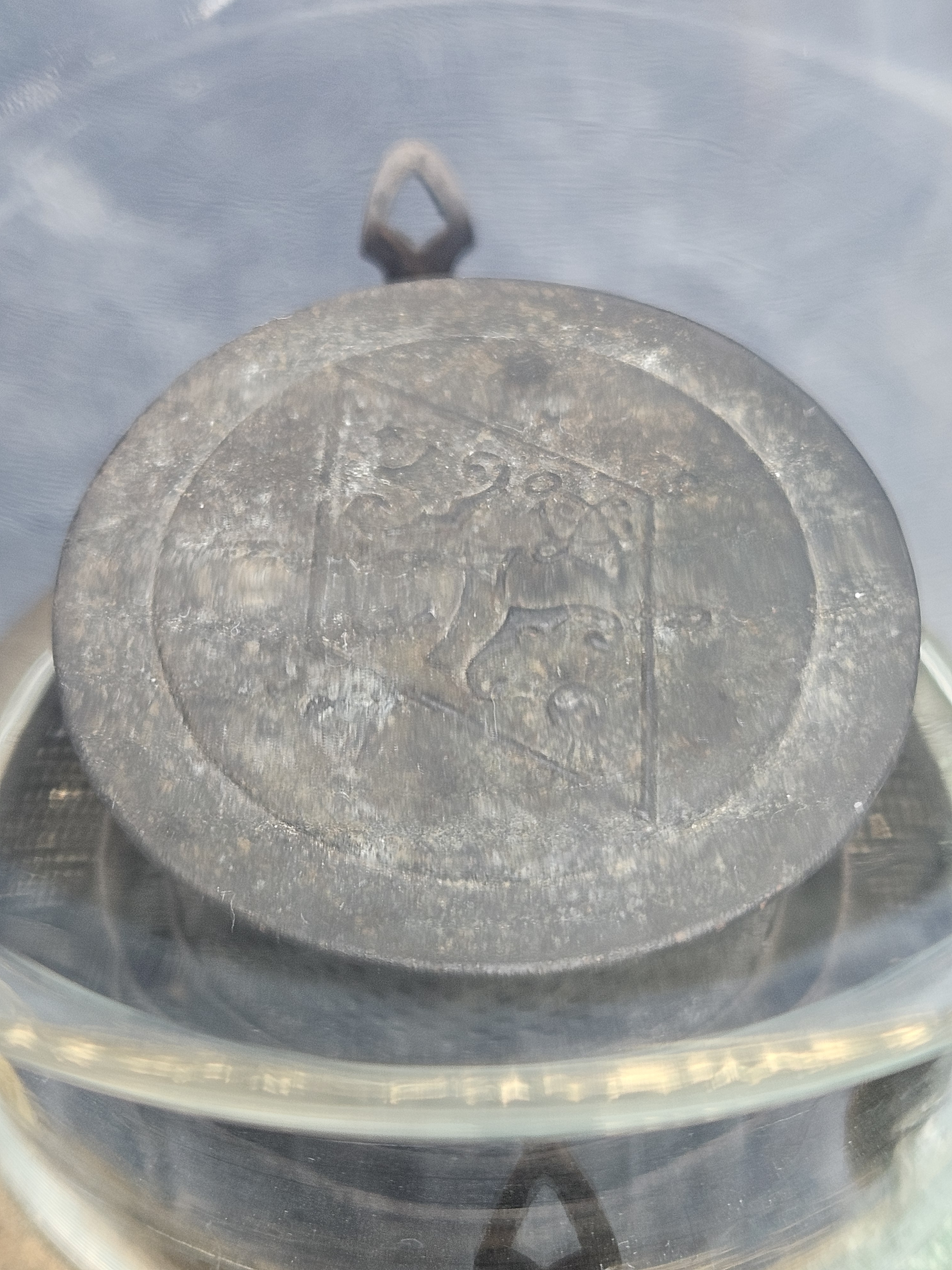 Small, heavy cast iron oil lamp with what appears to be dragon motifs. Brass insert has opening to fill with oil. Metal has some oxidation both on insert and cast iron exterior.
