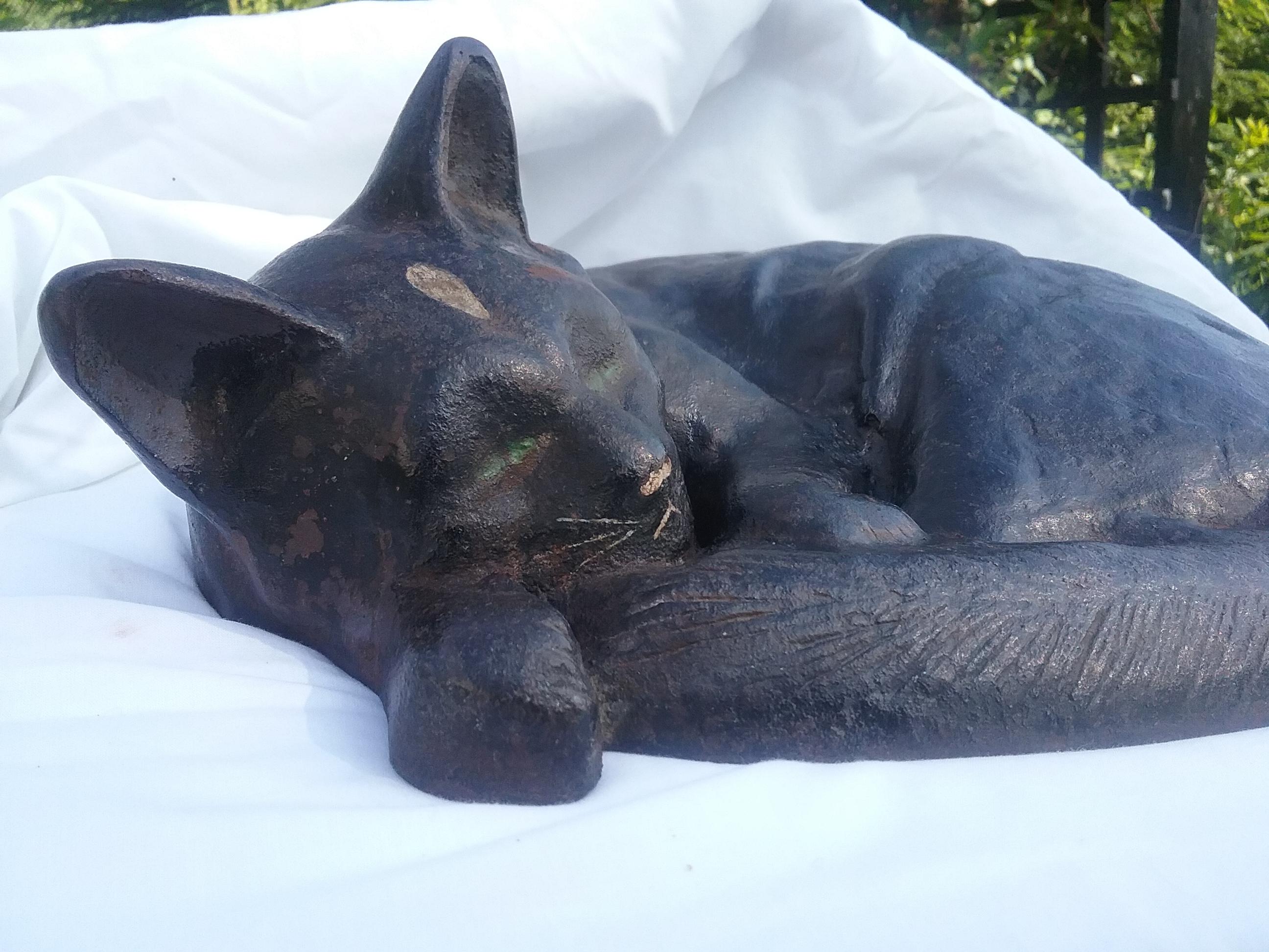 This cast iron sleeping cat doorstop was given to me by a 90 year old woman who told me she had it in her family since she was a child. There are no markings on it to identify the maker but from the very few similar examples online it may be from the Albany Foundry in New York. It has green eyes,gray ears, and a white marking on its forehead. It appears to me to be in very good condition and am curious about its value and its age.