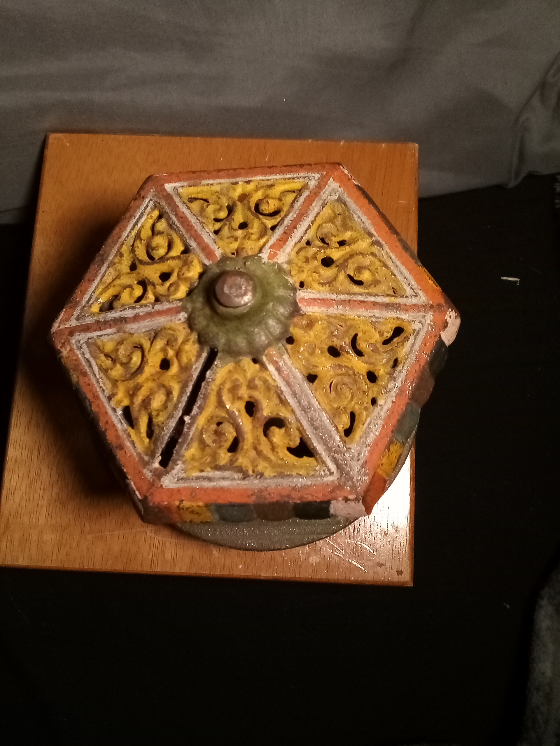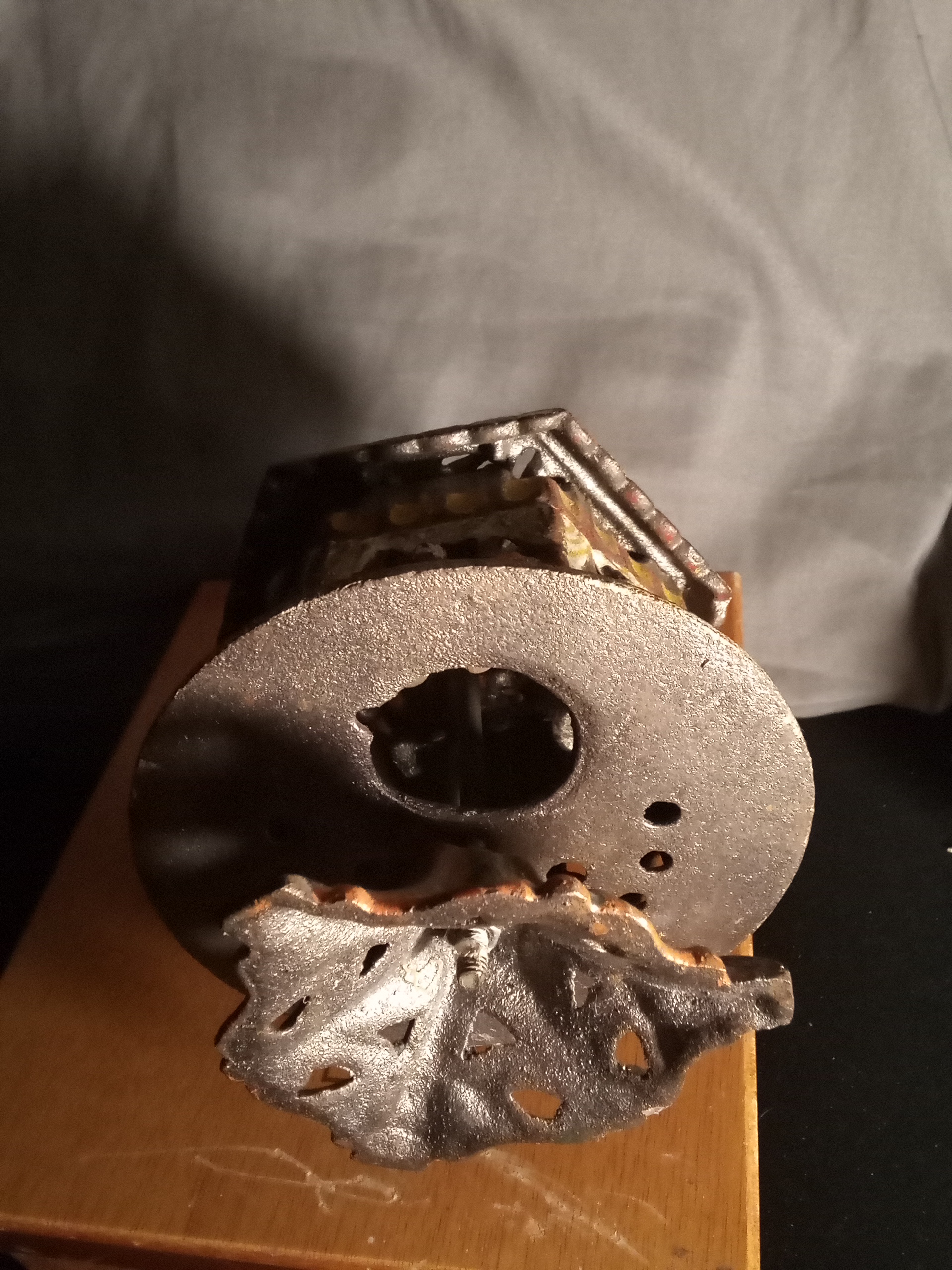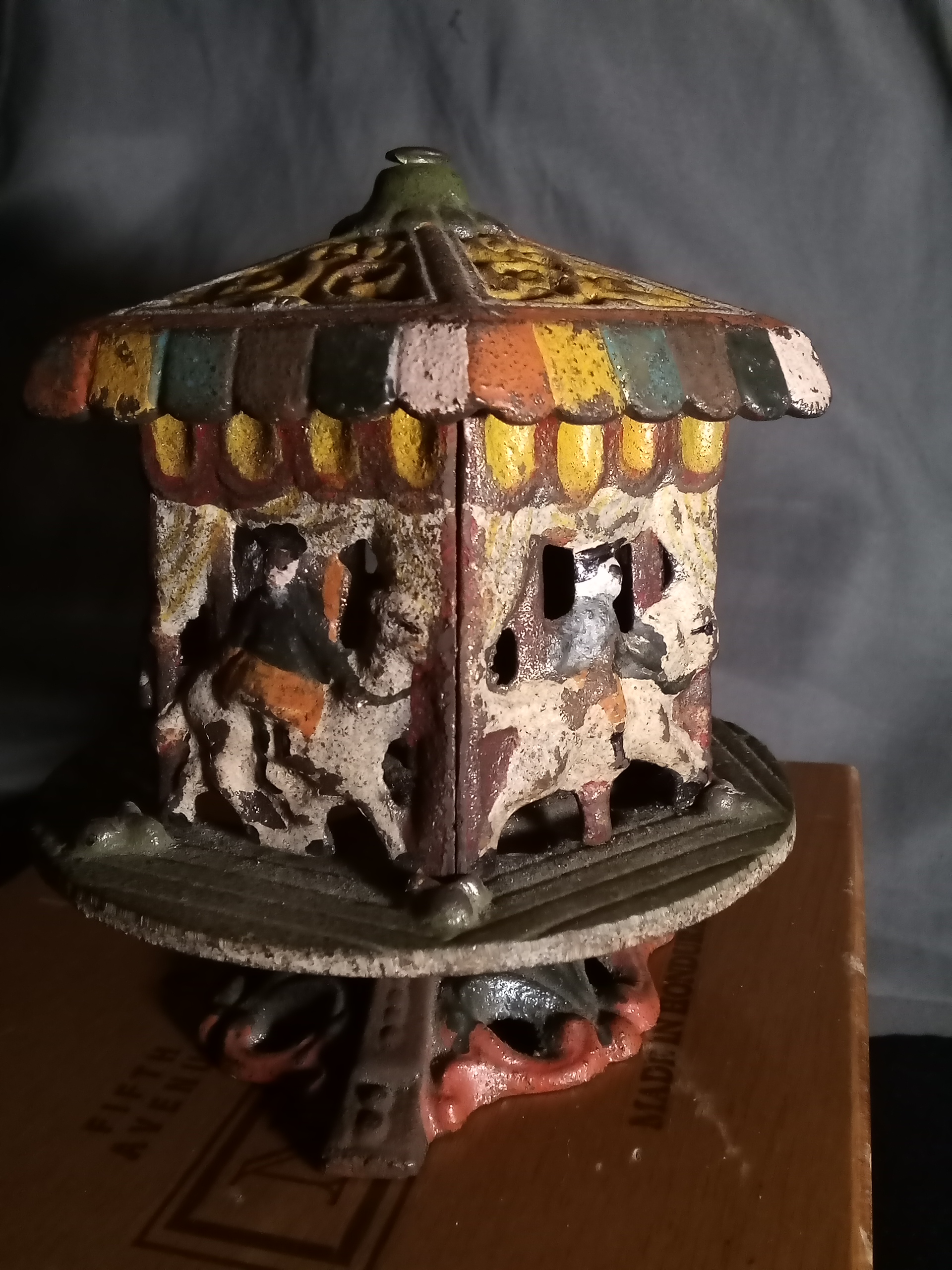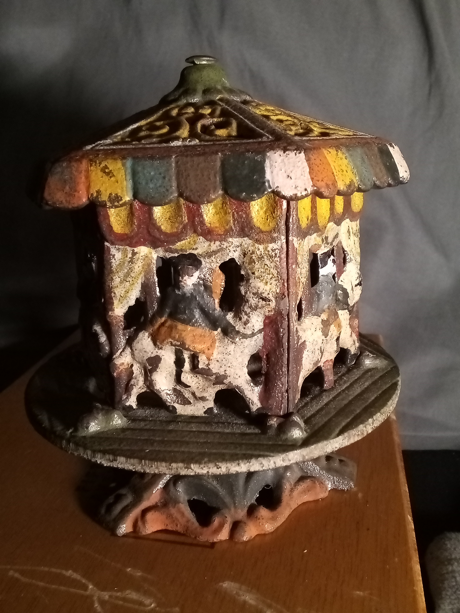 Cast iron, between 3-4 inches tall. It has a slot for the money on top and a hole in the bottom to take the money out.