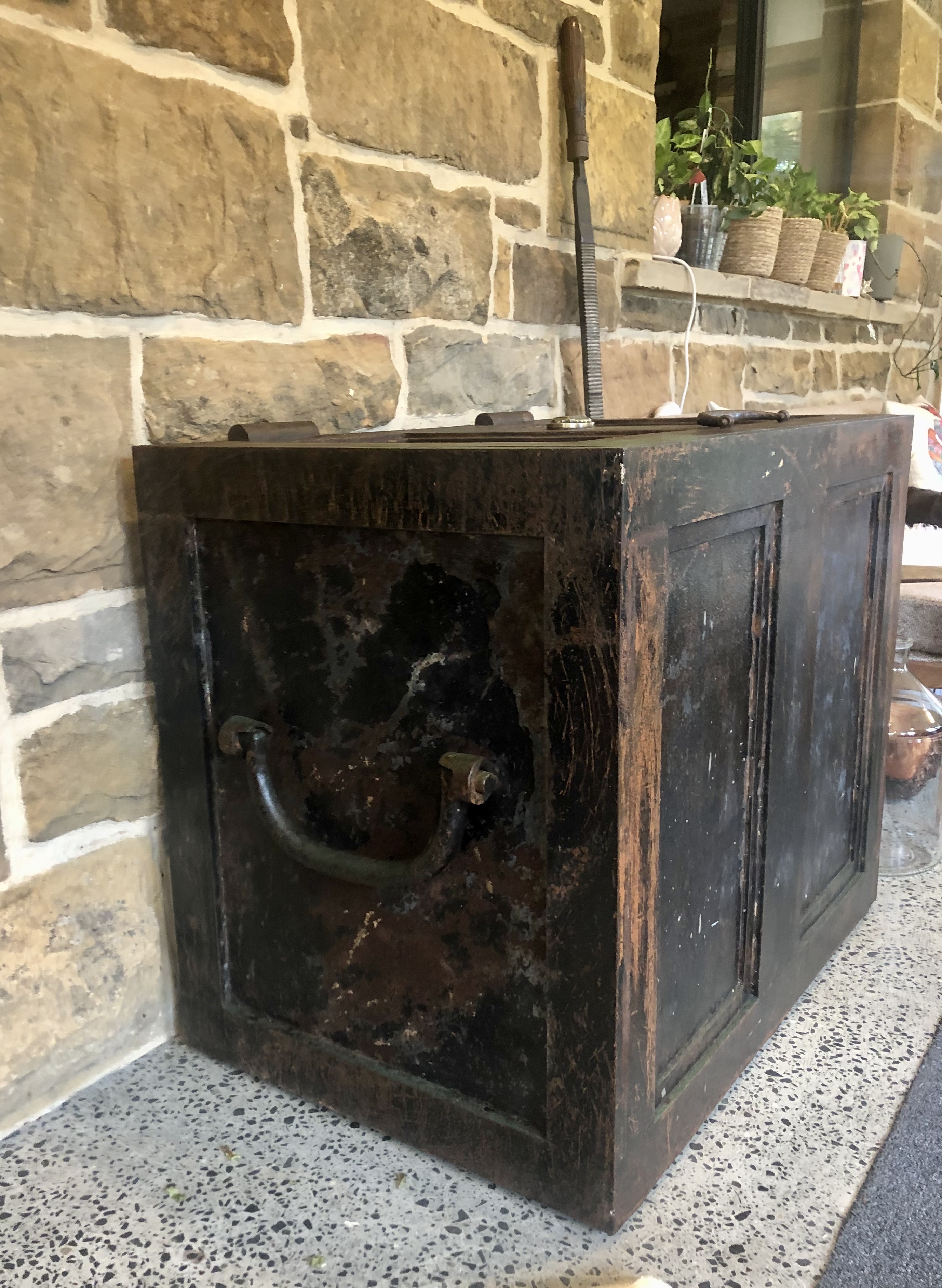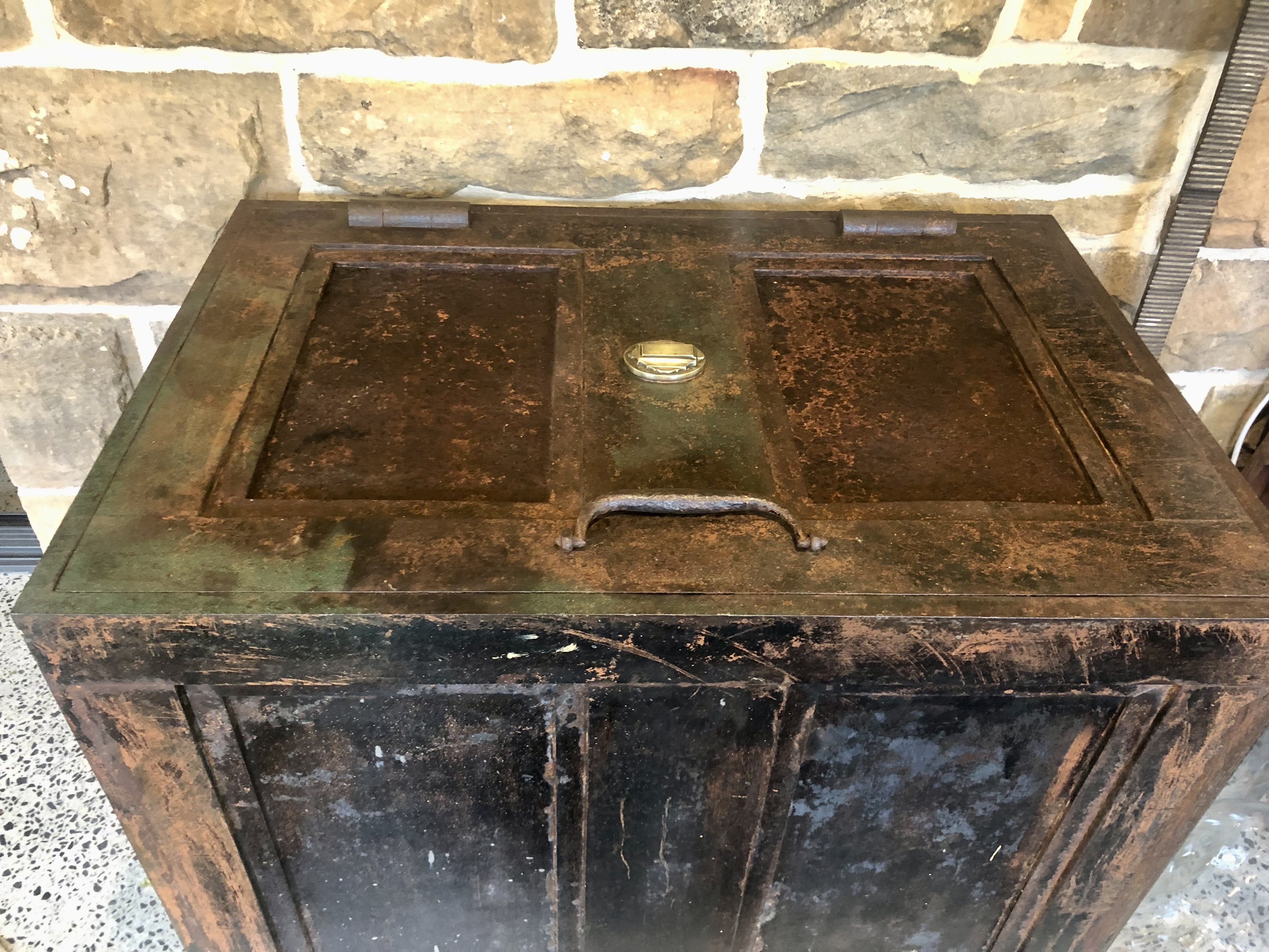 Hoping the brains trust can help us identify if this huge iron strong box is a Colebrookdale as it has no markings. It’s a massive piece weighing over 440 lb (200kg) and the dimensions are 30 inches (760mm) (h) x 36 inches (920mm) (w) x 24.5 inches (620 mm) (d).