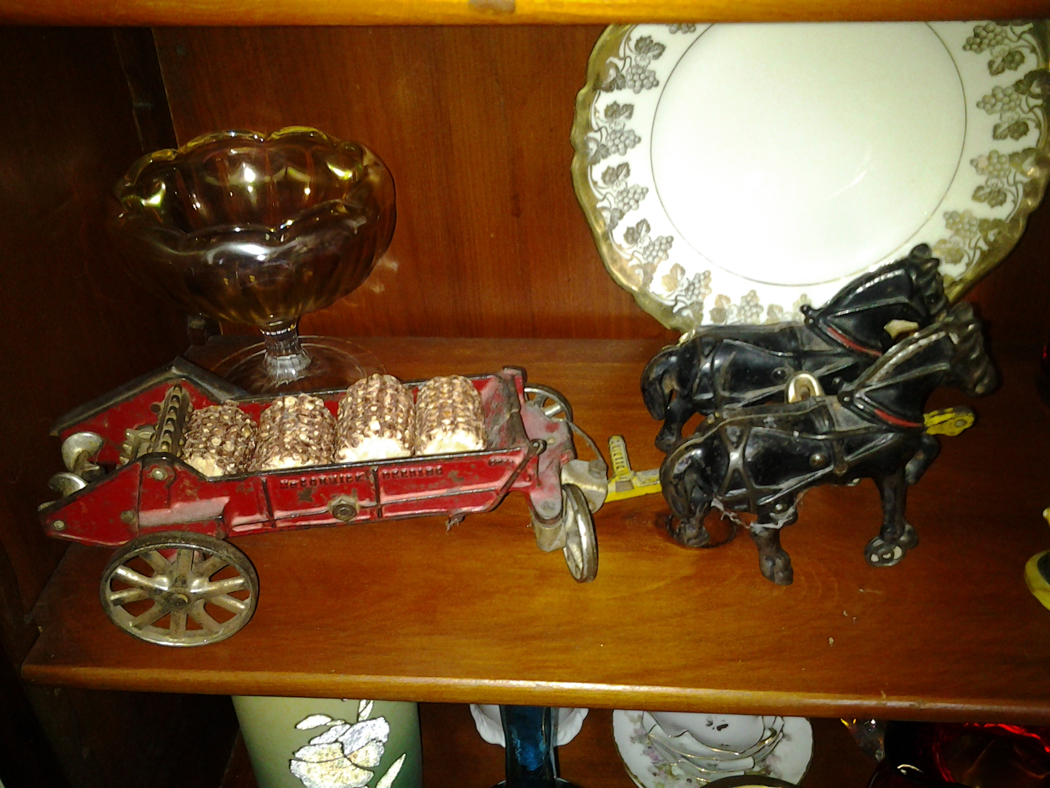 What are the dimensions for each piece? (How tall is the bear and how long is the manure spreader and horses?) What makes you think the bear is a steiff? Does it have a tag indicating such? More better detailed photos of both sides of the bear and any defects it has as well as a photo of the damage to the manure spreader will help with values.