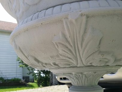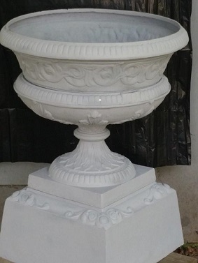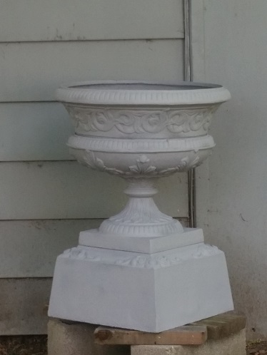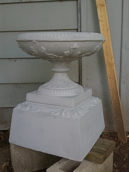 This is a vintage possibly an antique cast iron urn/ planter. It separates into 4 very heavy pieces. I stripped the paint and primered it, so that whomever would like to buy it can make it the color they want. It stands 28" tall, the mouth of the planter is 21" accross. I see no markings and am not certain of the age except that it has been in my husbands family since at least the 60s. I would appreciate some informatin and a value on this piece if anyone is able to identify. Thank you for your assistance. Denise Dawkins