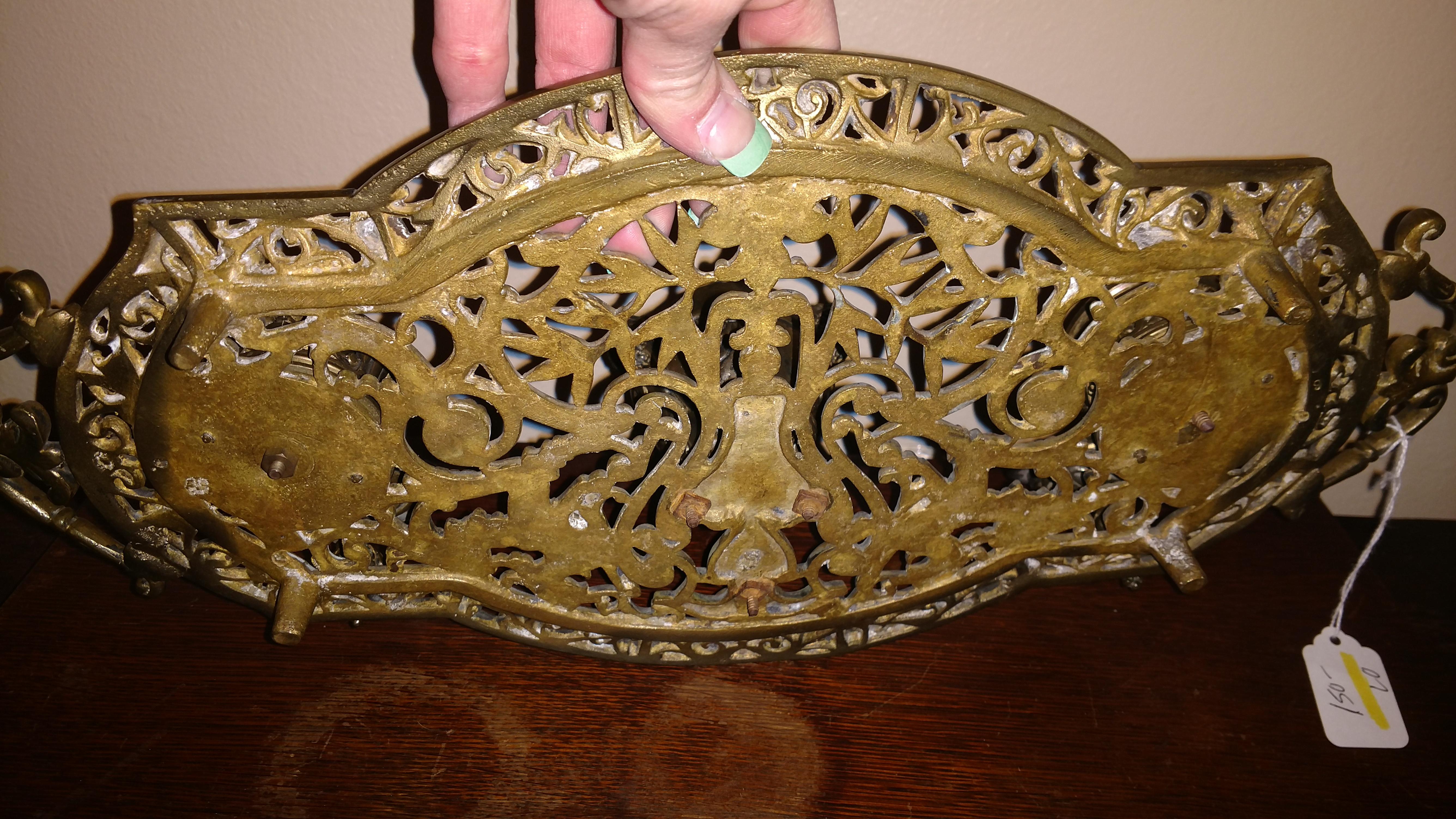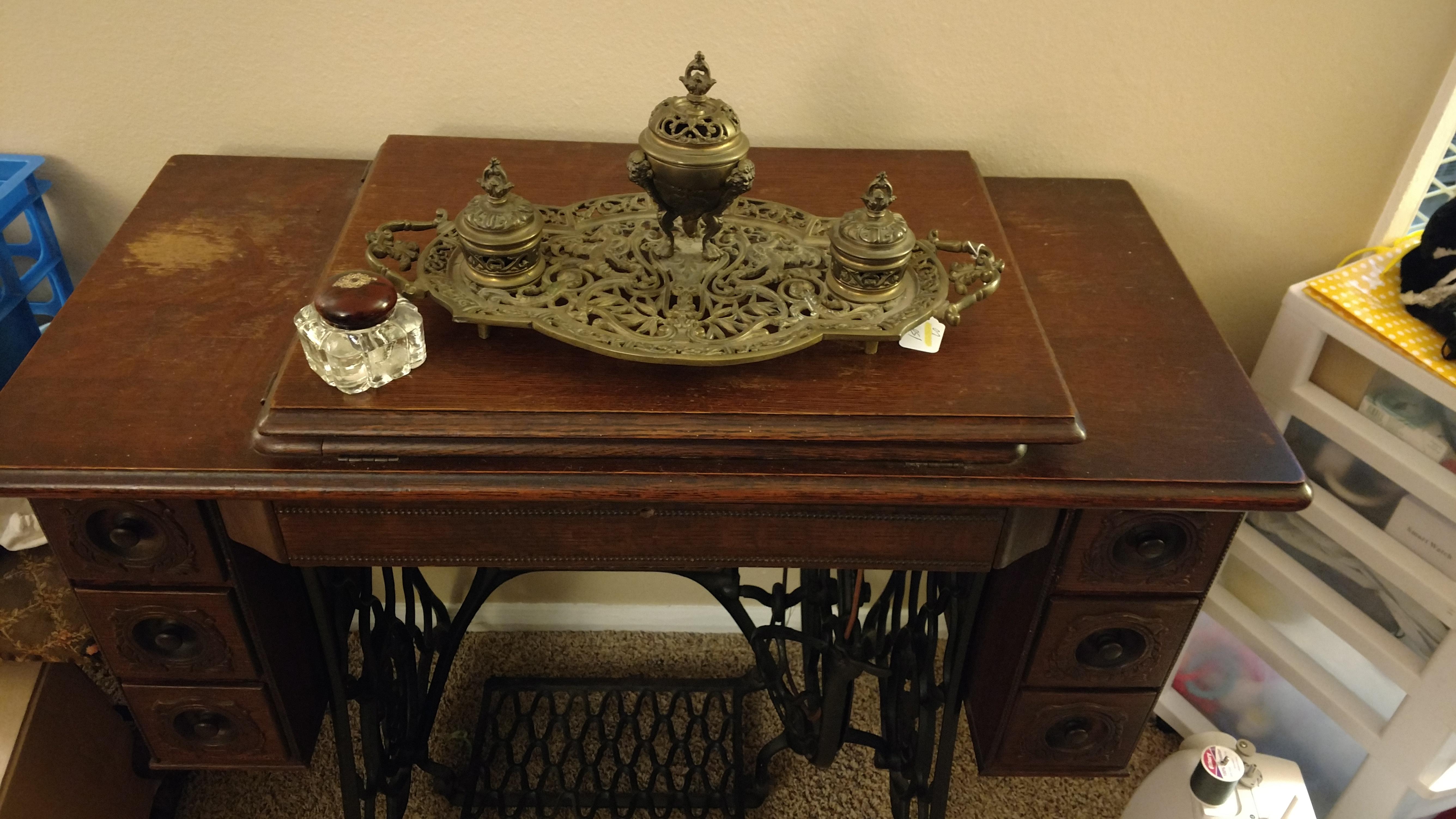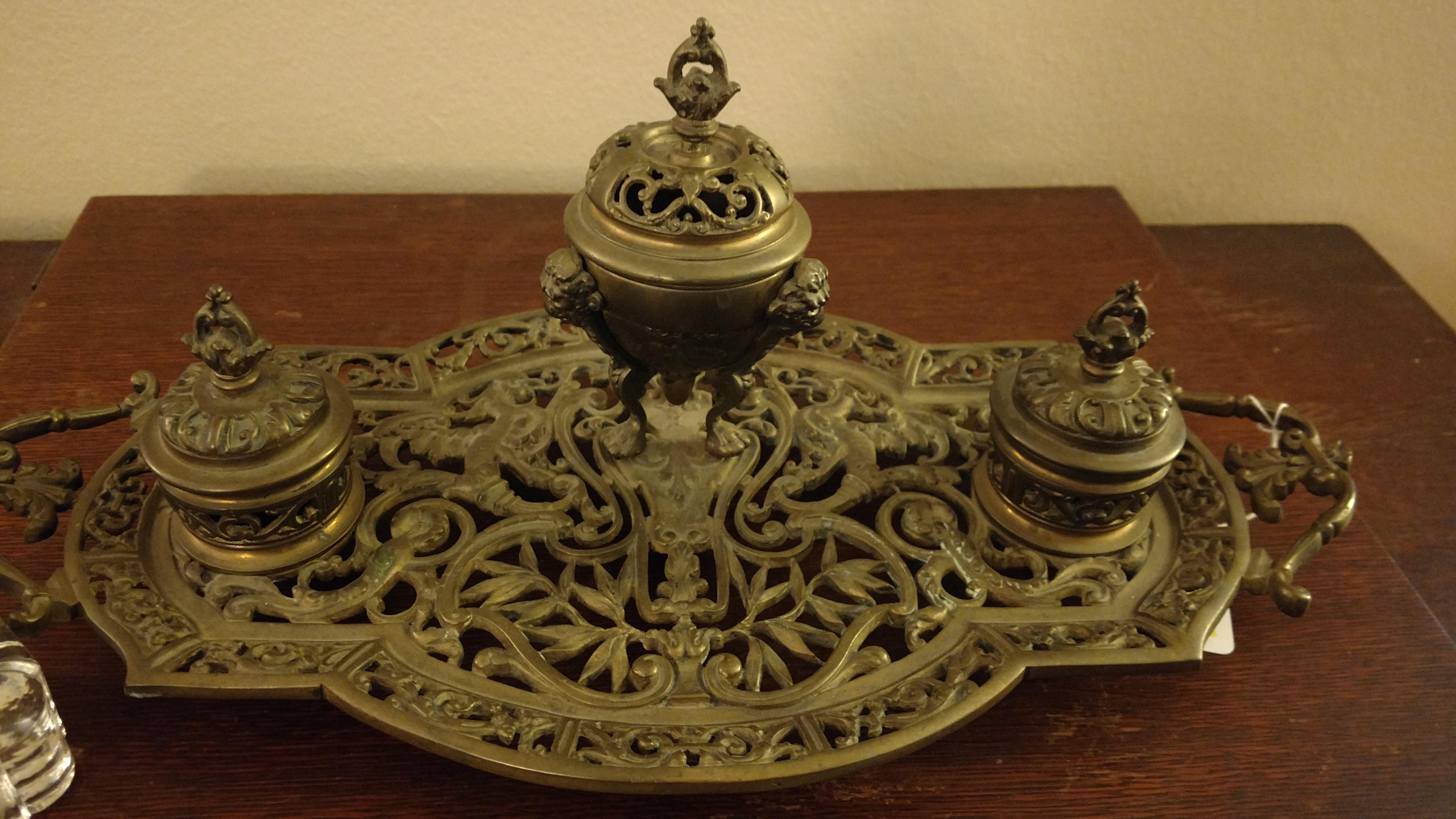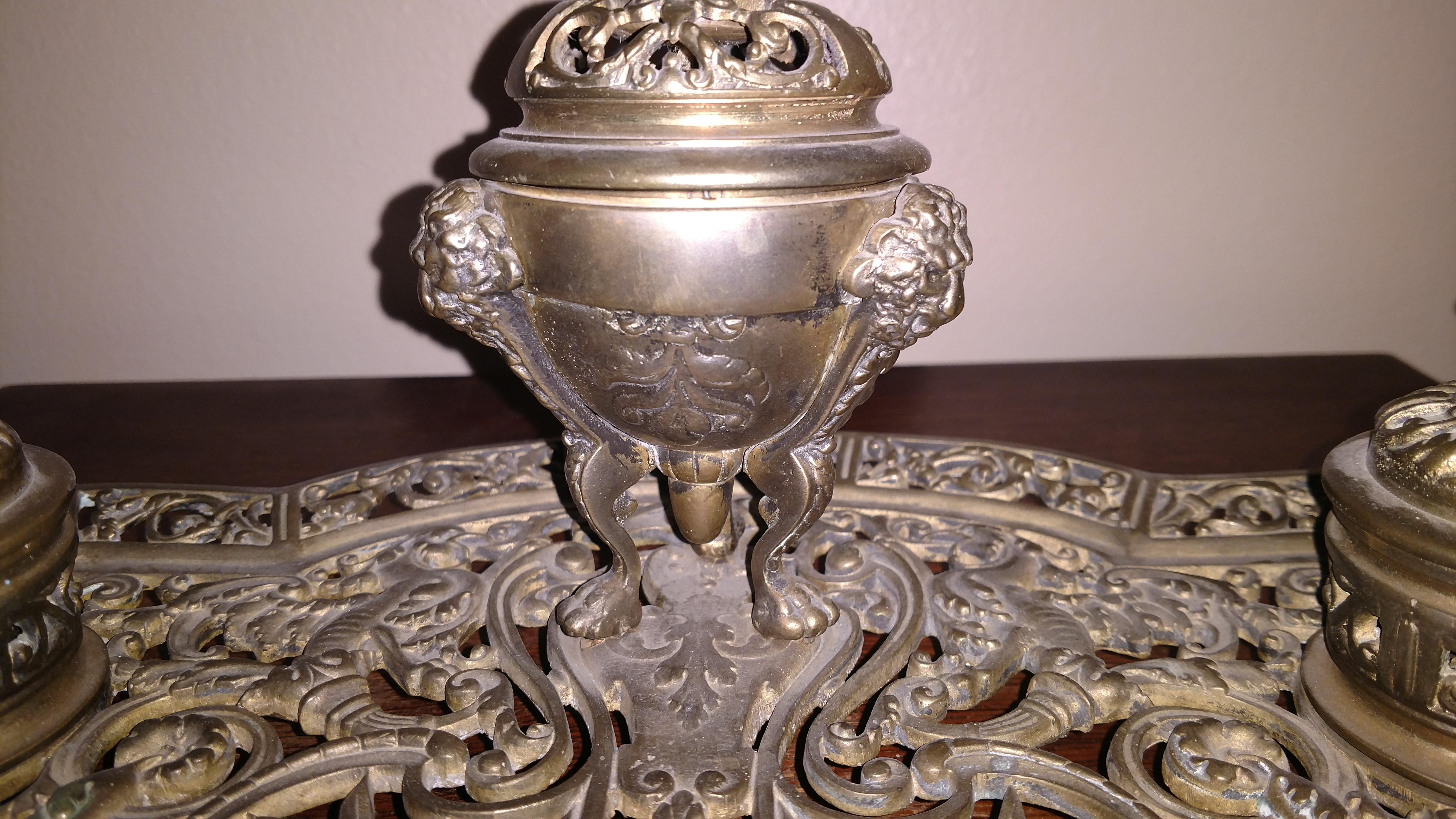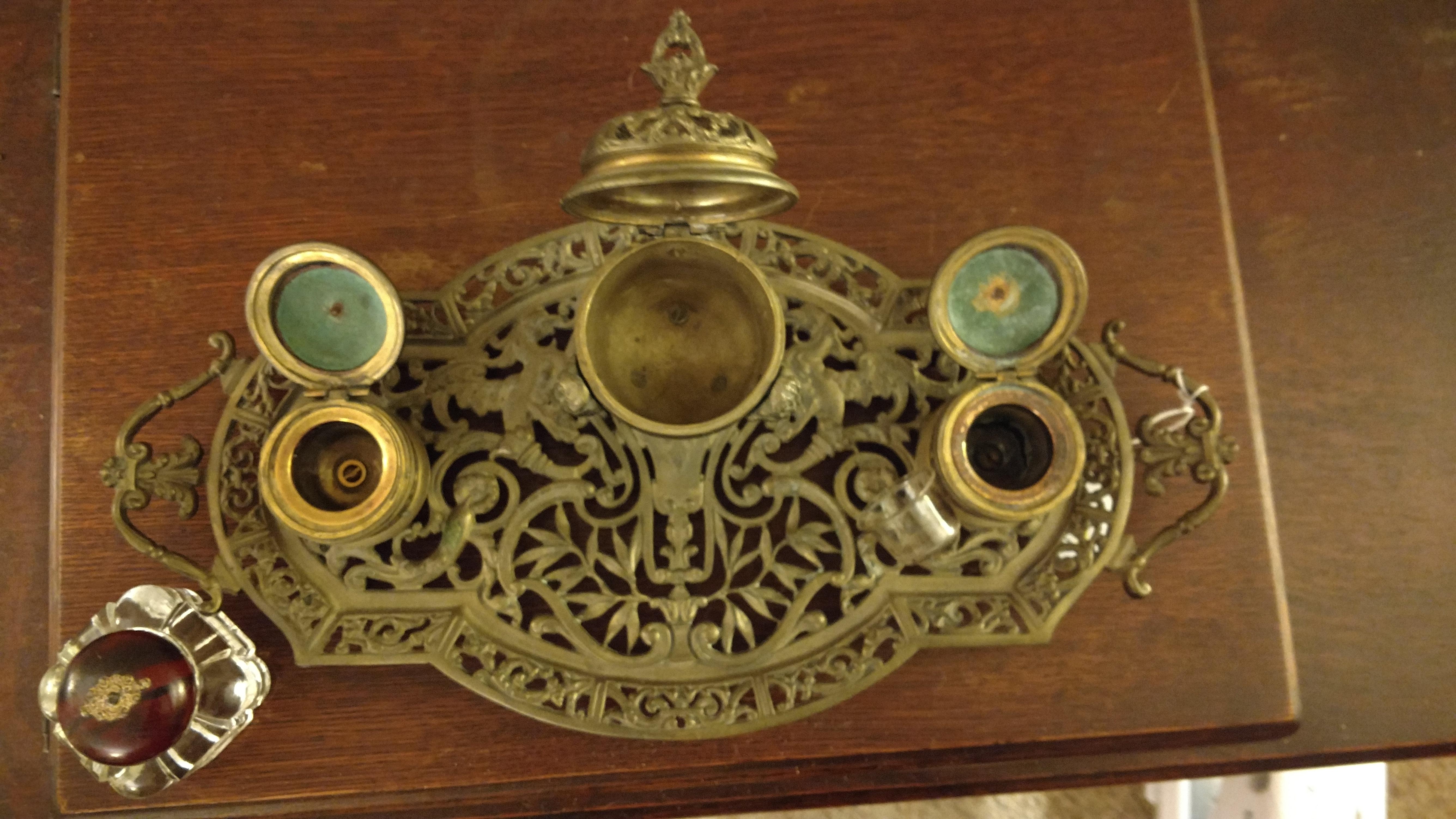 I don't know much about this item...I don't even know what to call it. It is an ink well desk set of some sort. There are no distinguishing marks or stamps anywhere on the piece. It is a dirty gold color and is solid and heavy. I'm not sure what kind of metal it is. The 3 chambers are attached and the kids are hinged and free moving. There is one of the 2 glass inserts in the outer chamber. I don't know the purpose of the middle chamber. The inner surface of the lids, on the 2 outer chambers, have a greenish diacoloration like copper, but the color looks a little to golden color to be sure. Please shed some light on the name, manufacturer, medium, age, rarity, and value of this item....exciting find and will truly cherish it!! Thank you for your time and efforts in this matter!
