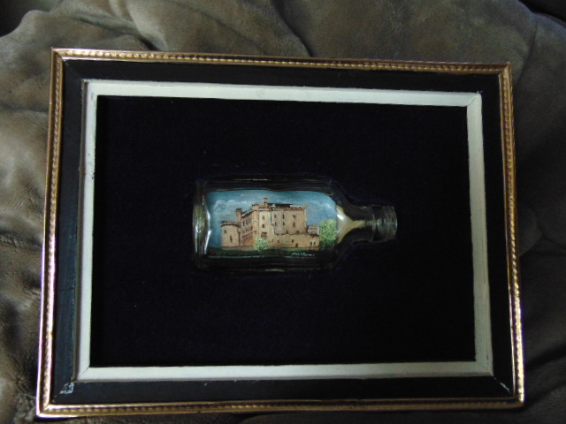 The bottle in which the painting is located is a clear rectangular, bottle. On the bottom there is a G in a circle in the middle of the bottle. there is alao a 103A mark above the G in the cirlce. To the right of the G in a circle there is a I. Underneath the G in the circle there is an X and then a 2 underneath the X.