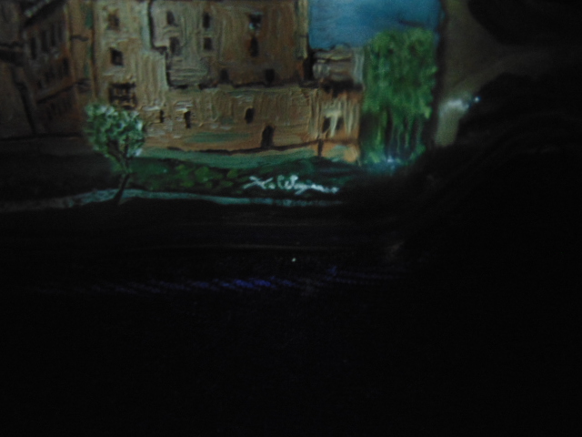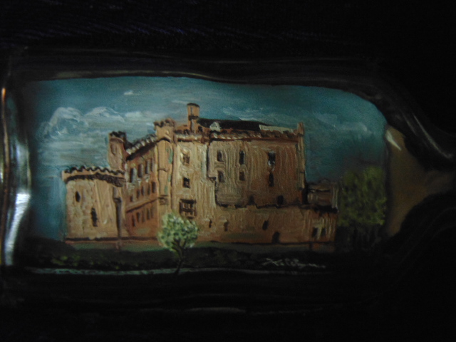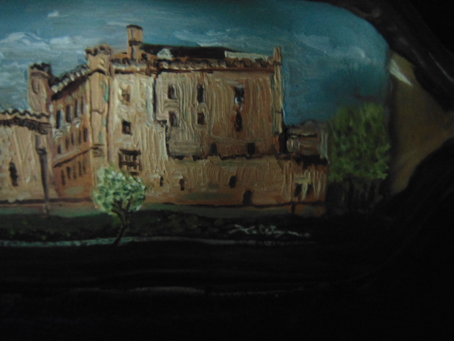 The castle looks like it is an oil painting and it looks like a European castle.