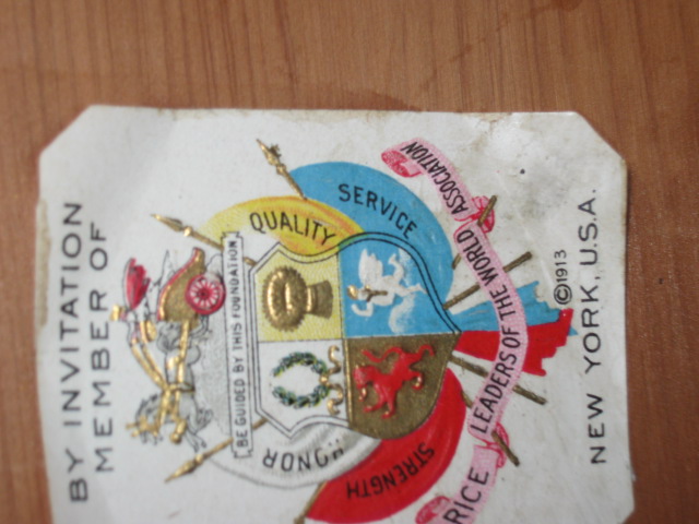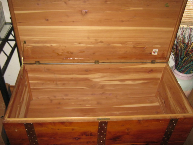 Cedar chest has what appears to be brass strips and rivets on the top. There are two cedar carved handles, one on each side of the chest. There is a sticker on the inside from the Rice Leader Association and there is a sticker that is gold and black that is torn and mostly removed but you can tell it says Caswell-Runyan. The top needs to be refinished but all else is sound.