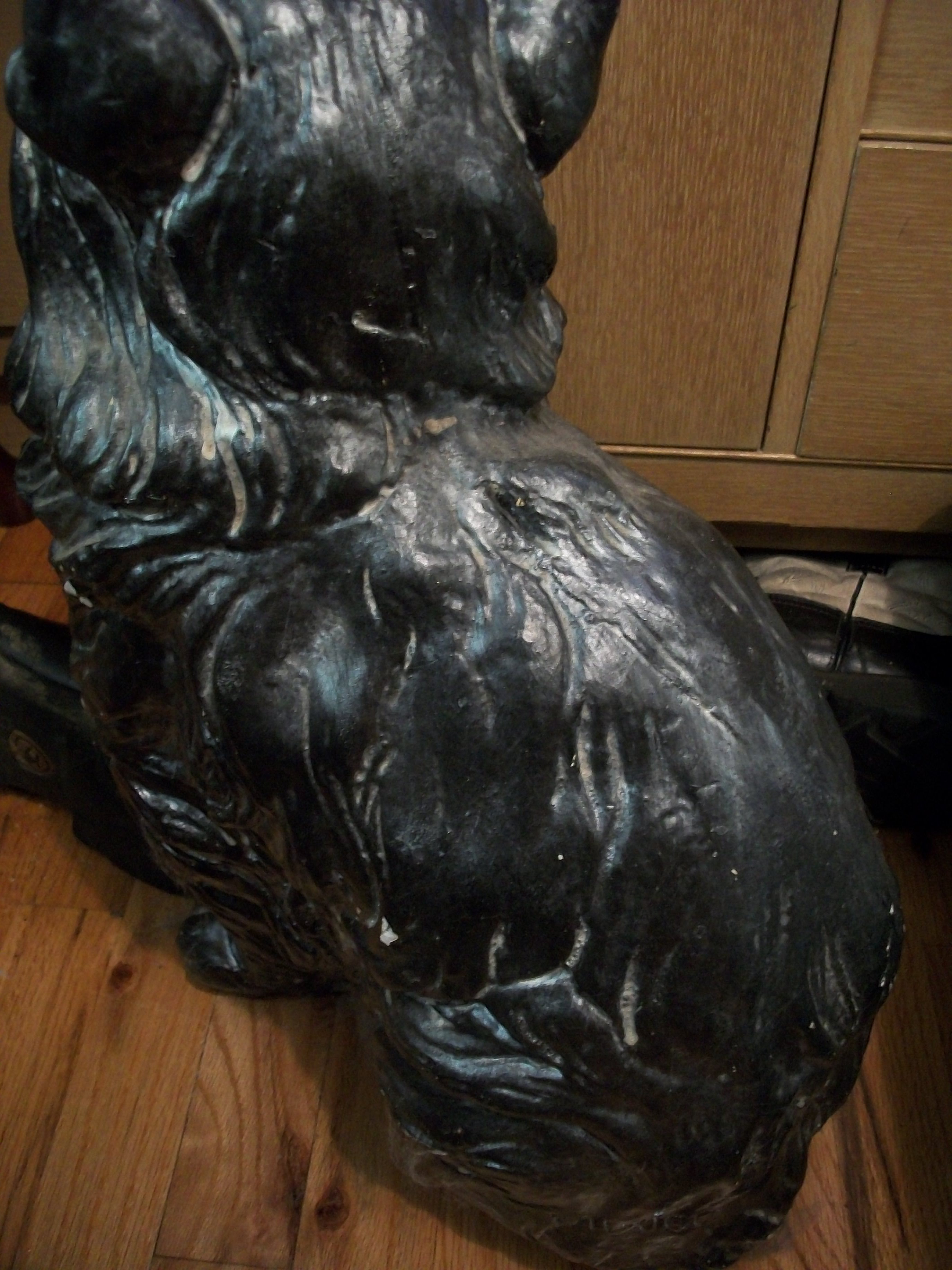 It's in very good condition, it used to have a transparent white ribbon with plastic pearl beads hot glued on it's neck. It fell off in one of my many moves. I have been informed by random antique collectors that this shouldn't have effected in negativley because most likely it was added on in the 1960s. The bottom of it has abosolutely no markings.