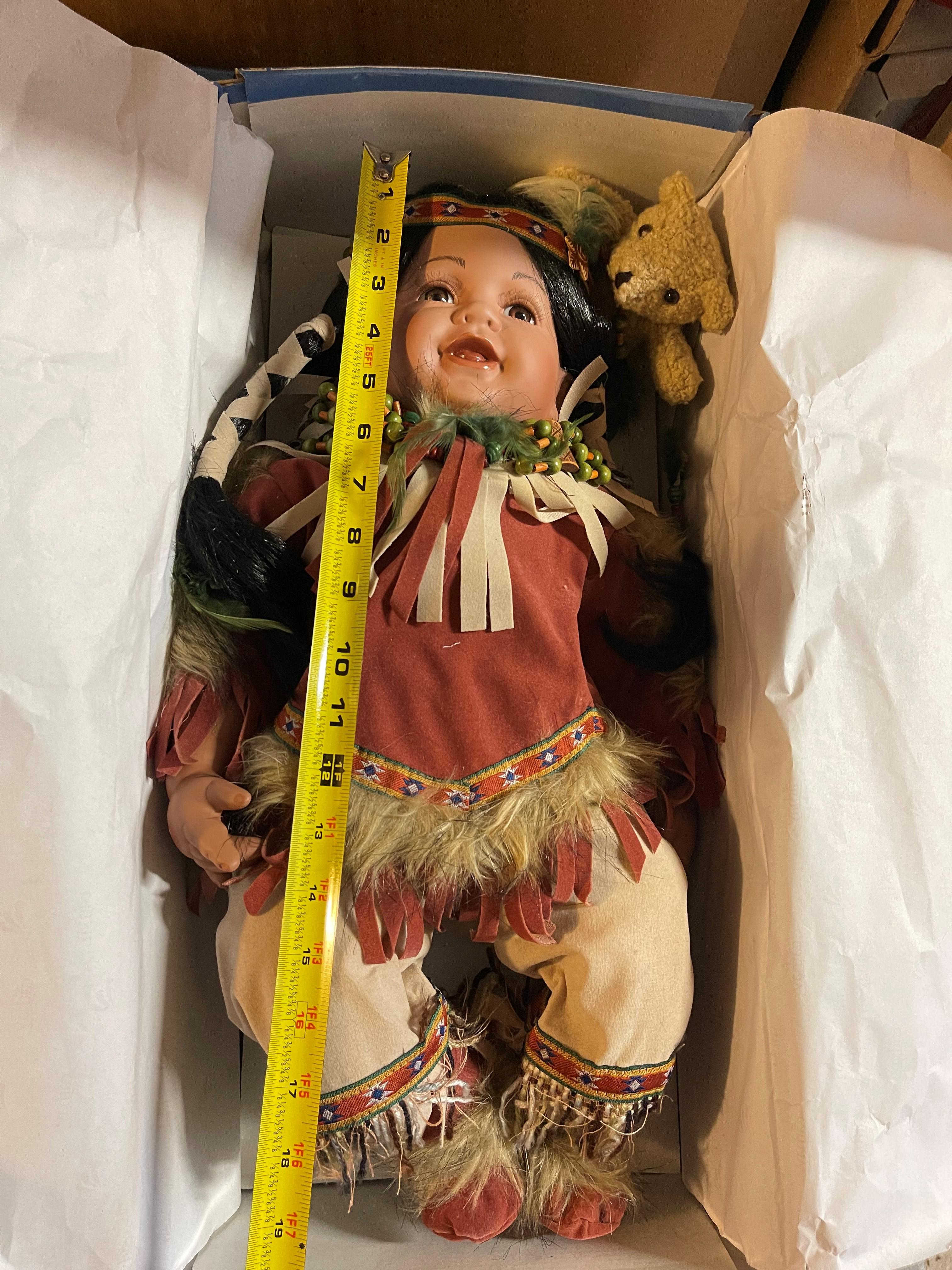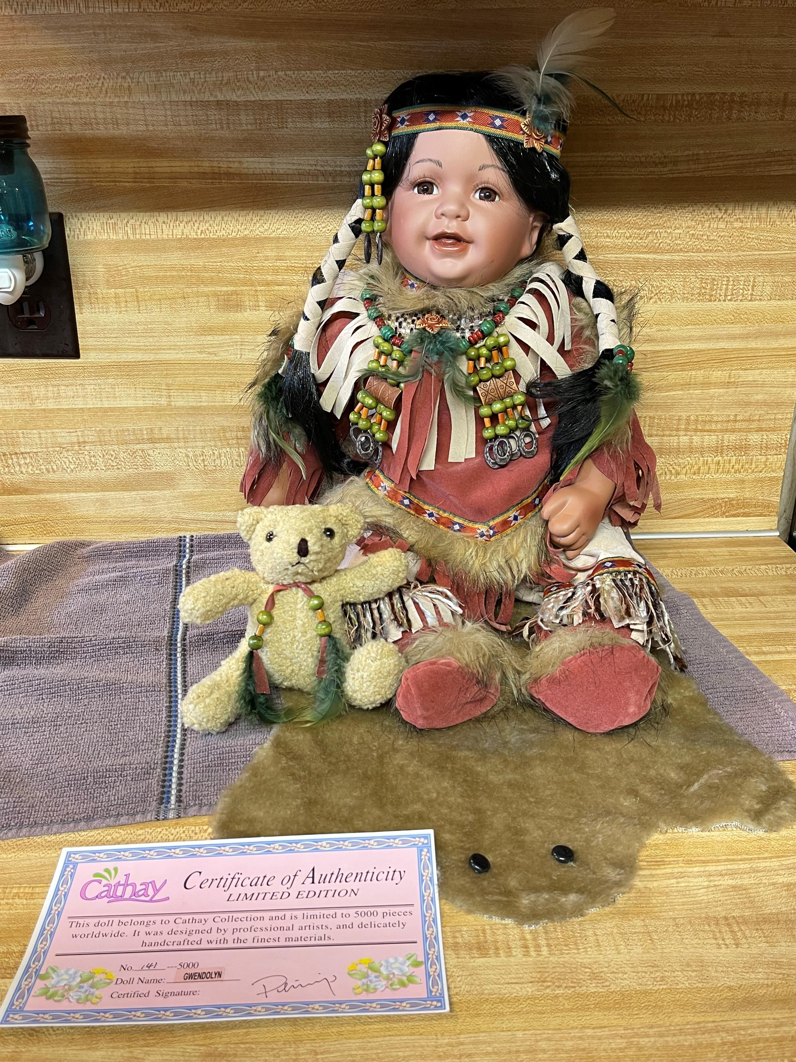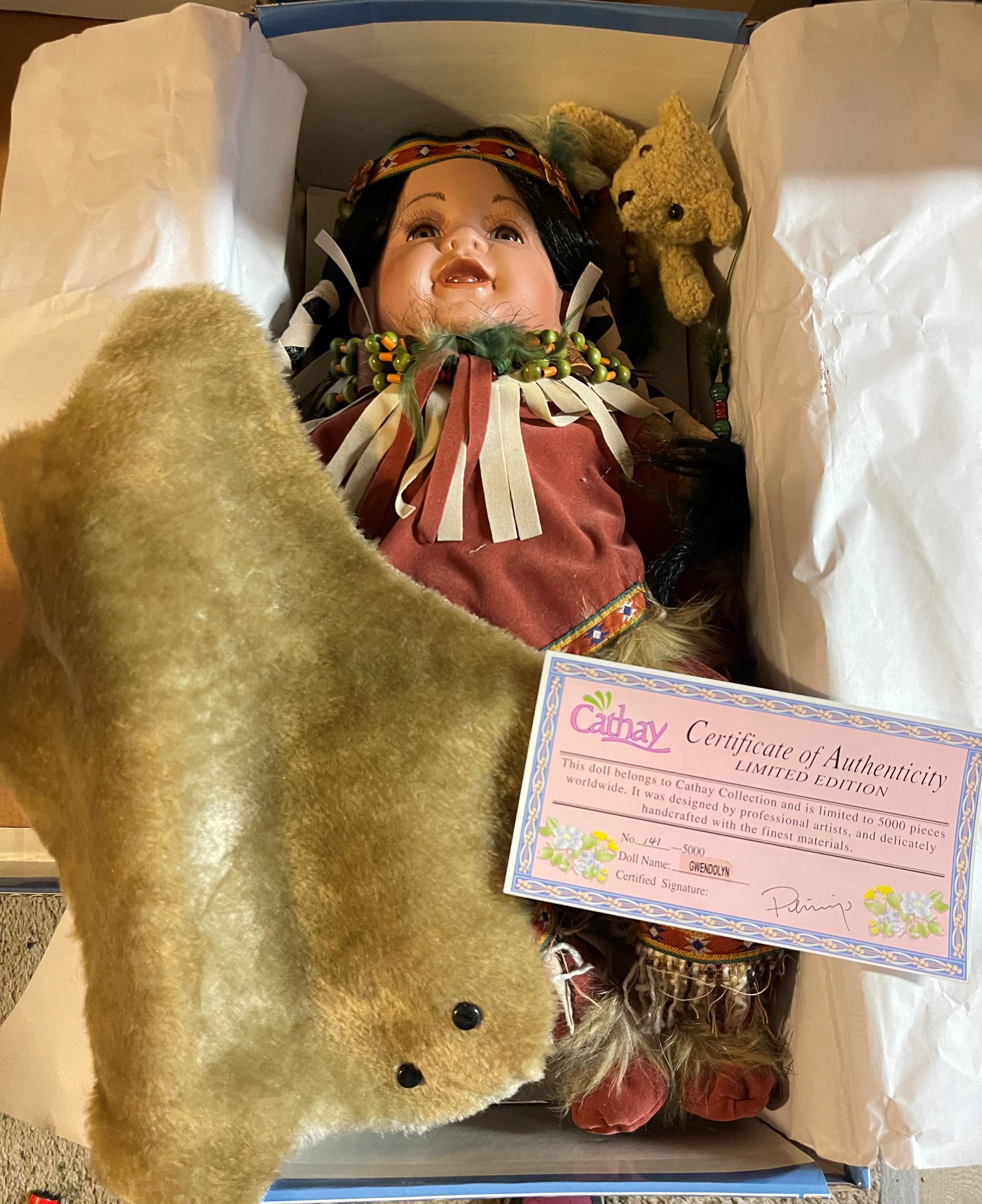 Limited Edition Cathay Collection Porcelain "Gwendolyn" Doll 141 of 5000 With Certificate of Authenticity. Mint condition in box, only been out of box for pictures to list for sale. Native doll, with rug and teddy bear. Approximately 19 inches long, 15 inches high in a sitting position.