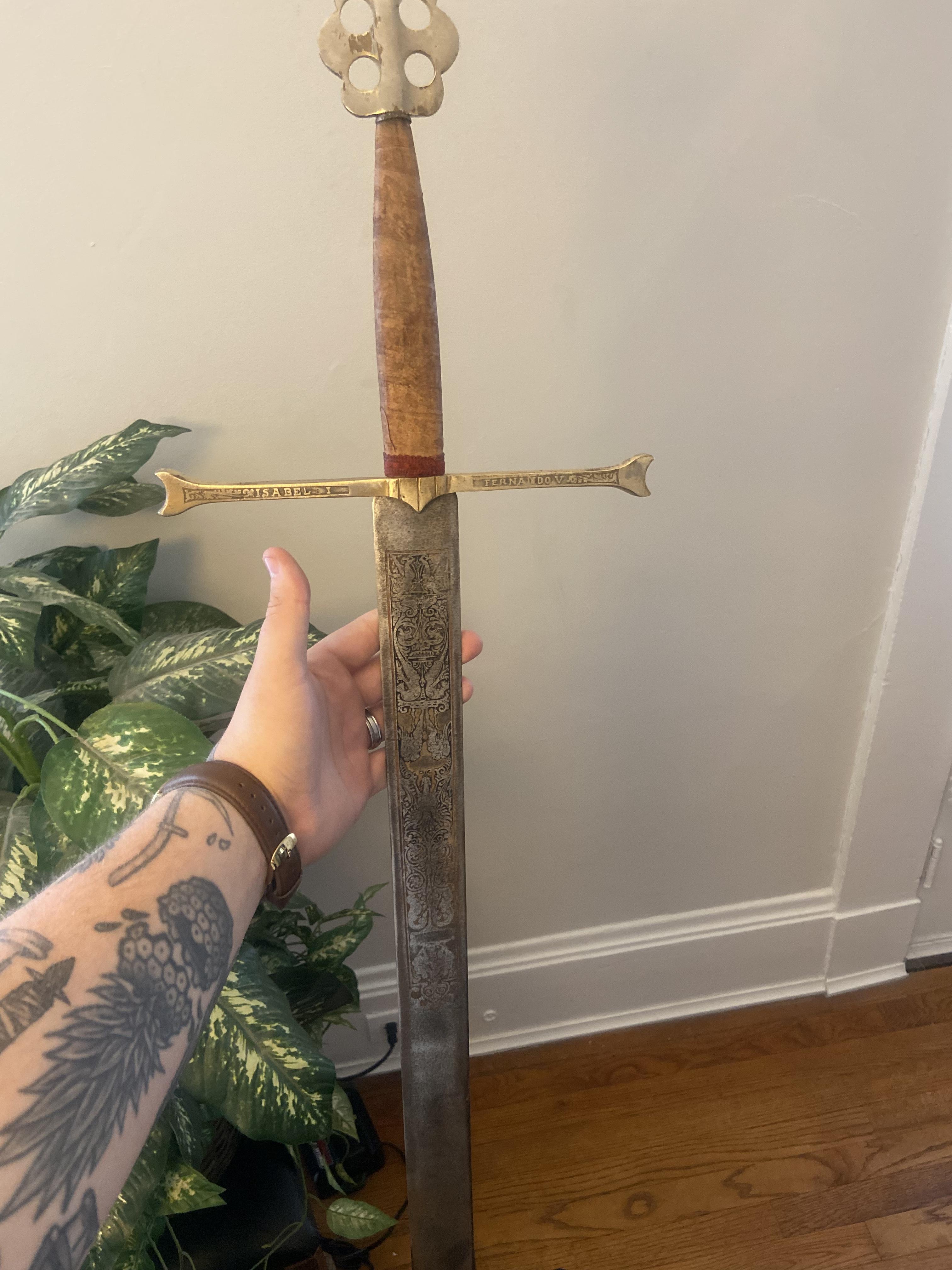I bought a sword at a flea market. When I researched I found that they made replicas of the Catholic ceremonial swords. But in my research those all have something else etched on the hilt. My sword has Isabel I Fernando V etched on mine and can’t find any other pictures on the internet of the sword ibhave