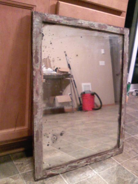 Has wood frame that seems to be as old as the glass mirror. Some weathering spots on the mirror but in great shape considering. Has Manufactured by C. C. Belknap Glass Co. Seattle USA Aug 25 1921 on the back of mirror. Has some good wieght to it considering its size. Makes me assume it has silver backing.