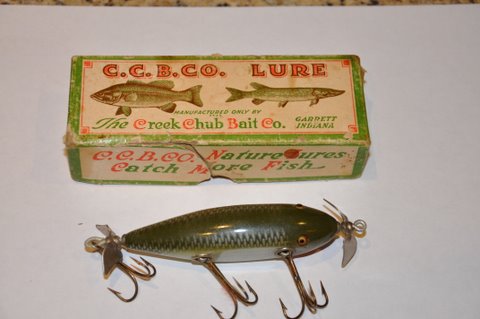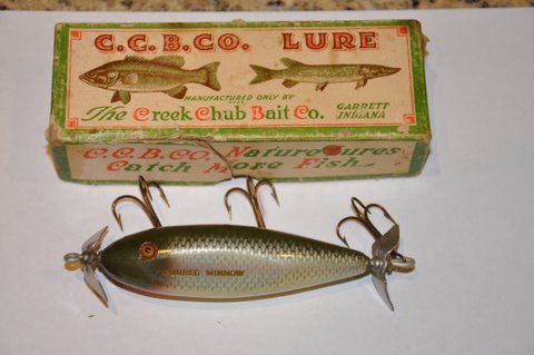 THIS BEAUTIFUL C.C.B.CO. LURE KNOWN AS INJURED MINNOW SILVER SHINNER NO 1503,IS IN EXCELLENT CONDITION.. A GORGEOUS OLIVE GREEN BODY AND SHINEY SILVERY PAINTED SCALES HAS IVORY COLORED BELLY AND CHERRY COLORED CHIN. EYES MADE OF GLASS THIS LITTLE MINNOW IS A SEA WORTHY GEM FOR FISHERS AND COLLECTORS ALIKE. AND DONT FORGET THIS ORIGINAL BOX IS THE ORIGINAL HOME FOR THE MINNOW. BOX IS AGED APPROPIRATLY,HAS TEAR ON ONE SIDE OF BOX. CLOSES NICLEY.