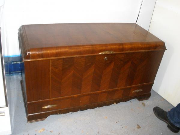 Cedar chests like this one in the " Waterfall style" ( named after the curving top) date from the 1930's through the end of WW2. They were produced in the millions and still survive in huge numbers. For this reason values are modest for them, most sell for under $150.00 at auction.