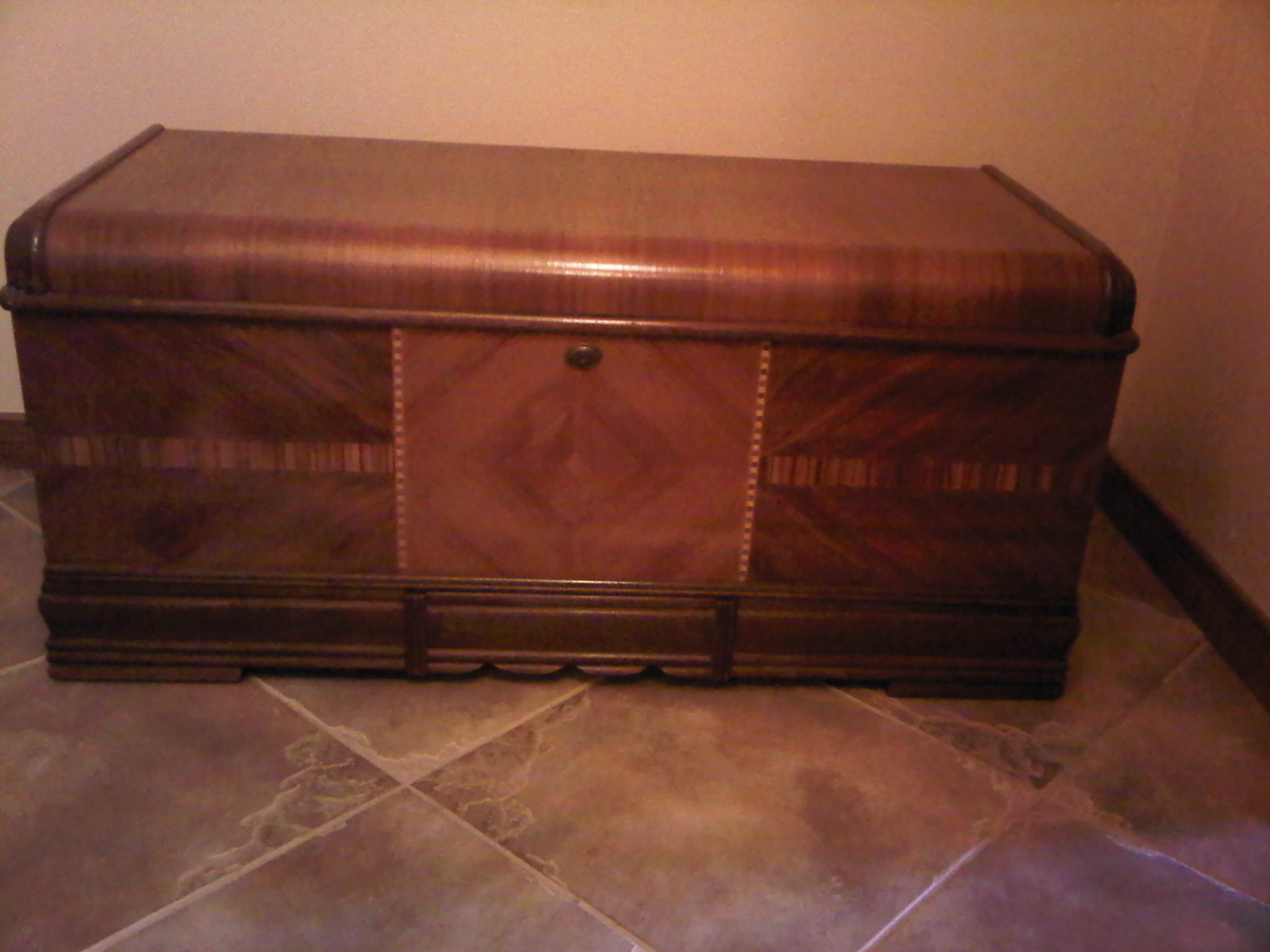 The exterior is fairly plain with some inlay work and a simple push button lock. The interior is all cedar with a drawer that is attached to the top by copper connections. There are no visible marks or company names on the chest.