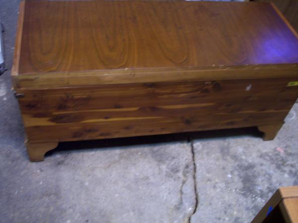 I would appreciate any information anyone can give as to the maker or year made. I can not find a maker's name on this cedar chest. There is a style number stamped on the bottom 3561 1703 and the word TRAY. The wood edge on the front and left side broke off but the pieces were saved and inside the chest. The chest has a turning lock which works but there is no key. Thank You.