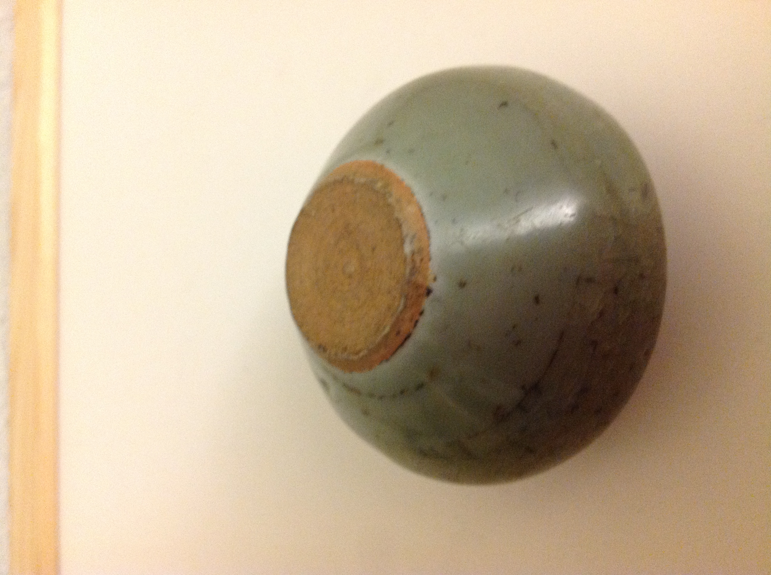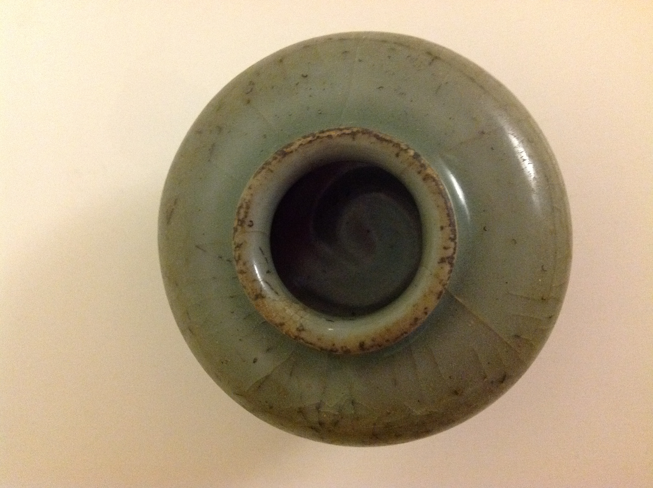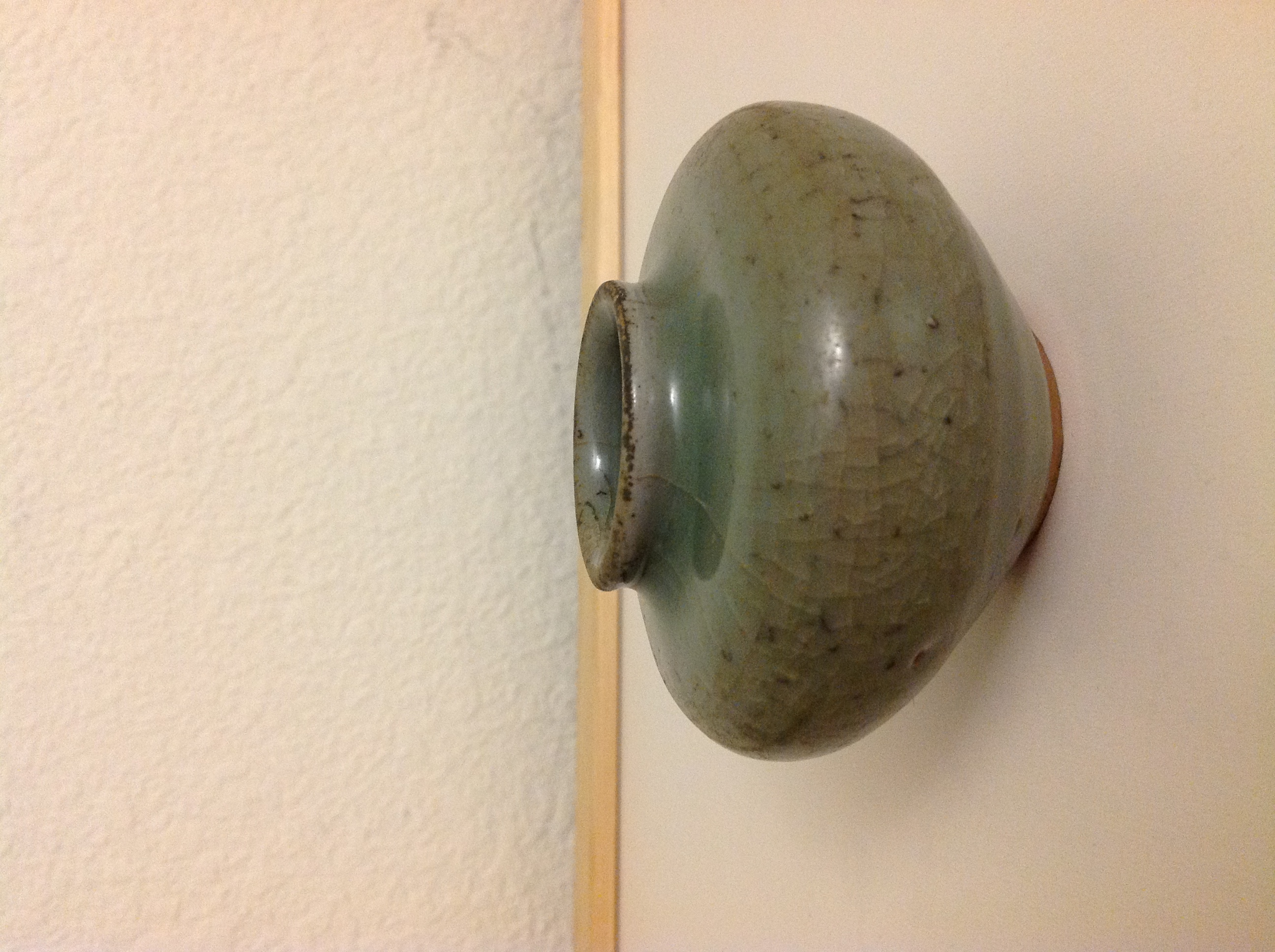 CELADON MINI JAR ABOUT approximately 3 inches across and in height. The finish is a little crackled, I did not want to polish it for fear it may damage the finish.