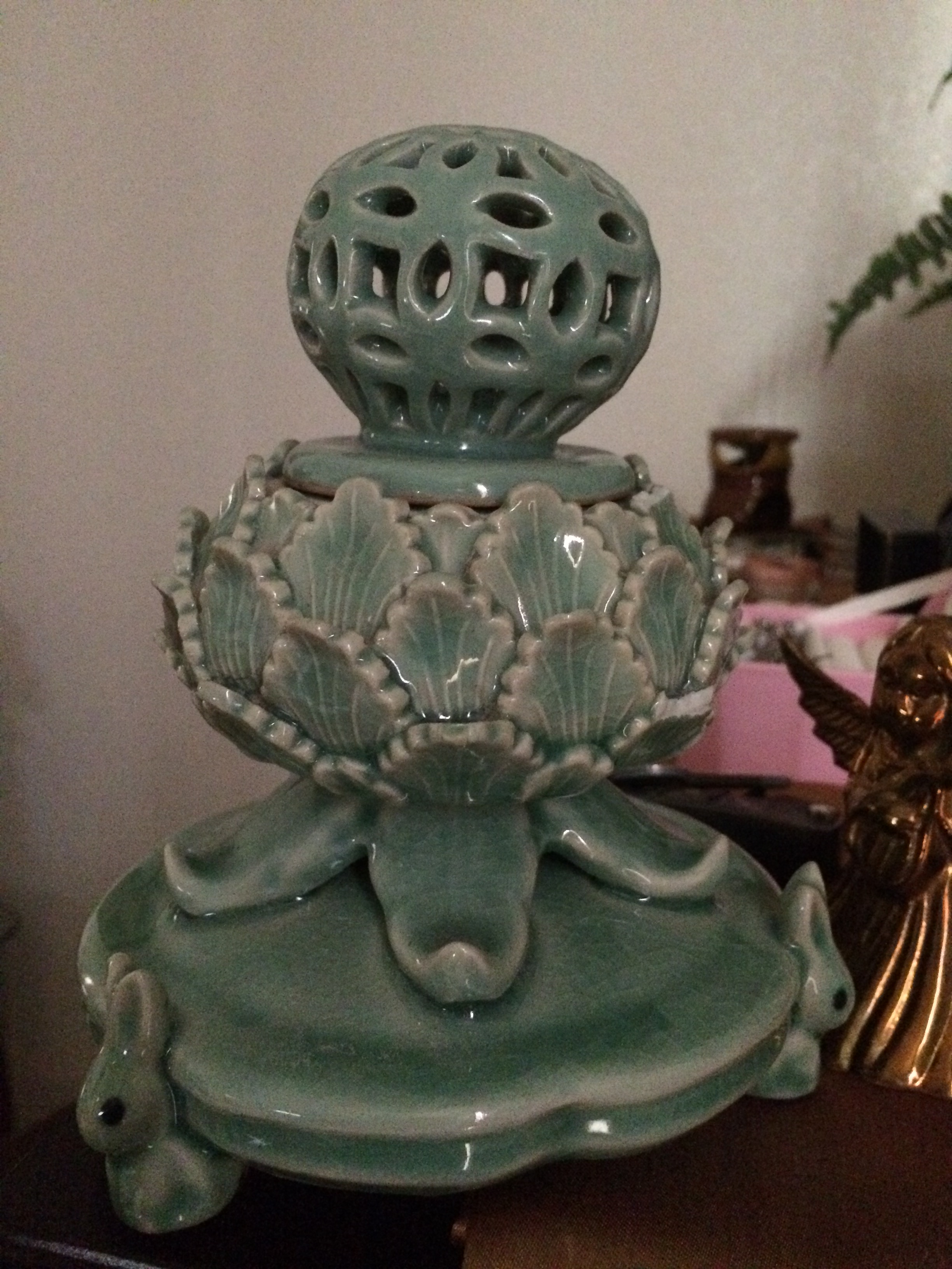 From what i could find this is a replica possibly created in 50's of a Korean Celadon open work inscence burner first made in 12th century. it is glazed porcelain from the Goreyo Dynasty. I know its a replica of the original that is in the Korean National museum of History but what I want to know is if it holds any value ? and what the mark on the bottom says ?