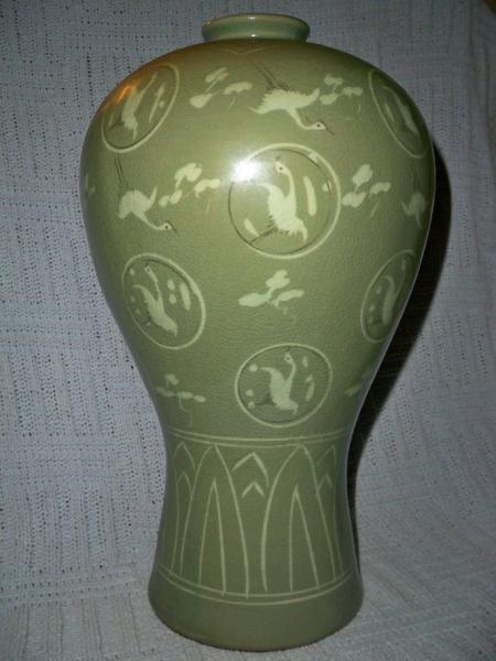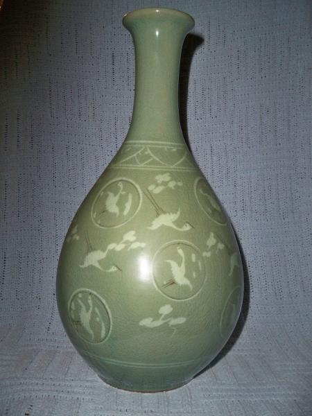 These two pieces are celadon and are quite beautiful.  I have found some information on them and know that the one that is the fullest on top is called a prunus vase.  They bothe have pictures of cranes and clouds.