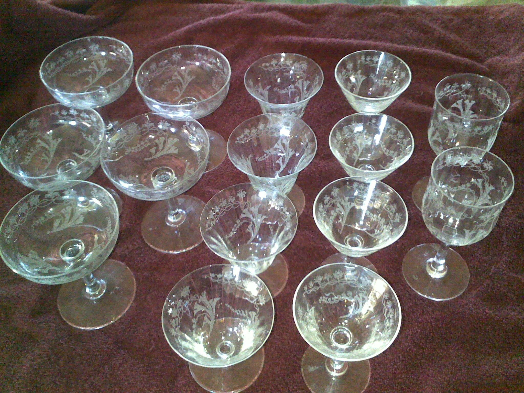 14 piece set, Floral Trumpet Etch 22, excellent condition. Small chip on edge of one piece.