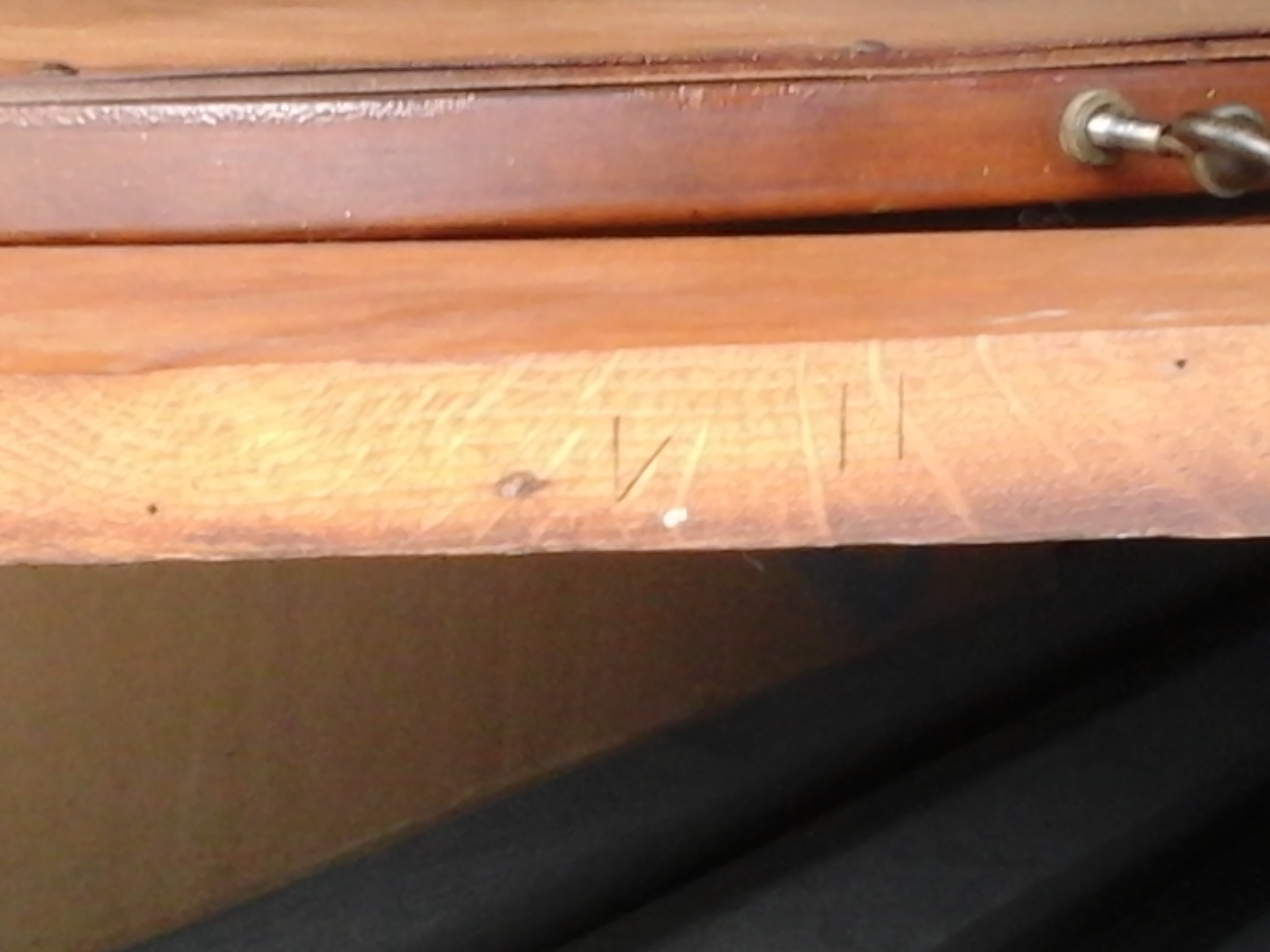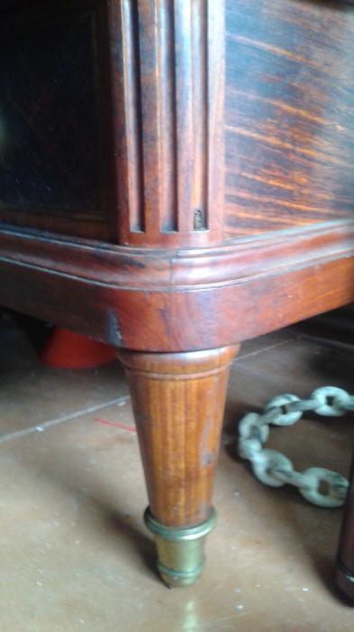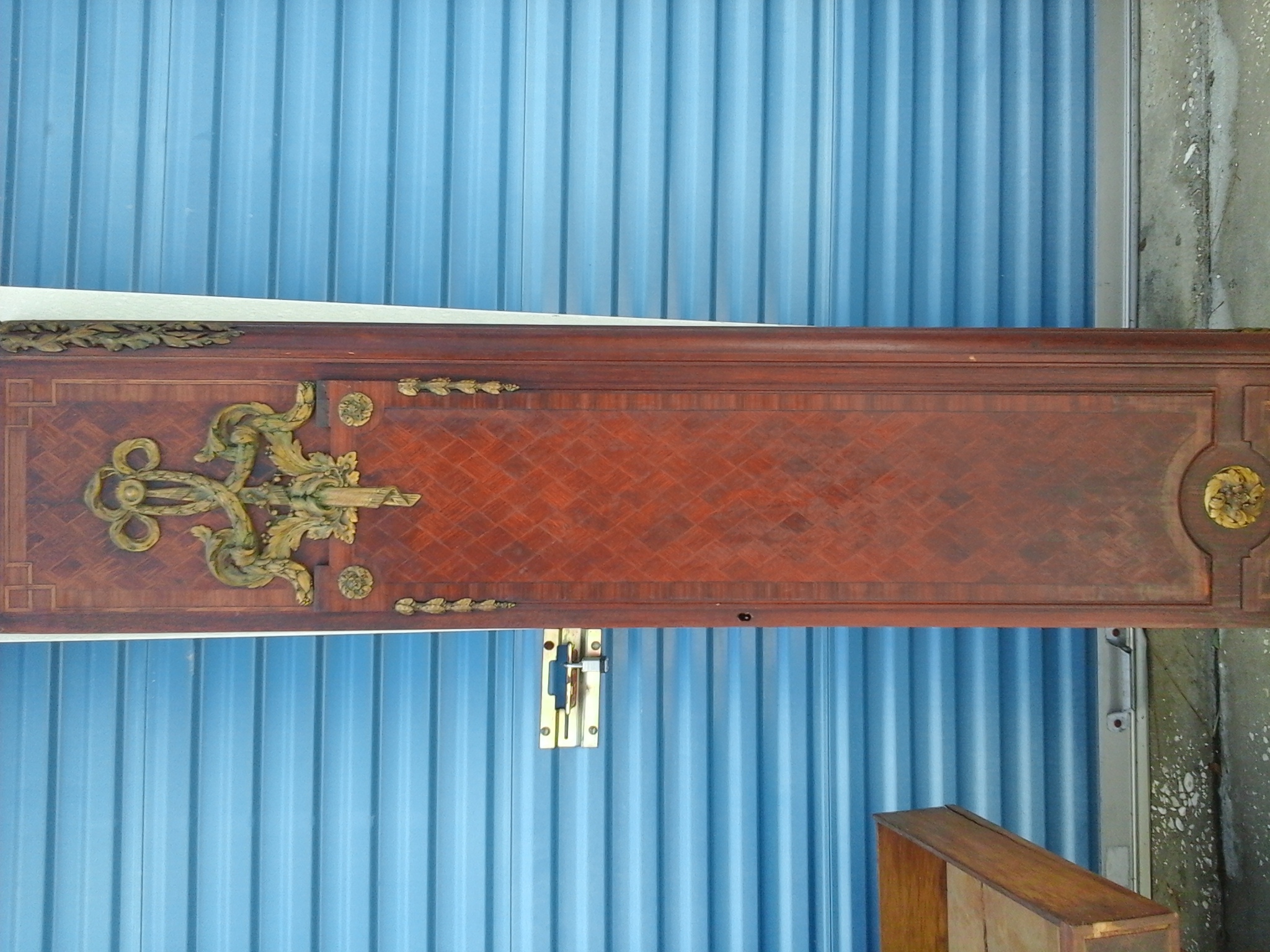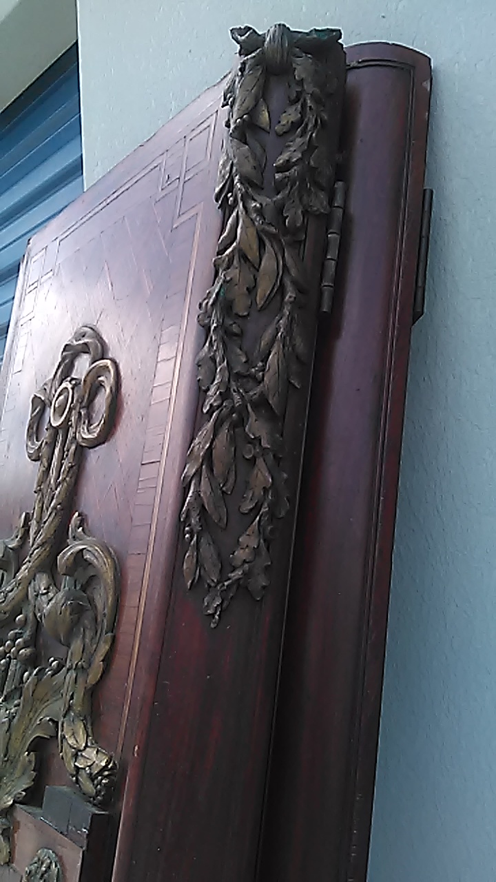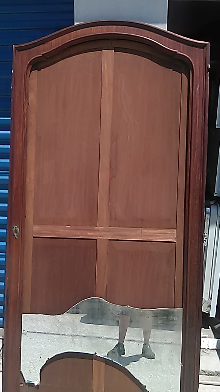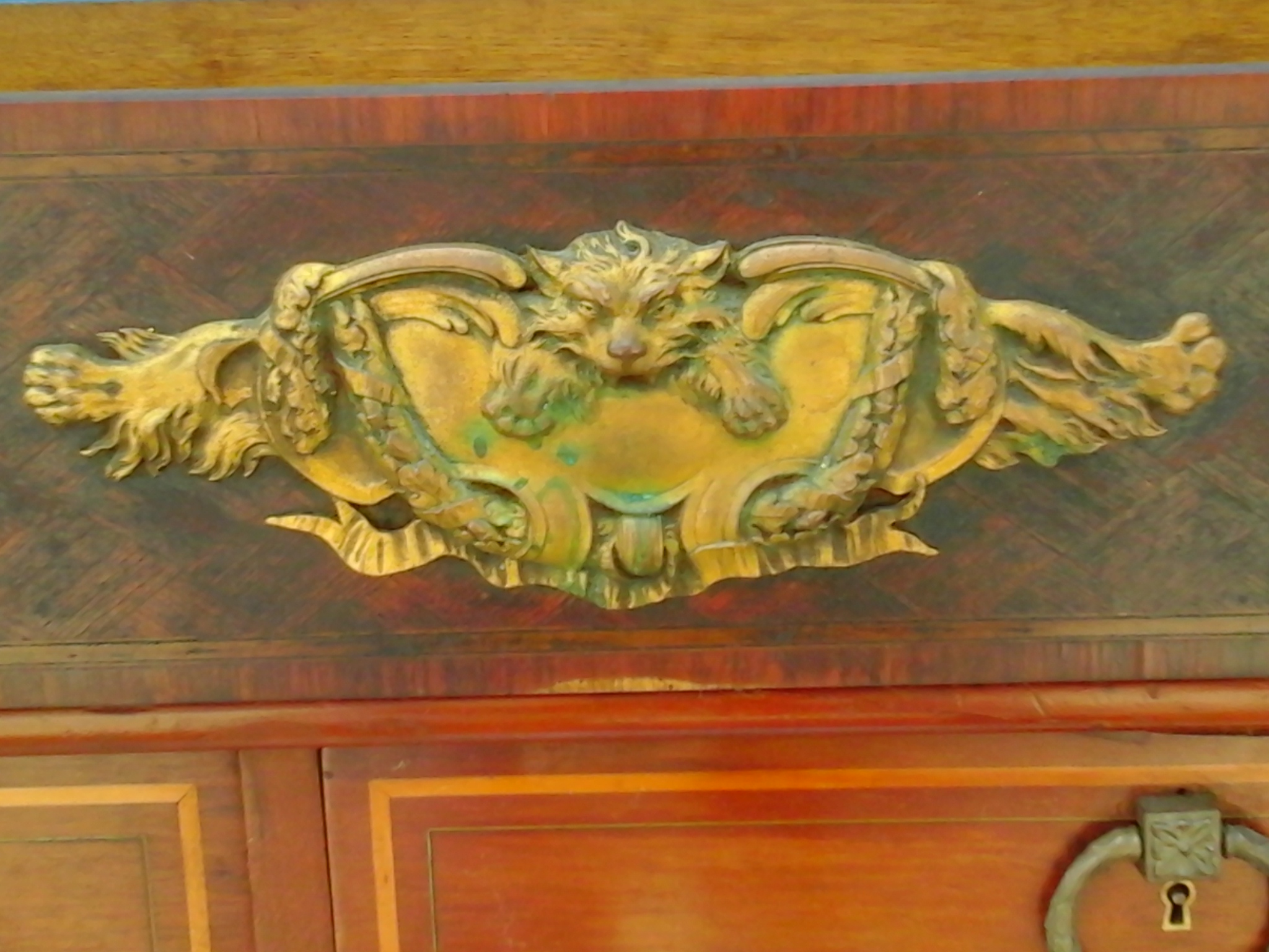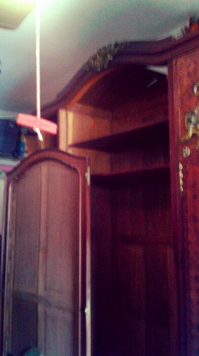 This wardrobe took three grown men to move because its just so large and so heavy, because of this unfortunatly we had to take it some what apart in order for it to fit into our storage unit. and of course i didnt think to grab the camera until afterwards, so that is why its not all together in the photos. The piece consists of 3 closet doors and four drawers at the bottom. The two slimmer doors go on each ot the ends and both have a mirror on the inside that is the length of the door itself. The large door in the middle has a full length mirror facing outwards however was broken when we acquired it. That is the only thing wrong with this piece of furniture. We were going to have it replaced but decided against it because we just werent sure how to go about it. The drawers have the beast/wolf like critter on them holding the handle, which are all made of bronze. It has alot of floral type patterns (all in bronze) that are actually all over. Its very embelleshed at the peak on top of the wardrobe, some on the bottom, and even some sort of ivy looking design that comes down the sides of the doors. There is pretty inlay on the drawers, and in random inconspicuous spost there is a "V11" carved into the wood. and this is all over the wardrobe. The hinges have a symbol on them as well. It looks to be an arrow (from a bow & arrow) with two tiny c's facing each other at the end of the arrow. There are also letters of some sort that my husband nor I can make out. but they are to the left of the arrow it seems.To me it looks like maybe PAHT-EorA?? Im not sure of that at all. Please excuse my ignorance in trying to explain this. I hope that i was able to give you some what of an ida of what it looks like, and that the pictures are useful. If you have any more questions I will be happy to answer them. Again thank you for your time and thank you for edgucating me on this gorgeous piece of furniture! Anxious and looking forward to hearing from you!