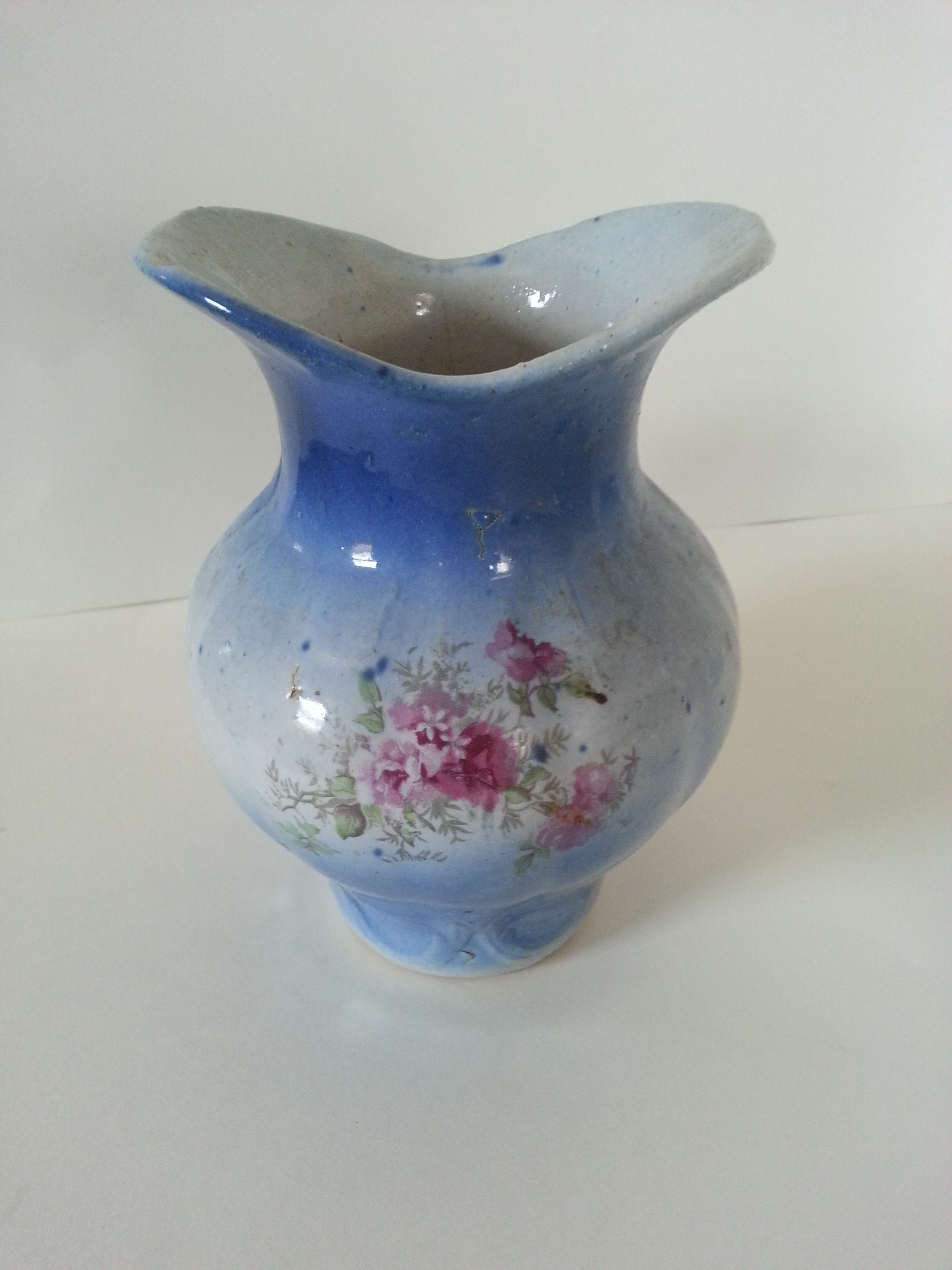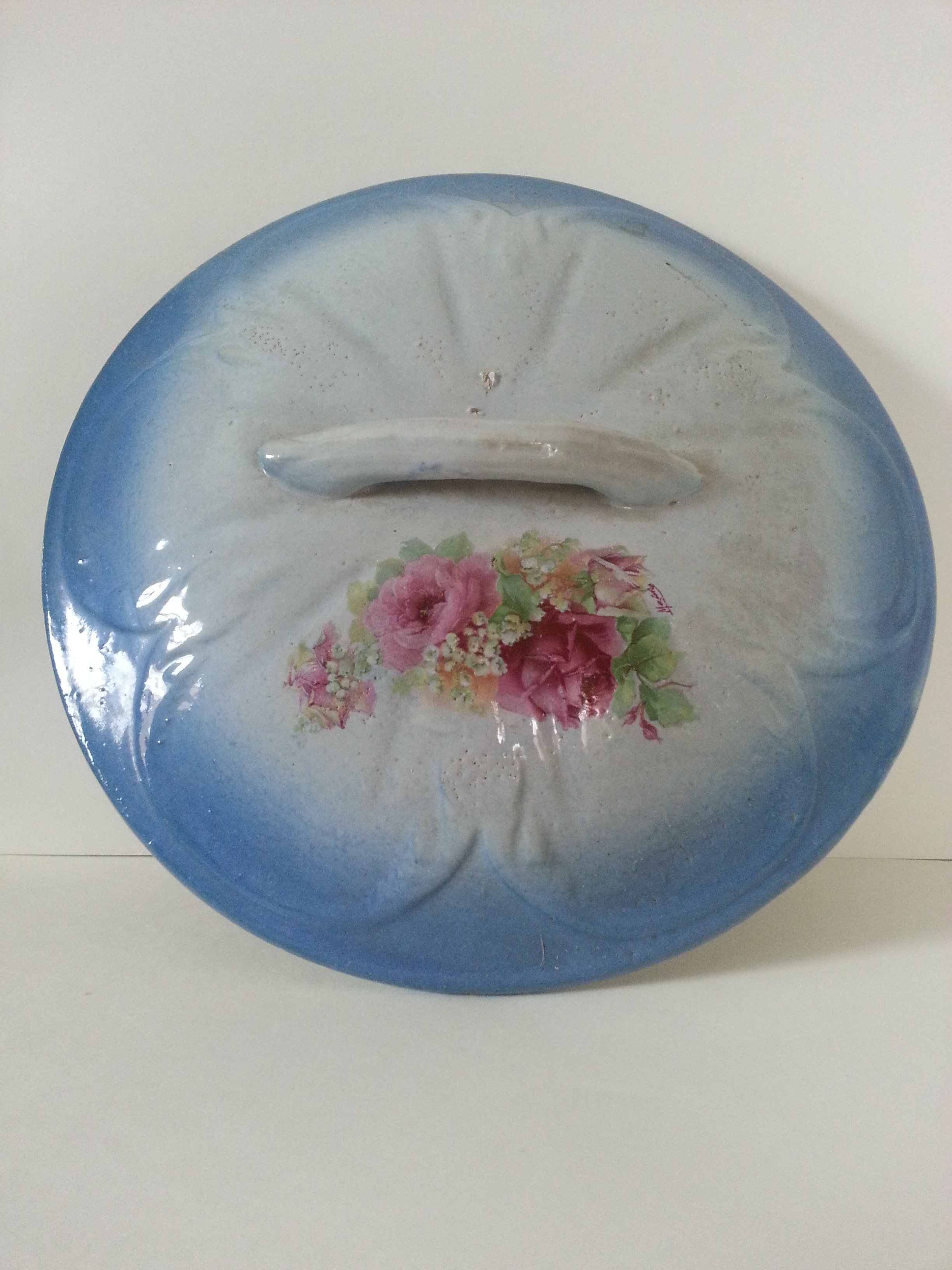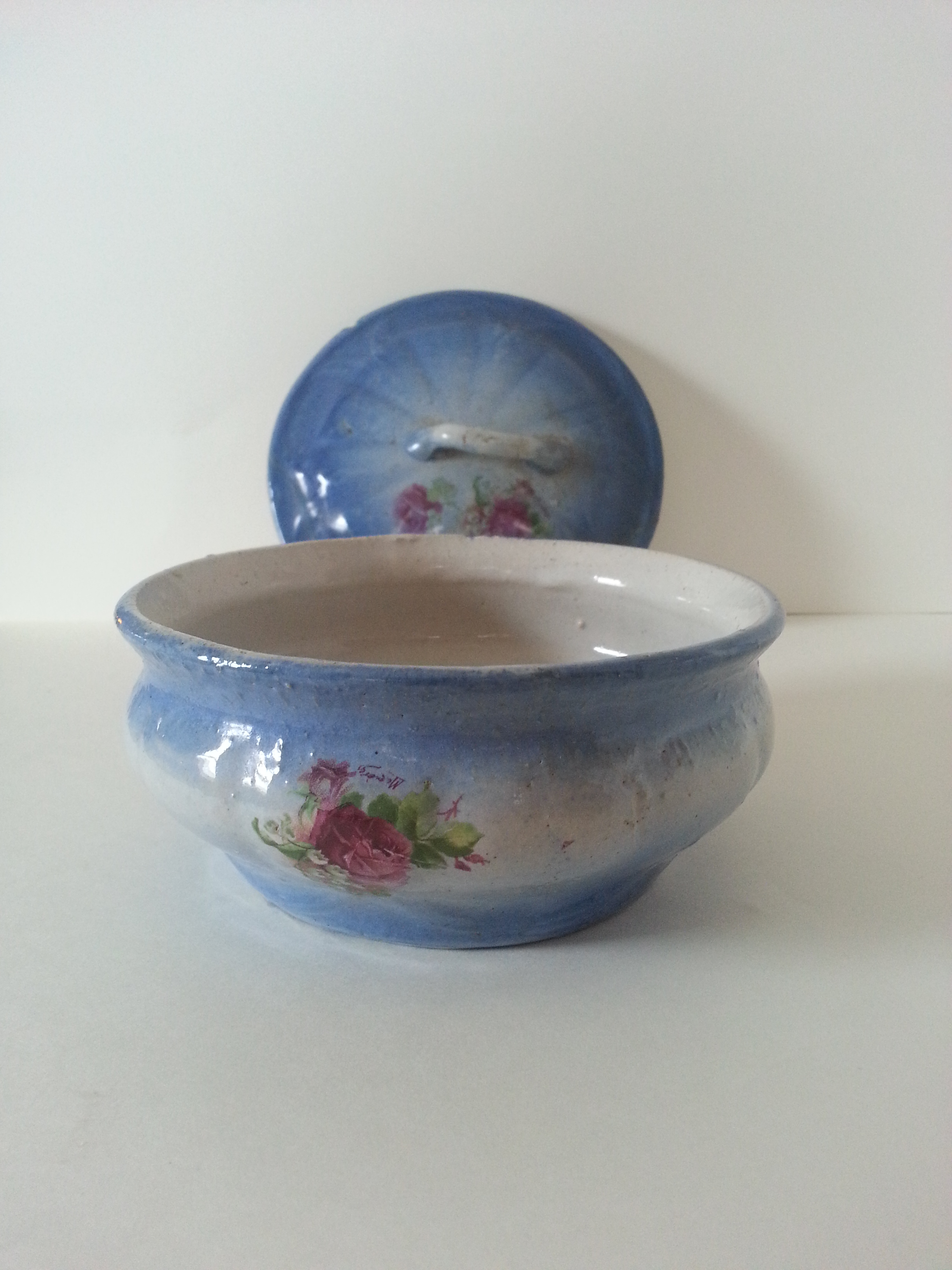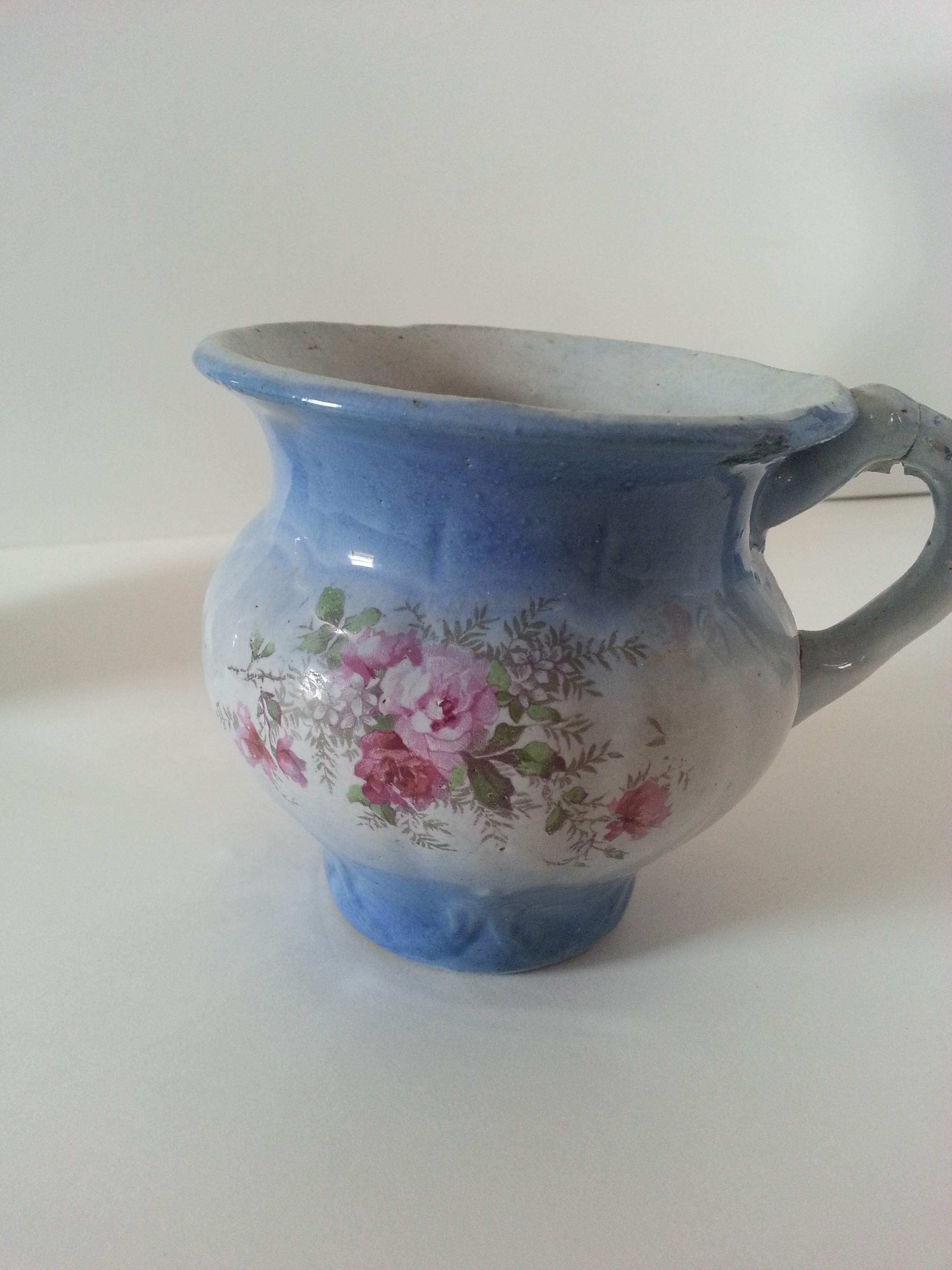 Pitcher, Basin, Large Bowl with 1 handle and lid, Small Bowl with lid, small pitcher, vase?, small bowl with handle.  All pieces are Blue on the Bottom, White in the middle, blue on top with roses painted on each piece.
