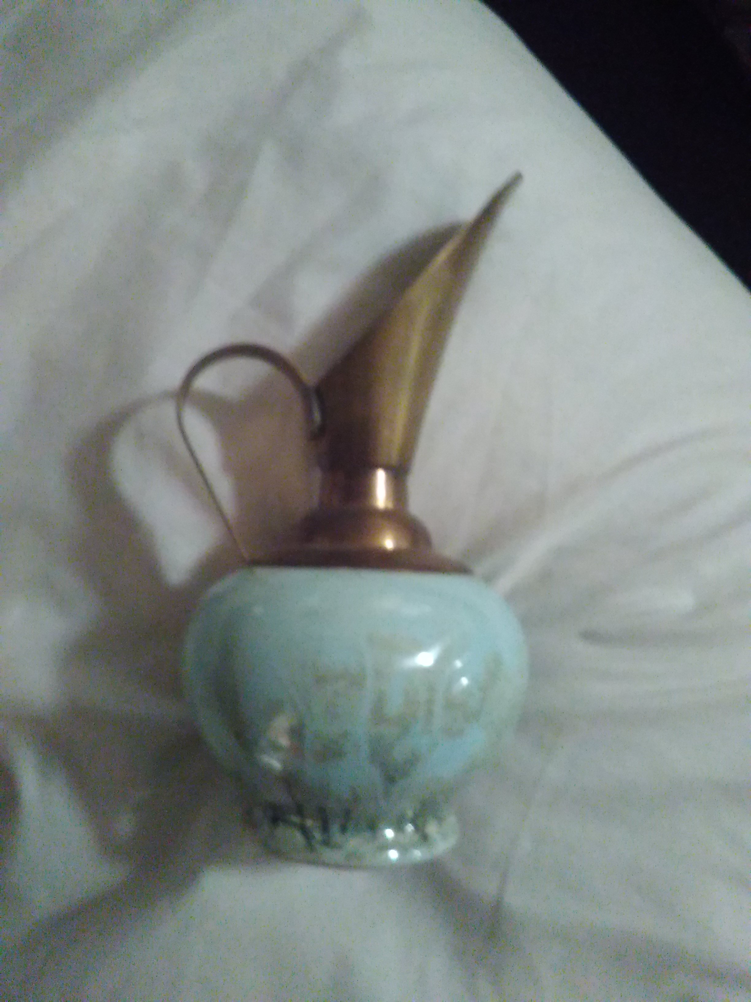 Light green ceramic pitcher with brass spout and handle. Stands 5.5 inches tall. Made in Holland.