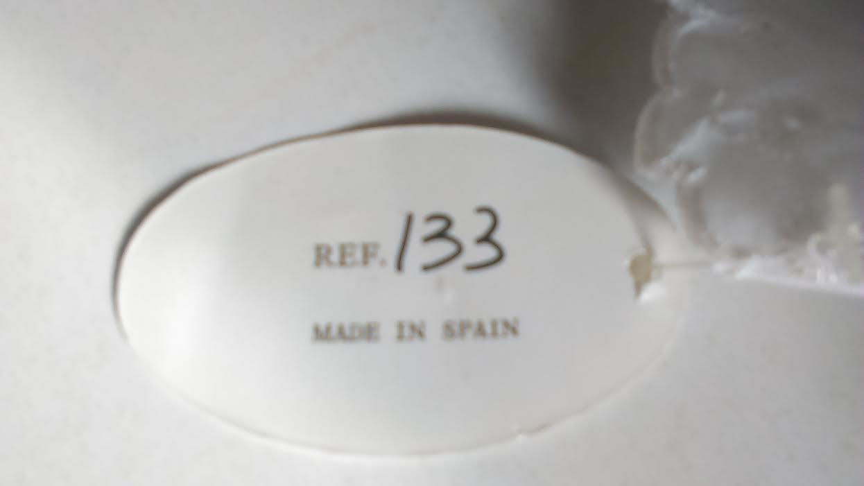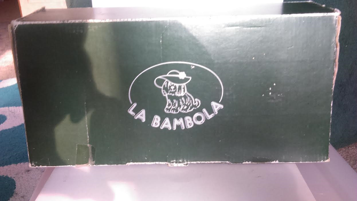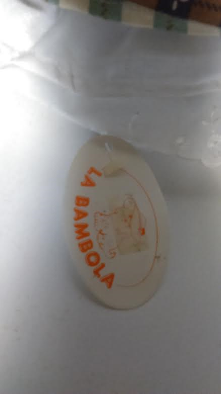 Attached to the dress is a tage that reads "La Bambola" with a logo a dog wearing a bonnet. On the reverse of the tag, reads "REF 133 Made In Spain". The doll came in a green box with the same name "La Bambola" and same logo of the dog wearing the bonnet.