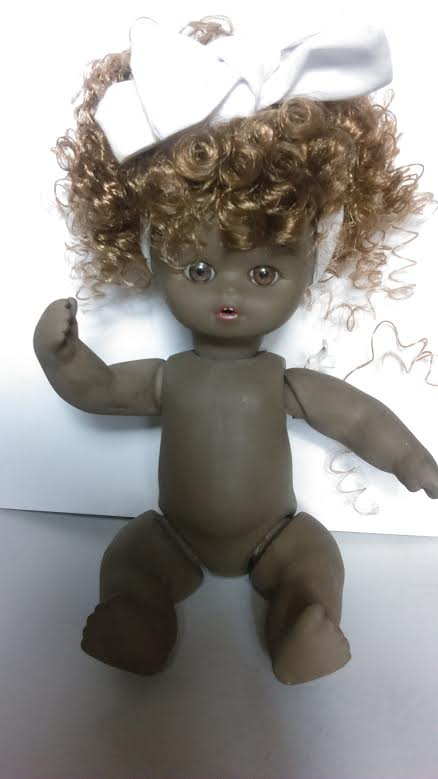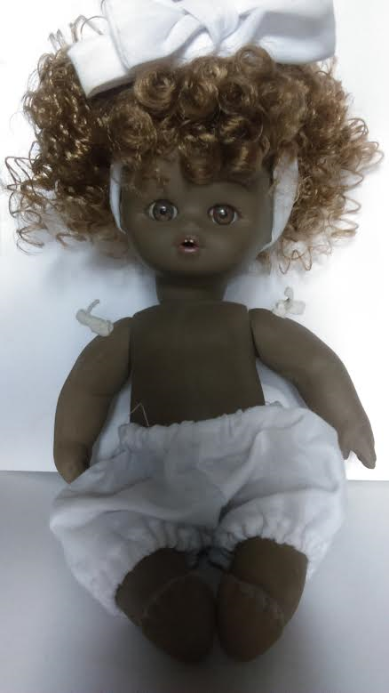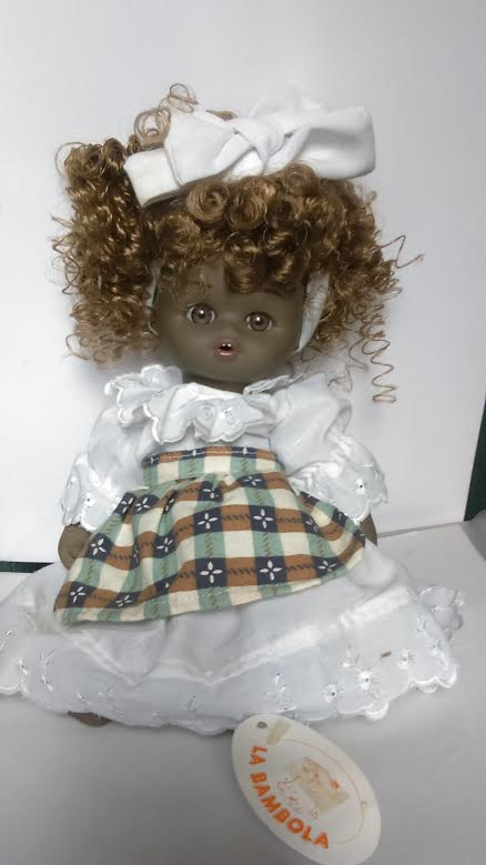 Ceramic Black Doll from Spain. Doll has ceramic head, arms, body and legs held together by elastic rope. She has reddish brown hair glued to her head with brown glass eyes and a carved mouth. She is wearing a white headband (a little dingy, but can be removed and washed), a white dress, white bloomers underneath and a checkered apron.