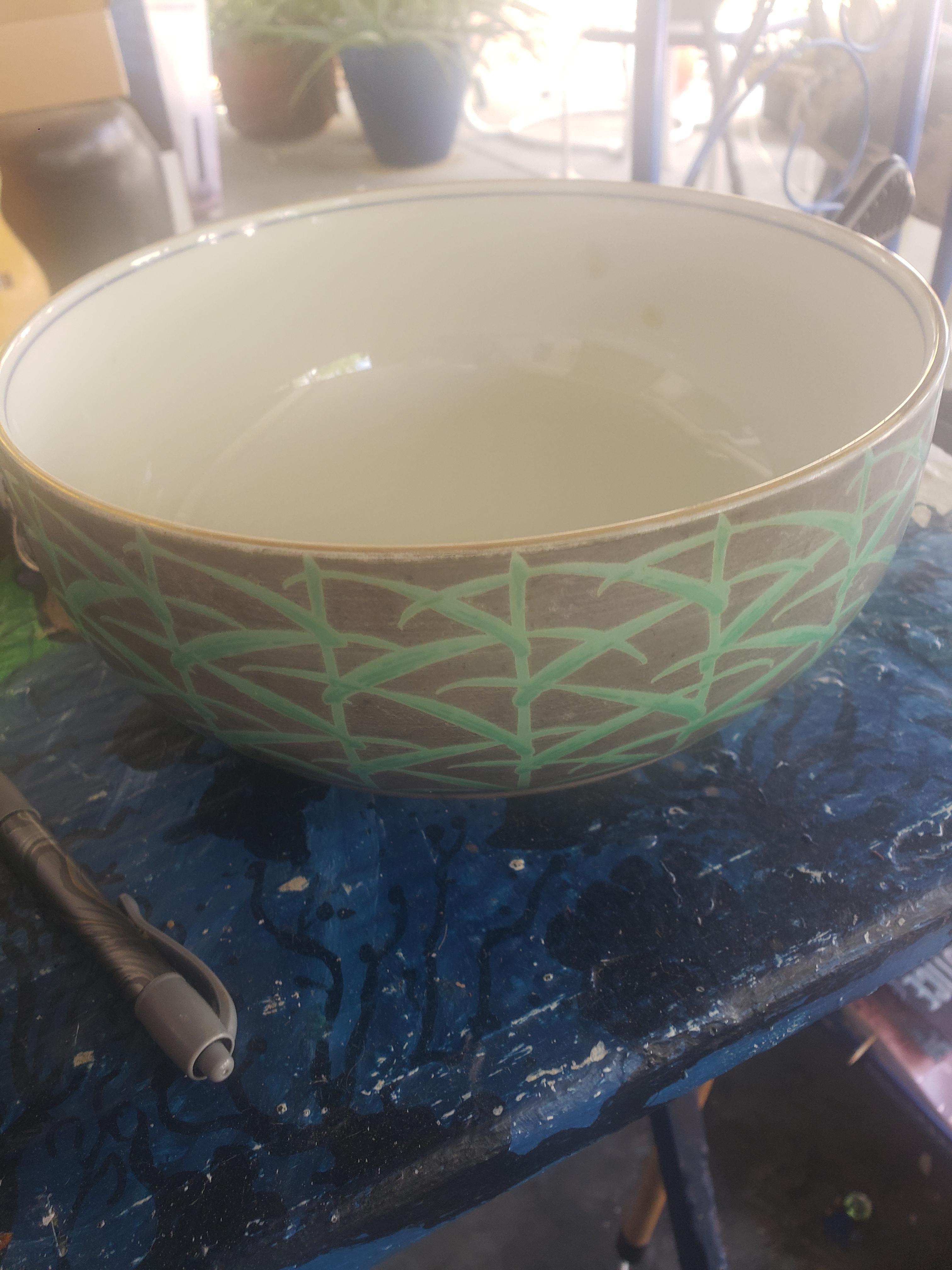 Gold trim Ceramic bowl with gold in print on the bottom in Japanese or another Asian language